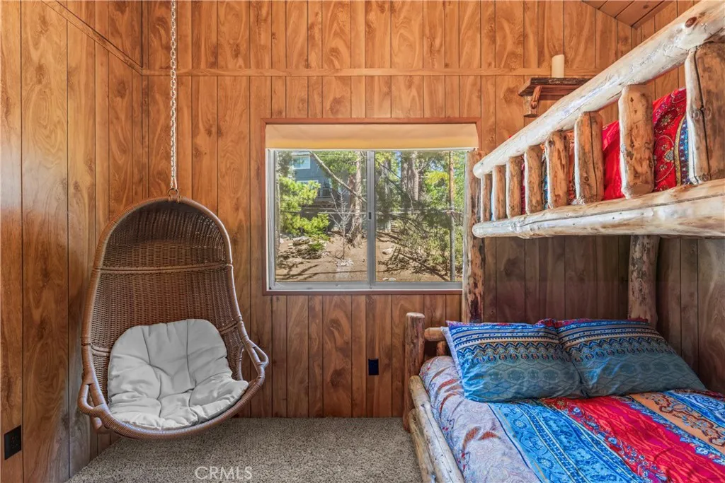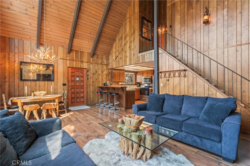 Terrific Mountain Chalet with Lake Rights! Located on a quiet, tree-lined street in a sought-after neighborhood, this beautifully maintained A-frame mountain home blends timeless character with modern comforts. Set on nearly a quarter-acre lot with mostly usable space and a gentle slope, the property offers ample outdoor area for entertaining, relaxing, and enjoying all four seasons. A level covered entry opens to a spacious interior with vaulted open-beam ceilings, hardwood flooring, and a dramatic wall of glass that invites natural light and scenic forest views. The open-concept layout features a living area with a romantic fireplace, flowing seamlessly into the dining space and kitchen. The kitchen is outfitted with white tile countertops, a breakfast bar, and generous cabinet space. From the main living area, step out onto a newly rebuilt, oversized deckideal for outdoor dining, lounging, and taking in the mountain air. The exterior space also includes a custom Twister Slide, adding a fun and unique touch. The main level includes a bedroom and full bath, while upstairs offers two additional well-sized bedrooms and a second full bath. Recent updates including newer carpet upstairs, complementing the original wood paneling throughout the home for a warm, inviting atmosphere. Additional highlights include four on-site parking spaces and a location on a main plowed road, ensuring easy year-round access. Just minutes from the lake and the Village, this property is offered fully furnished, including all appliances, washer and dryer, new furniture, and decorative piecesmaking