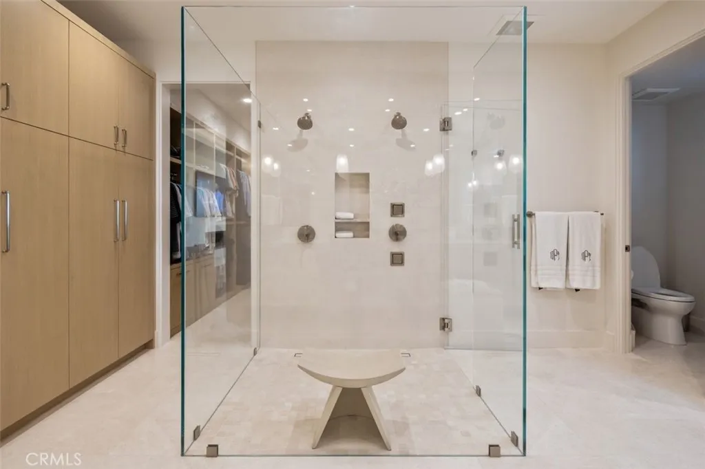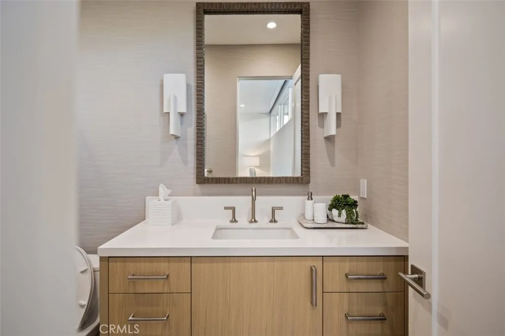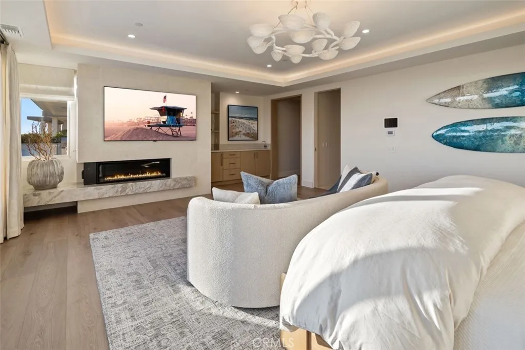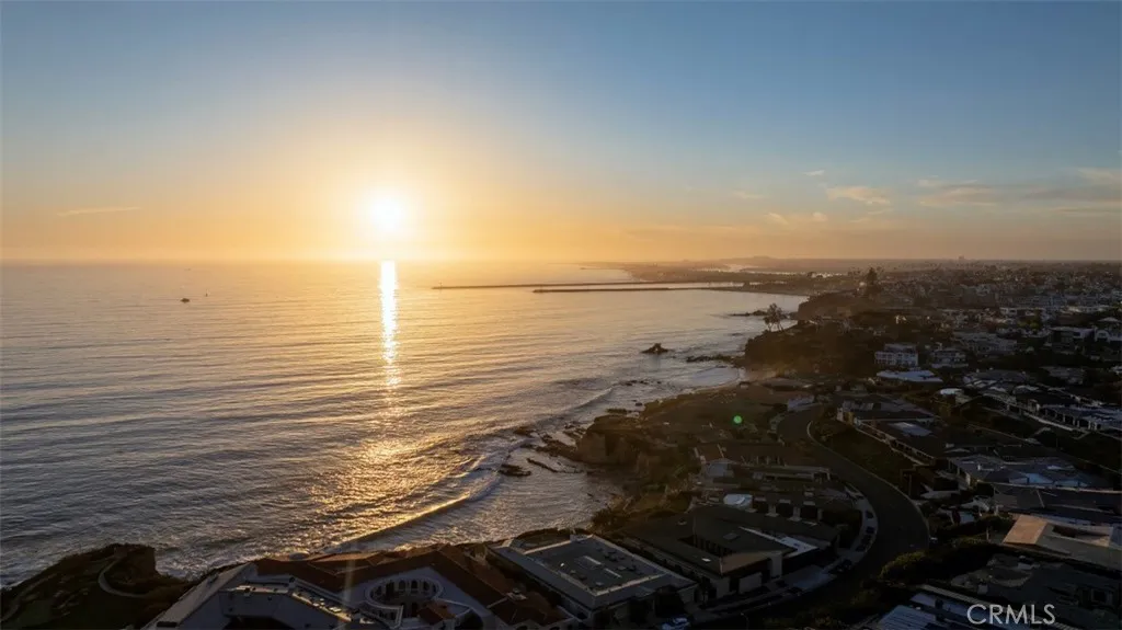 Set in Corona Del Mars most prestigious oceanfront community, this brand-new single-level home in Cameo Shores captures the very essence of refined coastal living and high-end design. Conceived by architect Mark Teale, constructed by Nicholson Companies, and finished with the refined eye of Bliss Home Design, every detail of this warm contemporary residence reflects elevated craftsmanship and comfort. Upon arrival, one is welcomed by a calming water wall, a prelude to the natural flow and serenity showcased throughout the home. Enter through a grand wood pivot door into an airy layout highlighted by wide-plank white oak floors, custom natural stone finishes, and thoughtfully placed skylights that fill the home with soft natural light. Every corner invites an emotional connection, none more compelling than the expansive great room, which blurs the line between indoor and outdoor living with pocketing glass walls that frame priceless vistas of the Pacific Ocean and Catalina Island beyond. The main living space includes a sleek entertainment area featuring dual temperature-controlled wine walls and a bespoke bar, leading to a chef-caliber kitchen with Wolf and Sub-Zero appliances, Miele coffee system, and a striking two-toned island finished in Taj Mahal quartzite beneath custom ceramic pendants. Set around a stunning sculptural chandelier, the formal dining area is ready for elevated entertaining. Privacy and comfort define the homes four en-suite bedrooms, including a luxurious primary suite with a fireplace, wet bar, spa-like bath with dual walk-in shower, soaking tub, dual