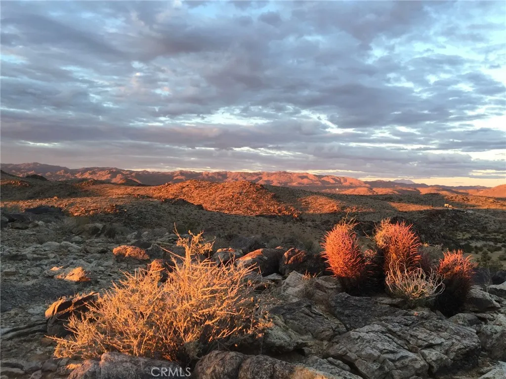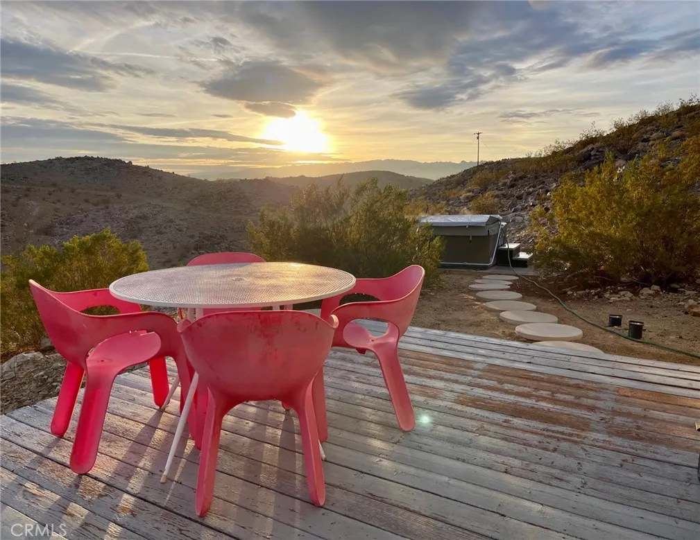 ***RARE MOUNTAIN-TOP GETAWAY*** Perched on a peak in the Bunker Mountains, this homestead cabin was converted to a single-family residence and reimagined with sensible design and touches of flair. It is only a few minutes to downtown Joshua Tree and has been a very successful vacation rental for years. It would also make an amazing private getaway home. The 5-acre site is at the top of a mountain with hiking all around the site. Mountain top property is extremely rare in Joshua Tree, as most of the mountains are government owned. The interior features an open floor plan with a sleeping nook, a sitting area, a modern kitchen with a vintage stove, and a large dining or work table. Huge widows on all sides capture forever views in every direction, including sun and moon rises over Copper Mountain. The exterior patios offer sun or shade with hand-made rock walls, planters and pathways that lead to separate lounging areas, all with amazing views. A pathway of round stepping stones leads to the hot tub. Sitting in the hot tub makes you feel like youre floating in the sky. This home is truly special!
