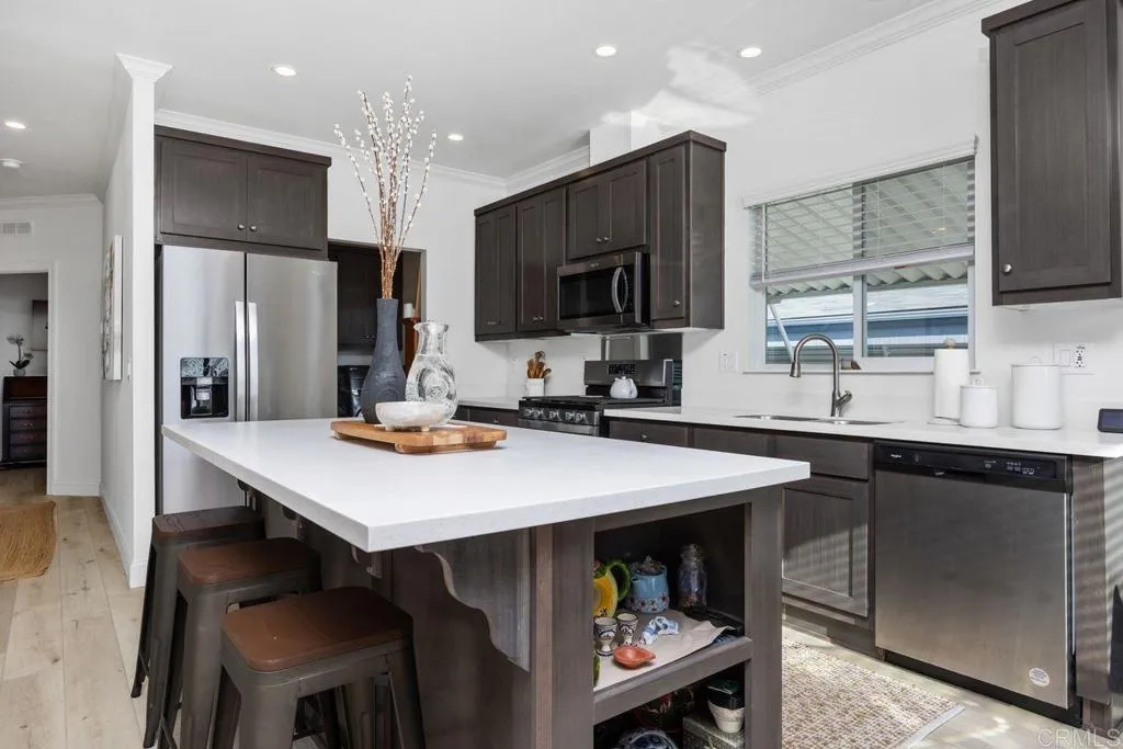 If you've been searching for a single level manufactured home that feels more like a detached house-your search ends here. This home is only a couple of years old, this home is a true gem that you'll have to see to believe. The moment you step inside, you'll fall in love with the wide-plank, luxury vinyl bleached oak flooring, that flows seamlessly throughout. Paired with the warm, rich-toned cabinetry, the designer finishes create a space that feels both stylish and welcoming.The heart of the home is the spacious kitchen, featuring a large center island with quartz countertops, a walk-in pantry, and a designated dining area perfect for everyday living and entertaining,.The open concept layout and expansive windows bathe the space in natural light, giving the entire home an airy, uplifting feeling. Down the wide hallway, you'll find 3 generously sized bedrooms and 2 beautiful appointed bathrooms. The primary suite is truly a retreat, with dual -sink vanity, walk-in shower, and a large walk in closet that offers both comfort and convenience. Step outside and take in the Mountain views and the refreshing ocean breeze from your from patio- a perfect place to start or end your day. the covered carport provides both privacy wall and a handy storage shed, while the lush, low maintenance landscaping keeps everything beautiful with minimal effort.This home ins't just move in ready-its ready to be yours. Community is gated. Stroll around the tranquil lake, splash in the community pool and gather with the neighborhood friends. You will enjoy every part of this community.