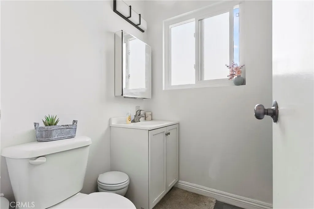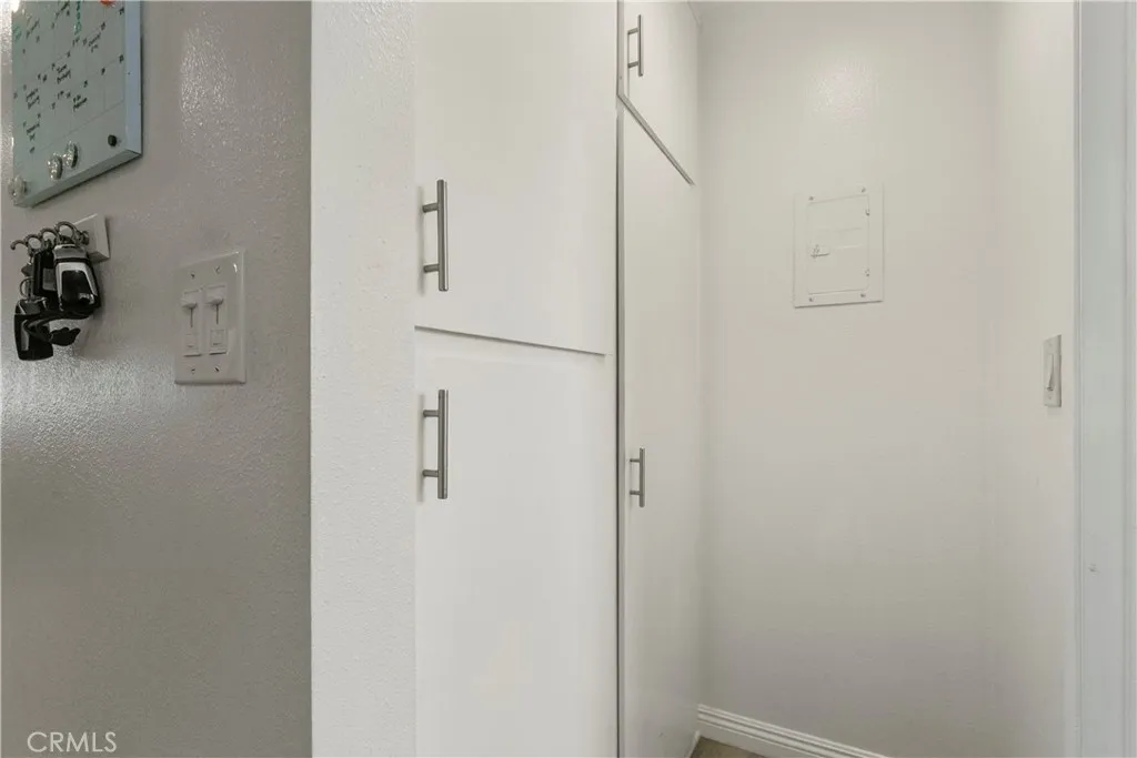Walk into this open floorplan updated condo, complete with newer laminate flooring, newer bathrooms, dual pane windows, blinds, Wall unite A/C and upgraded nice sized kitchen. Open floorplan downstairs boasts a breakfast bar, abundant storage, and recessed lighting. Beautiful kitchen has granite countertops, stone marble backsplash, wood cabinets and Frigidaire Gallery dishwasher and stove. Spacious bedrooms boast roomy closets, with primary bedroom containing additional walk-in closet. Located on the East side of the complex, this unit is tucked in the back of the complex. So private and cozy and is well-positioned for sunlight and shade, with one covered assigned parking space and storage. Unit is near pool and community laundry room. Close to freeways, parks, Whittier Greenway trail and shopping. This part of Pioneer Blvd is more residential and not as busy! HOA covers trash and water. Come see it for yourself!