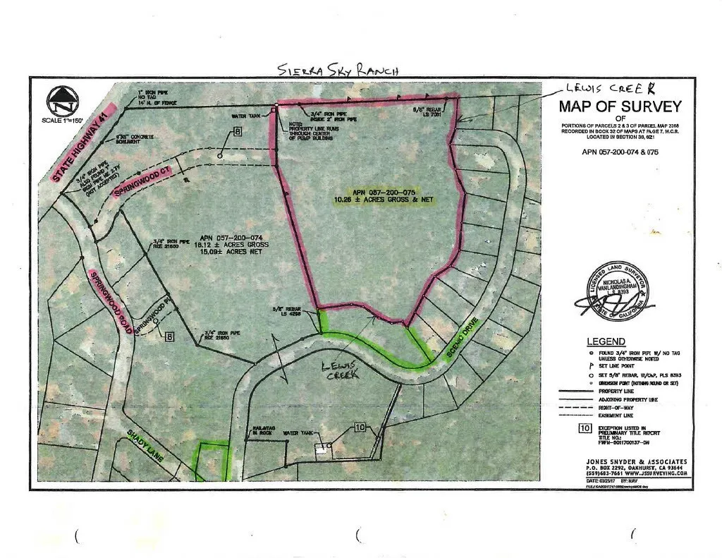 Dream home or development opportunity. Over 1650 feet of Lewis creek frontage. Truly a unique find north of Oakhurst. The location provides easy access to Yosemite, the Mariposa Grove of Giant Sequoias, and Bass Lake. Along the creek you'll find swimming and wading holes, waterfalls, granite outcroppings, wildflowers, singing birds, lounging nooks, and tranquility. Lewis creek runs year round so you'll always hear the peaceful reminder of the creek. Zoned RMS, minimum lots size of one acre. Madera County code specifies the following as permitted: Single family dwelling, Guest house, Accessory living structure, Accessory dwelling unit or mobile home, Agricultural, Forestry, Residential care facilities 6 or fewer persons, Private stables. The following are listed as requiring a conditional use permit: Mobile home parks, travel trailer park or tent camp, Bed and breakfast establishment 13 guest rooms, Cemeteries, Mausoleums, Crematories, Churches and Places of Religious Assembly, Public stables, Residential care facilities 7 or more persons. The 10.26 acres was recently cleared of understory shrubs and brush and other ladder fuels further protecting it from potential fire danger.