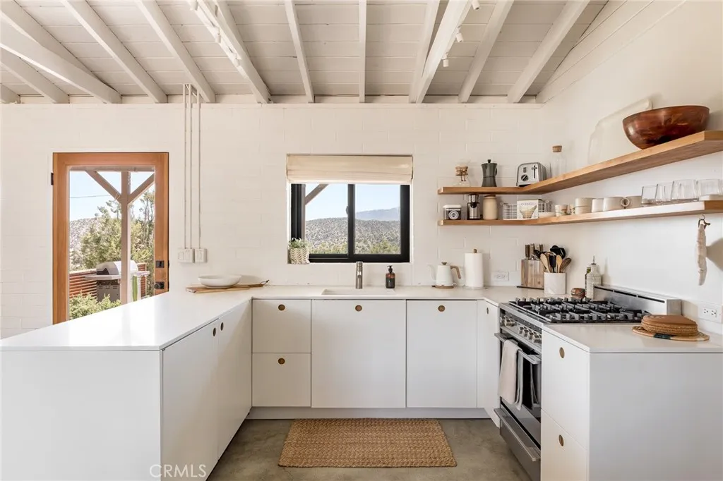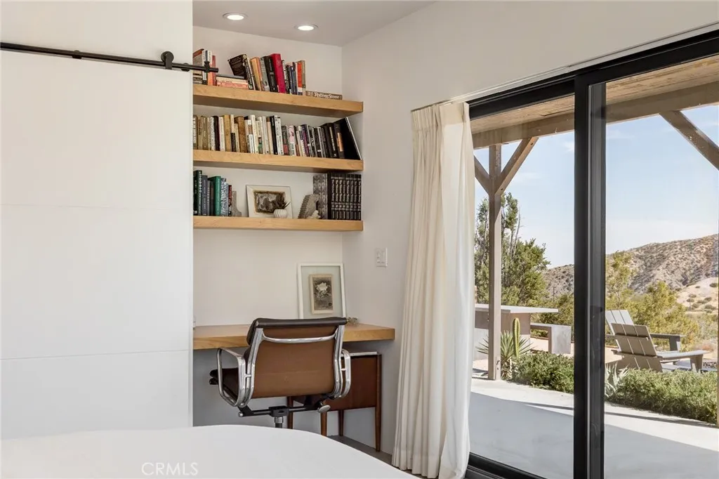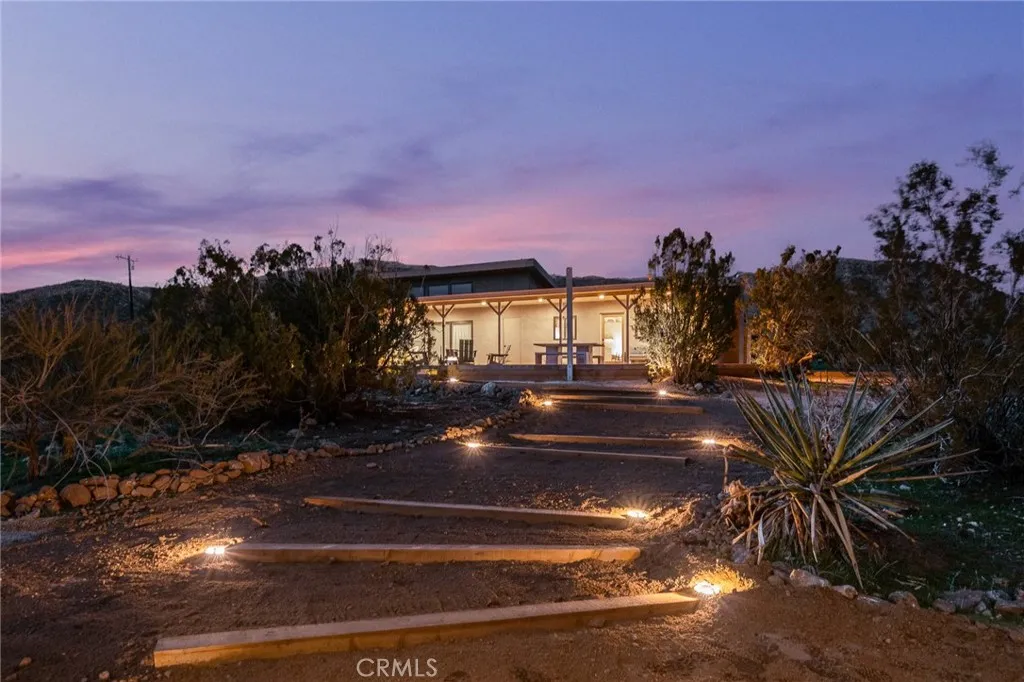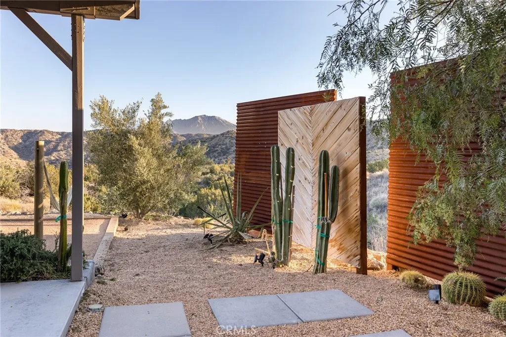 Spectacular mid-century-meets-modern home on 3 parcels spanning 10 lush verdant acres. Dramatic mountain views envelope you from all directions in this beautifully restored property, highlighted to the south by the majestic peak of Mt San Jacinto. Equidistant to both Palm Springs and Joshua Tree, this compound is the perfect starting point for exploratory adventures - though you may never want to leave. Owned by artists and designed with full-time livability in mind, this home underwent a complete renovation in 2022, adding a primary bedroom, oversized bathroom, and bonus 300 sq ft sleeping loft with mini-splits throughout the home for year-round climate control. The spacious bedroom features a walk-in closet and built-in office nook with a wall of glass sliders inviting you to take in the striking panoramic views. Down the hall youll find a hidden stackable washer & dryer and a spa-like bathroom with venetian plaster, dual sinks, a soaking tub, a shower room, and a separate water closet across the hall so your spa session will never be interrupted. A ladder leads upstairs to a secret sleeping loft with more epic views, making a delightful guest bunk or a quirky clubhouse for the kids. The original block cabin is now an open-concept living area with walls of windows, a wood-burning fireplace, dining area, a renovated kitchen with copper plumbing, new quartz countertops, and a hidden under-counter refrigerator. A 384 sq ft covered patio spans the rear of the home, leading to a spacious open-air lounge area with a gas grill, fire pit, and built-in hammocks to unwind after a d