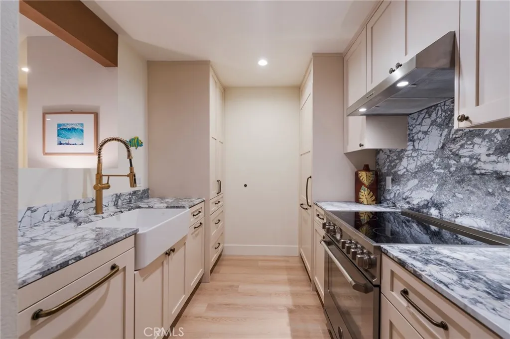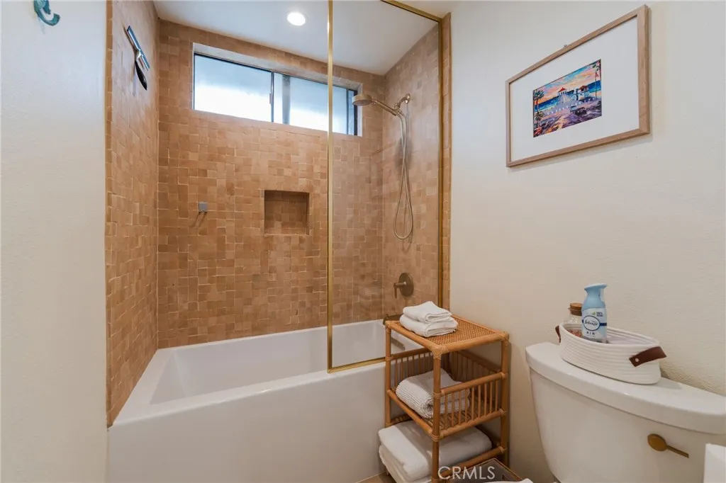 Gorgeous Villa Pacific condo just a bike ride to the Beach ..Formerly owned and professionally decorated by HGTV Designer so it shows just like a model and is move in ready.The turnkey property could include all furnishings and is easy first floor access with no stairs in this small -81 unit gated community.Stainless appliances , built in refrigerator and dishwasher with the cabinet panels on them, barn style sink and pull out custom faucet handle..Wood style flooring throughout make this unit light and bright.sliding door to outside patio , extra storage.Dining area with built ins, inset lighting..living room with flat screen TV .Master has a walk -in closet, tiled custom shower ,quartz counters in sink area .This unit has inside washer /dryer - rare ...The complex has a tennis court ,pool /spa /sauna and washer /dryer room .Perfect for vacation get away or first time buyer place. There is also a covered numbered parking spot for this unit and guest parking .