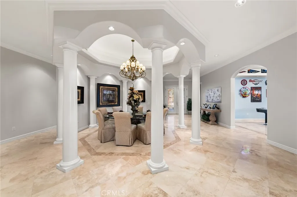 Welcome to the Beautifully Designed, Custom-Built 4,533 Square Foot Single-Story Home Located in a Small Cul-De-Sac in Desirable South Corona. Situated on an Expansive 40,000+ Square Foot Lot with NO HOA, this Property Offers Privacy, Space and Incredible Amenities. The Home's Standout Architectural Feature is the Striking Circular Formal Dining Area. There are 4 Spacious Bedrooms, Each with its Own Ensuite Bathroom, Plus a Convenient Half Bath off the Dining Area and a Spacious Office/Workout Room. The Luxurious Primary Suite Features an Oversized Walk-In Closet, and a Spa-Inspired Bathroom with Dual Sinks, a Vanity Area, a Soaking Tub and a Large Walk-In Shower. The Open-Concept Kitchen Flows into the Inviting Family room, Complete with a Gas Fireplace, High Hearth Mantle and Two Ceiling Fans. The Chef's Kitchen is Equipped with a Grand Walk-In Pantry, Stainless Steel KitchenAid Appliances -including a Built-In Refrigerator, Oven with 6 Burner Cooktop, a Single Oven, Microwave, Trash Compactor and Dishwasher. The Large Center Island has a Vast Amount of Storage and a Eating Area and Access to the Backyard. The Spacious Indoor Laundry Room Offer Ample Cabinets, a Utility Sink, Generous Counter Space and Direct Access to the Garage. Just off the Dining Area is the Game Room Featuring Custom Resin Countertops, Cabinets for Storage, Color-Changing Lighting, Bar Sink, Small Refrigerator, Built-In Media Cabinet, and a Sliding Door to the Outside Barbecue Area. Designed for Entertaining, the Backyard Includes Two Large Covered Patios, a Gas Fire Pit, Barbecue Island with Bar Sea