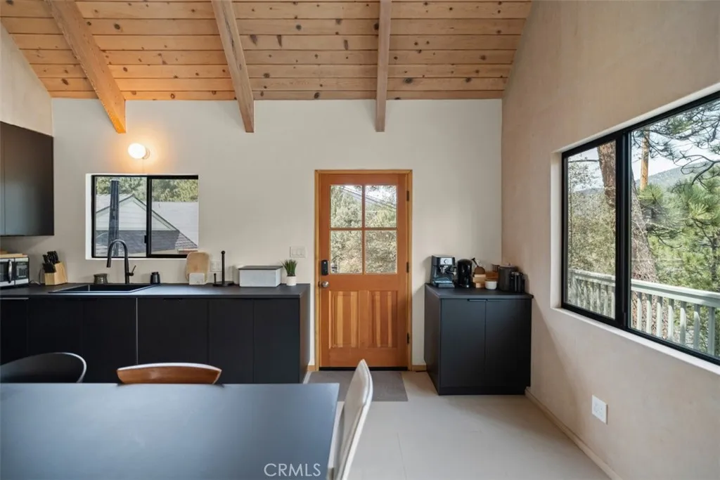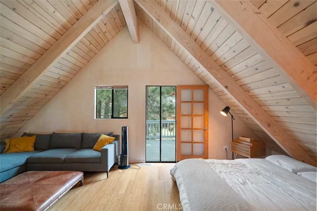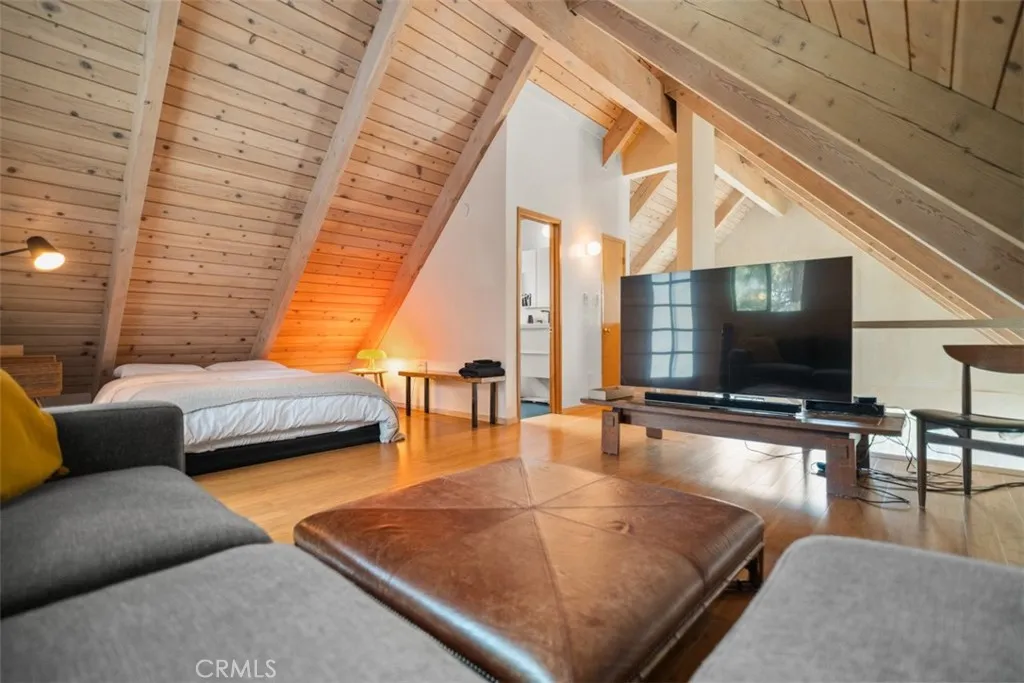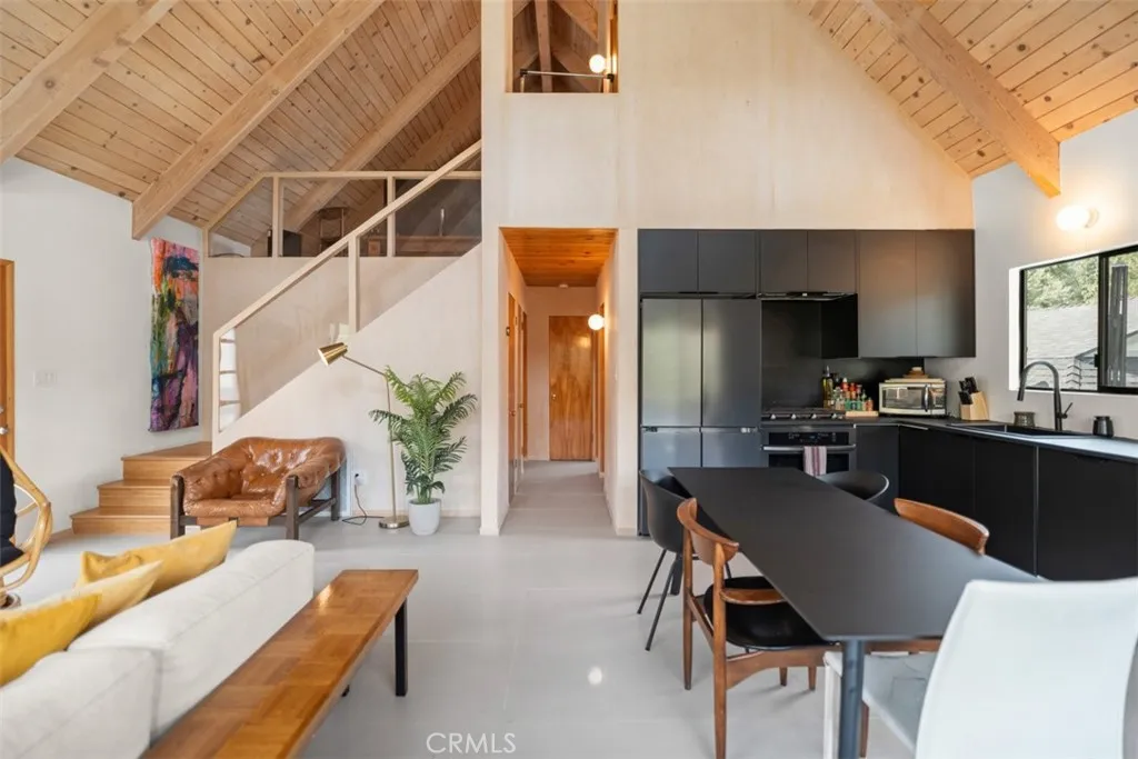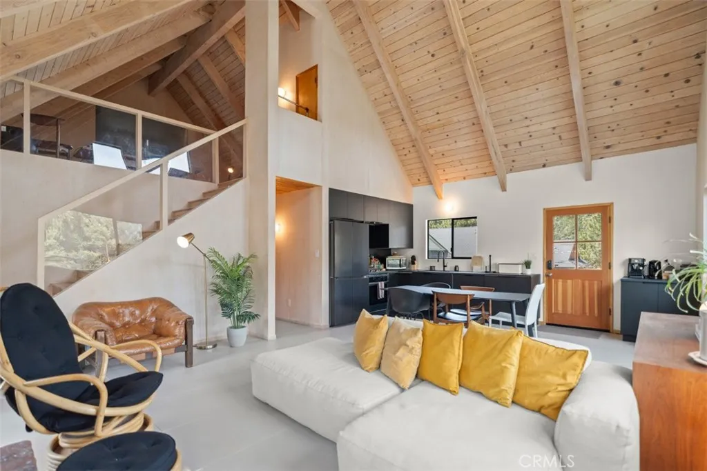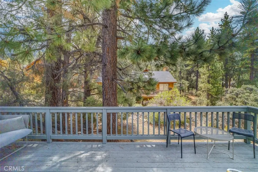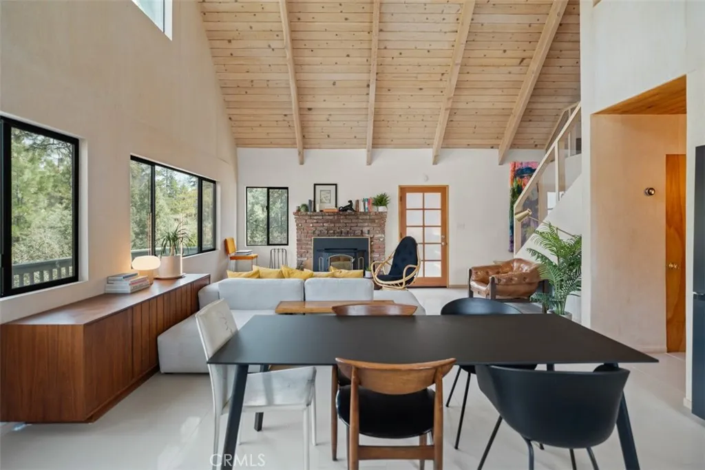 A Modern-Organic Masterpiece in the Pines Stylish, Elevated, and Ready to Enjoy! Welcome to your dream mountain retreat, where striking design meets elevated comfort and forest tranquility. Perched on a 10,746 sq ft lot among towering pines, this fully renovated 3-bed, 2-bath home is a rare blend of architectural sophistication and curated finishes. Step inside to a light-filled interior where high vaulted ceilings with exposed beams soar overhead. Grounded by new glazed matte porcelain tile flooring and white birch-accented walls, the open-concept living space radiates warmth and calm. A rustic brick wood-burning fireplace invites cozy evenings, while dual-pane windows and doors lead to an expansive deck with mountain views. Custom-built stairs with sleek plexiglass railings further elevate the modern aesthetic. At the heart of the home is a show-stopping matte black kitchenequal parts chic and functional. It features custom soft-close cabinetry, a deep under mount sink with matte black fixtures, pull-out trash drawer, and premium appliances: Samsung 30 Wi-Fi wall oven, Samsung cooktop, Bosch 800 Series panel-ready dishwasher, and a Samsung BESPOKE French-door fridge in matte black steel. The new range hood vents outdoors, and all kitchen electrical and plumbing have been fully updated. Two peaceful bedrooms and a fully remodeled main-level bath with soaking tub, matte black fixtures, and glass doors offer restful comfort. Upstairs, the lofted primary suite is a tranquil retreat with its own private balcony and a spa-inspired en-suite showcasing a walk-in shower, tub fill
