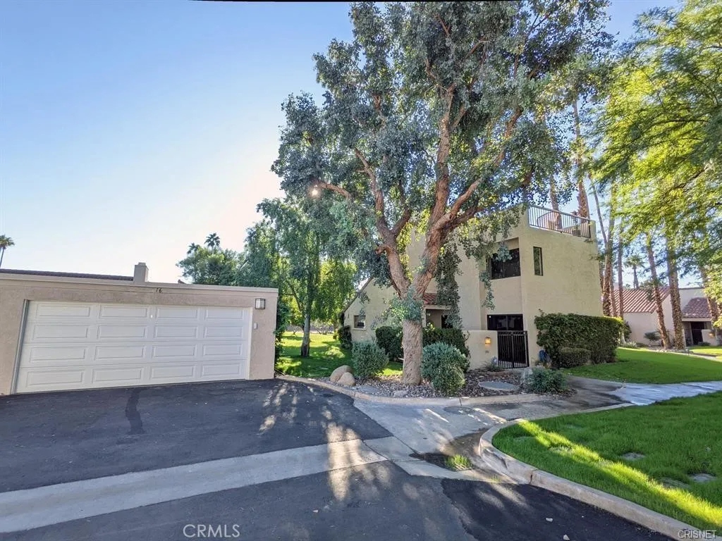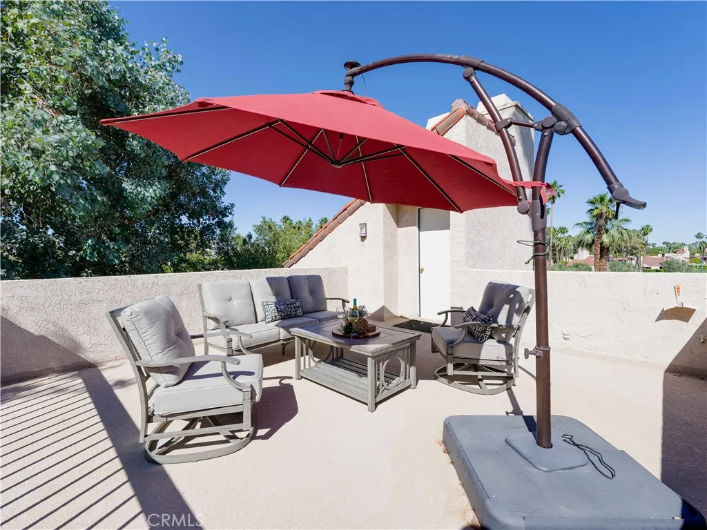 Mid-Century Charm Meets Modern Style in Mission Hills Country Club! Located in the desirable Retro Mirage enclave of Rancho Mirage, this beautifully updated 2BD/2BA, 1,547 sq ft end-unit condo blends iconic mid-century architecture with todays comforts. Vaulted ceilings, clean lines, and panoramic mountain views set the tone for this stylish desert retreat. Inside, enjoy two spacious en-suite bedroomsone upstairs, one downoffering flexibility for guests or a home office. The light-filled living room features soaring ceilings, a cozy stone fireplace, and stone flooring throughout. A custom quartz bar with vibrant blue hues adds a perfect touch for entertaining. The updated kitchen boasts quartz countertops, stainless steel appliances, pantry, and a dedicated coffee station. Double sliders lead to the private rear patioideal for morning coffee or evening BBQs. Additional outdoor spaces include a gated courtyard and a rooftop terrace with stunning sunset and mountain views. Detached 2-car garage with newer door, mature landscaping, and access to 3 community pools/spas. Enjoy all Mission Hills Country Club has to offeraward-winning tennis, golf, fitness, clubhouse, and 24-hour guard-gated security. Perfect as a full-time home or weekend getaway!
