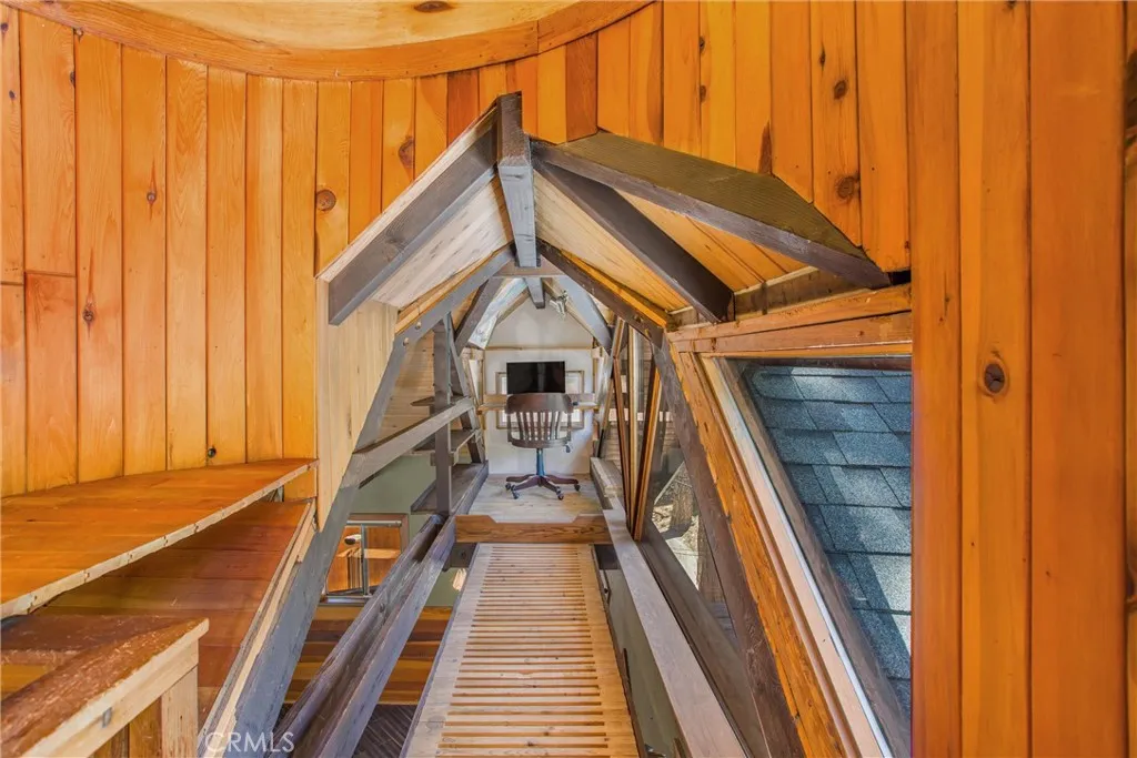 Welcome to your enchanting retreat in Forest Falls! This distinctive home boasts a stunning entrance with stone steps leading up to a spacious deck, perfect for soaking in the serene surroundings. Inside, you'll find a cozy living room featuring a wood stove, creating a warm and inviting atmosphere. The kitchen is a chef's dream, complete with beautiful granite countertops, a central island, and an impressive built-in pizza oven. Abundant cabinet space ensures you have all the storage you need. Adjacent to the kitchen, the stone dining room showcases a remarkable stone arch and double doors that open to the expansive deck, ideal for entertaining or enjoying your morning coffee. The luxurious bathroom offers a spa-like experience, featuring a steam room shower with heated floors, a decorative sink, and exquisite mosaic detailing. Ascend the tower to discover an open bedroom that includes a charming brick fireplace and two decks, one with a delightful swinging bench. Catwalks lead to a conveniently located half bath. Continuing up the tower, you'll find more catwalks leading to a cozy loft, all spiraling around a unique tree trunk. The home is filled with natural light, thanks to numerous windows and skylights, creating an airy and bright ambiance. San Bernardino's National Forest is right in your backyard! Leading to, what locals call, " Deer Lookout" featuring breathtaking views. Situated in an area rich with outdoor activities, you'll be close to hiking trails, picturesque waterfalls, and a tranquil creek, all while enjoying the beauty of all four seasons. Experience the p