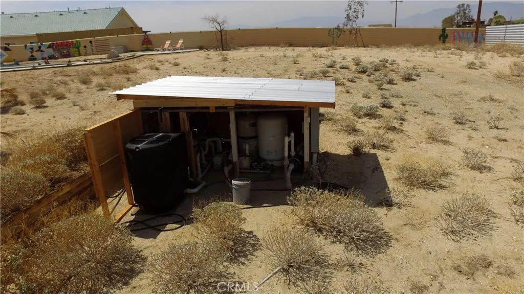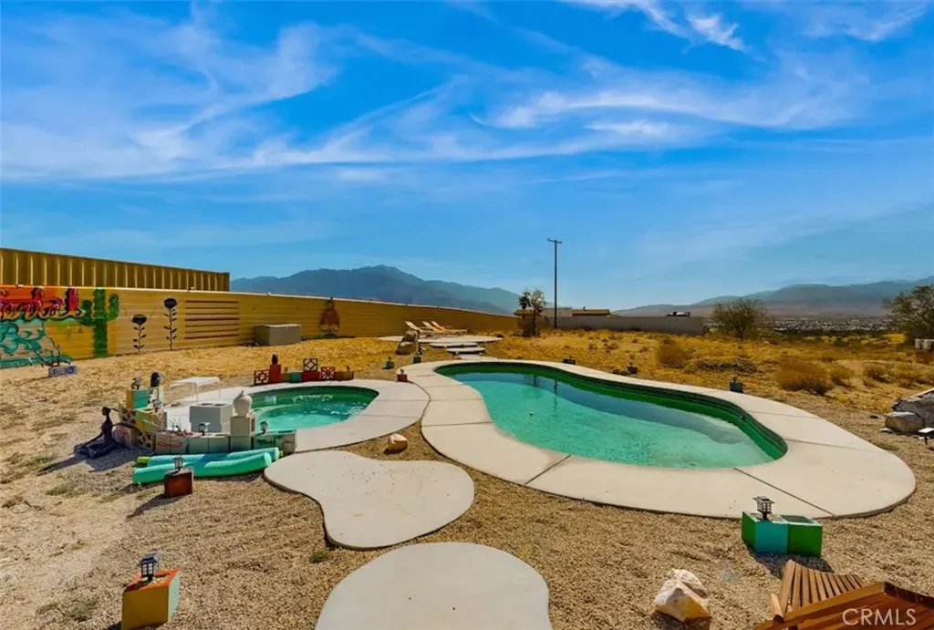 Discover the Elemental Retreat House, a modern home designed by a renowned San Francisco architect and nestled on a 1.25-acre secluded lot located just outside of Desert Hot Springs. This 2000 sq.ft., 3-bedroom, 2 bath home offers tranquility, eco-conscious design and income-generating potential, all just 20 minutes from downtown Palm Springs and a short drive to Coachella. Large double-pane sliding doors positioned, every 8 feet, frame breathtaking 360-degree mountain and desert views. The home is divided into two 1000 sq. ft. wings, connected by a covered central space with pull up door, creating a weather protected indoor/outdoor living area. The main wing houses a guest bedroom with bath, a spacious living room, dining area and fully equipped kitchen. The other wing houses two expansive 450 sq.ft. master suites, featuring 2 sliding doors each that open to spacious covered patios, perfect for morning coffee or stargazing under the desert sky. The innovative double-roof design, with a 5,000-square-foot top roof, shields the home from the desert sun while channeling cooling breezes between the roofs, ensuring comfort even in the hottest months. Wrapped in 18 inches of Styrofoam insulation and clad in elegant cedar, this super-insulated home achieves near-zero energy consumption, complemented by a one-year-old solar system that virtually eliminates electricity costs. The heart of the Elemental Retreat House is its therapeutic mineral water well, delivering odorless, 85F mineral-rich water year-round. Packed with health-enhancing minerals, this water fills the oversized pool