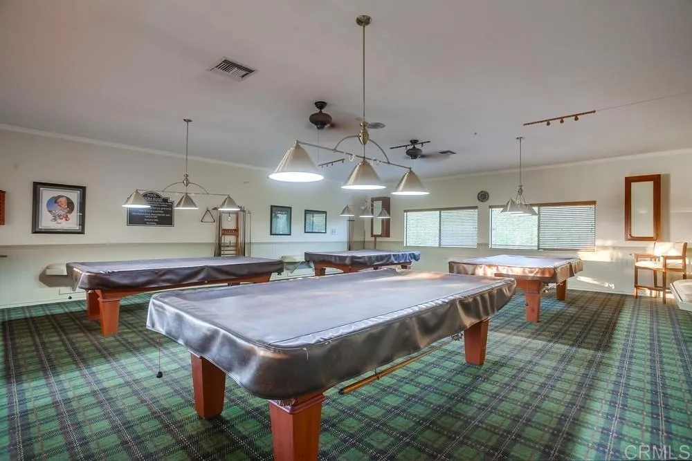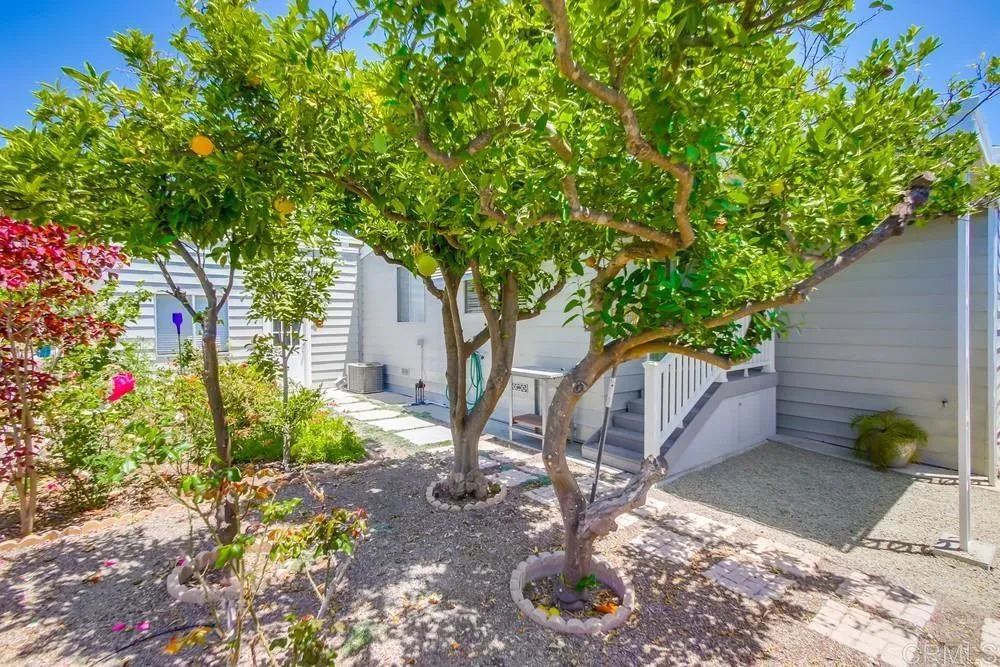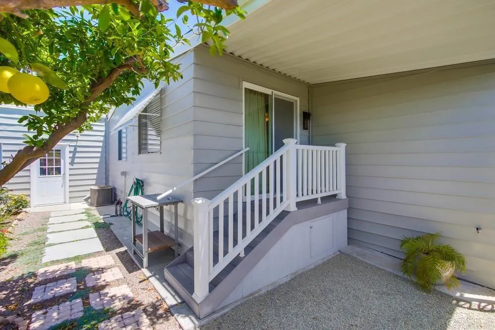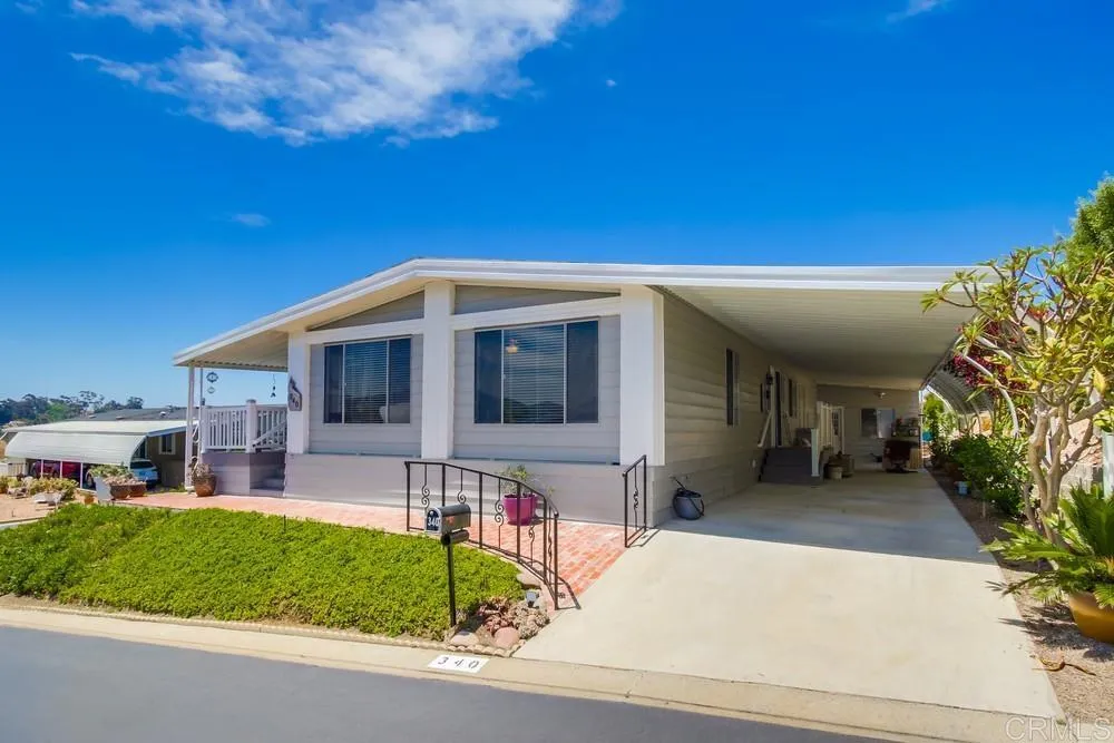 Wonderful home in highly desired Palomar Estates West. Enjoy views of the surrounding hills from the living room, enclosed porch, and front porch. The beautiful kitchen has an island and stainless steel appliances. The primary bedroom has a large walk-in closet and on-suite bathroom with dual vanities, a tub, and a beautiful tiled shower. As well there is a sliding glass door in the primary bedroom to access the beautiful back yard with rose bushes and fruit trees. The large family room gives you plenty of space for entertaining. The enclosed porch/California room can be used as a craft room or office. Fan lights are in the living room, family room, and both bedrooms. Outside there is a large shed that can be used as a workshop or to store your extra items. The curved awing poles and extra long carport gives you plenty of space for parking or it can be used for outdoor living as well. This home has lots of privacy, is located close to the clubhouse, and has guest parking right next to the home. Palomar Estates West is a 5 star 55+/35+ senior rent controlled park with many activities and amenities including a beautiful clubhouse, heated pool, spa, gym, putting green, pickleball courts, and tennis courts. This home is located minutes to Lake San Marcos dining and golf as well as local Carlsbad beaches, shopping, and restaurants.