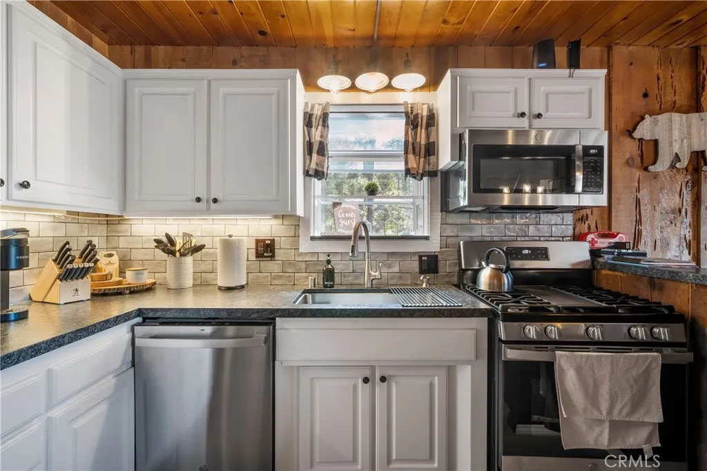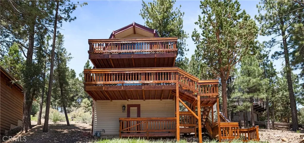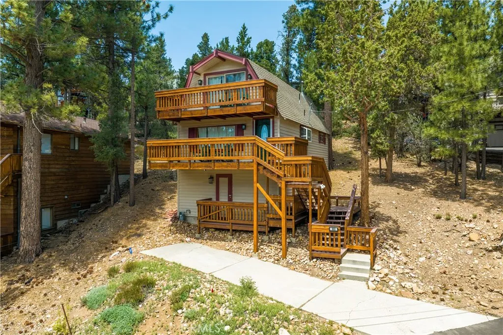 Escape to the mountains and indulge in the ultimate cabin retreat! This beautiful Big Bear cabin is located in Whispering Forest, one of the highly desirable neighborhoods in Big Bear City. This 3-bedroom, 1-bathroom cabin is nestled in a quiet neighborhood surrounded by soaring pine trees, beautiful views of neighboring cabins, and peak-a-boo views of Snow Summit and Bear Mountain Ski Resorts. Located on an 8,960 sq ft lot, this home offers privacy and seclusion while still being minutes away from the lake, ski resorts, hiking trails, boat ramp, and The Village (Big Bear Lake's hub for dining, shopping, and entertainment). The open-concept layout of the living room and dining area makes this cabin very comforting and inviting. The cabin features a big-picture window that offers a panoramic view of nature day in and day out. The kitchen has new countertops and modern tiles that truly complement the rustic feel of the cabin. The fireplace has been updated and it features a wall-mounted remote that creates a warm and welcoming ambiance, any season of the year. The laundry area is located on the main floor which is very accessible. This cabin has a newly installed A/C which is a major plus since only a few cabins in Big Bear have a central A/C system installed. The main floor already offers a lot to see but there is more to explore on the second level where the 2 spacious bedrooms are located, with one of the bedrooms having a private balcony. This cabin epitomizes mountain luxury and the perfect escape from city life. Don't miss this incredible opportunity to own a mountain c