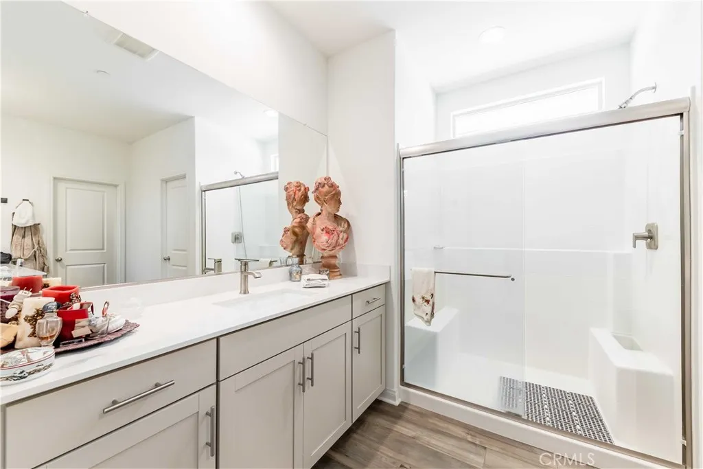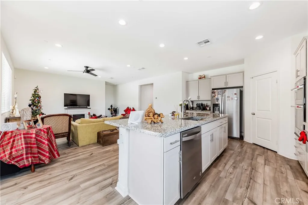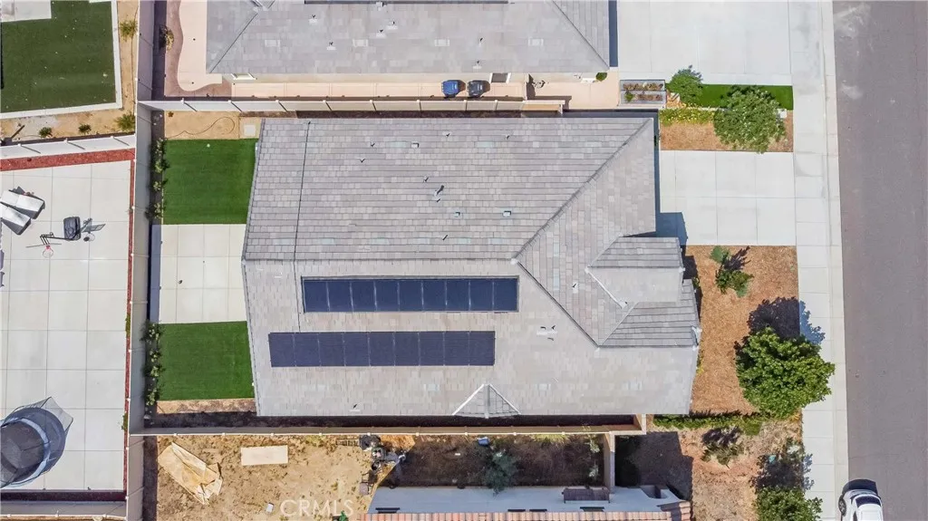 Welcome to this highly upgraded 3-bedroom, 2-bathroom home, plus a flexi room designed for modern living with an open floor plan. This home also features a VA Assumable loan at a 4.25% interest rate for potential VA buyers! As you step inside, discover a host of premium features including upgraded floors (luxe vinyl plank and plush carpet in bedrooms), a smart home system, and recessed lighting throughout. Benefit from owned solar panels. A large den/office with a closet offers flexible space. The fully upgraded gourmet kitchen is a chef's delight, featuring expansive granite countertops, a bar island, deep sink, dining area, and abundant storage with a pantry. Both bathrooms are upgraded for modern appeal. The individual laundry room includes a sink vanity. Outside, both front and back yards showcase drought-tolerant landscaping and a spacious backyard with a shaded patio. The private master suite is generously sized with a large walk-in closet, individual sink vanities, and a walk-in shower. It also comes with EV Charging Station Capability for flexibility & control over your charging schedule. Centrally located for easy access to shopping centers, the 215 Highway, schools, and parks. Schedule your private showing today!