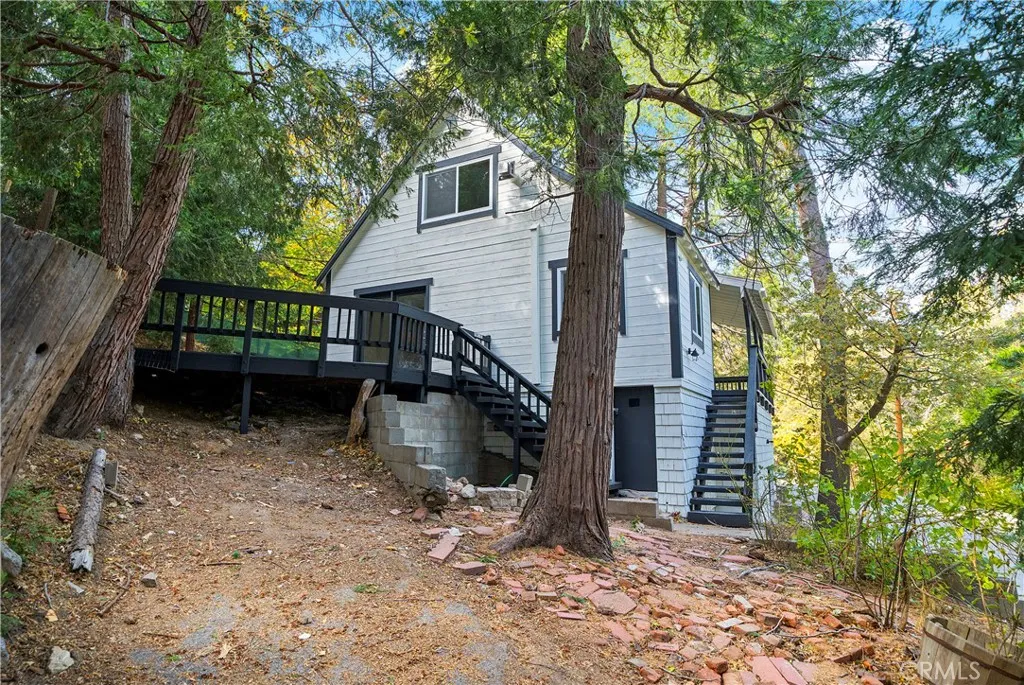 Nestled in the peaceful community of Twin Peaks, this inviting 3-bedroom, 2-bathroom cabin is the ideal retreat for anyone seeking a blend of rustic charm and modern convenience. With 126 feet of frontage, the cabin is very unique in its offering of ample parking, an attached garage, and an elongated driveway to the left of the home. Thanks to its almost 13,000 square ft fenced lot you also have a tremendous amount of privacy and usable land also rarely found on hillside cabins! Inside, you'll find an open and airy floor plan with beautiful shaker cabinets, sleek quartz countertops, and stainless steel appliance package, lending a touch of elegance to the kitchen. The large master suite is a true sanctuary, offering generous space and comfort, perfect for unwinding after a day of mountain adventures with secondary exterior access to a lovely deck nestled amongst the trees. Upstairs are two additional guest bedrooms and a guest bathroom providing spacious accommodations for both kids and guests alike. This Twin Peaks cabin has it allspace, style, and a serene settingmaking it the perfect mountain getaway or forever home. Don't miss your chance to own this charming property!