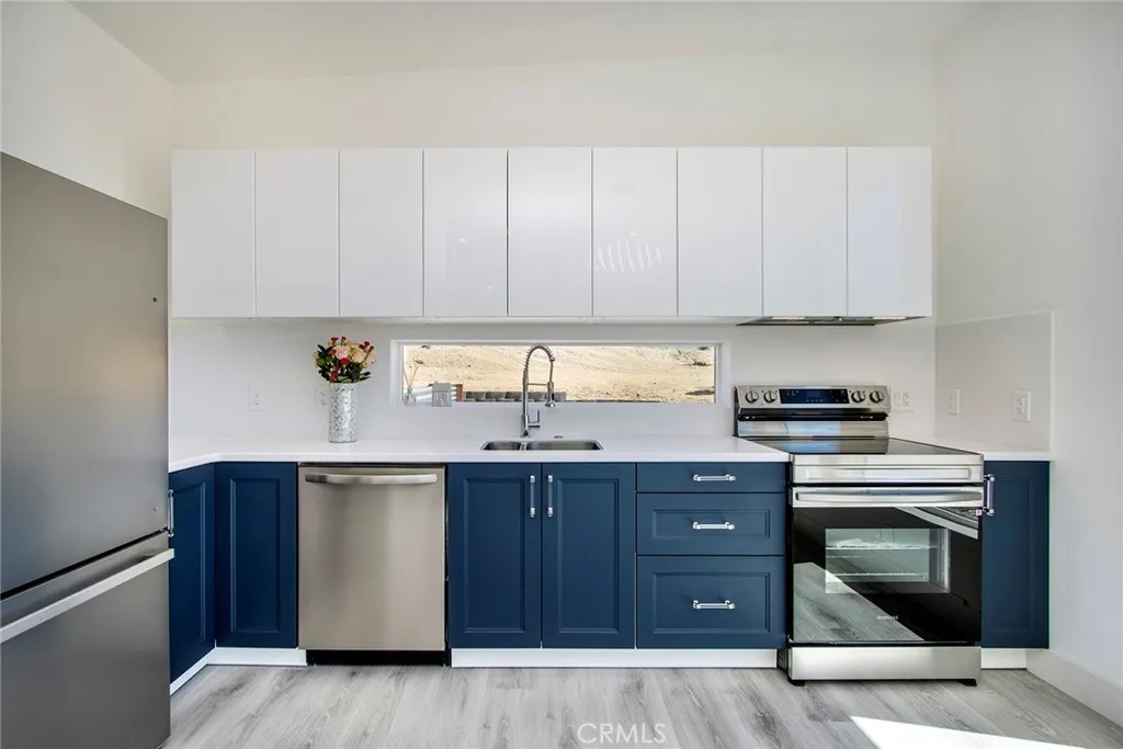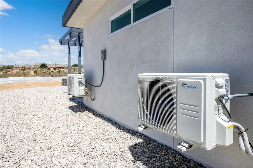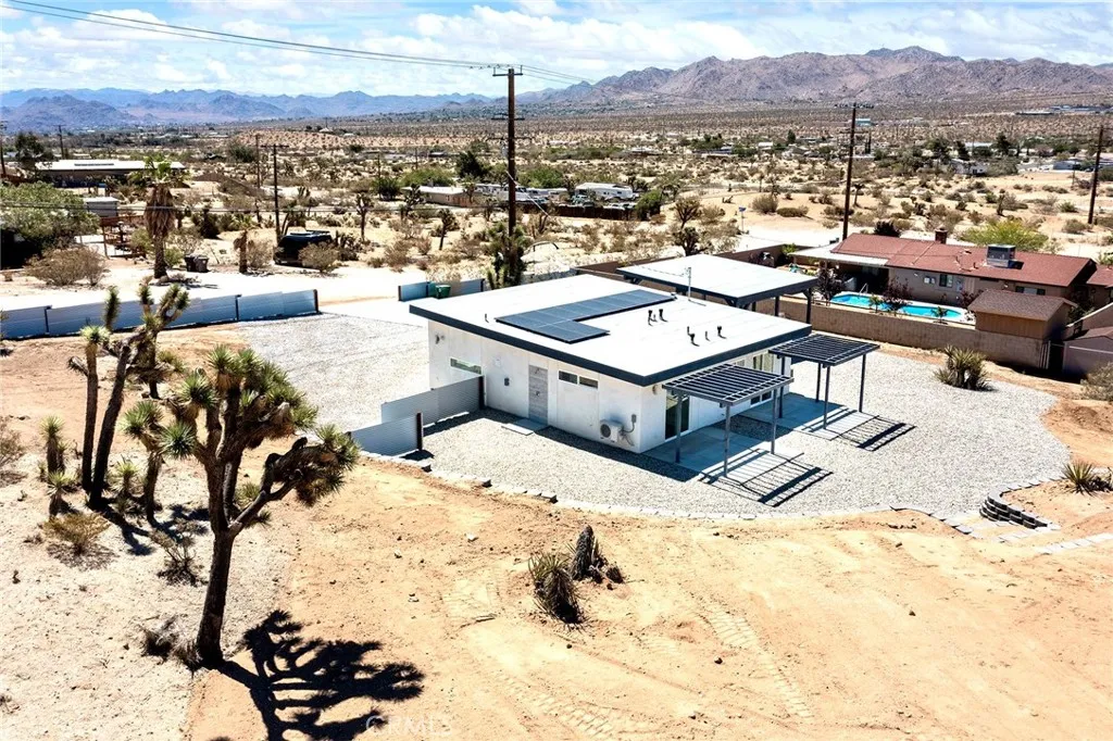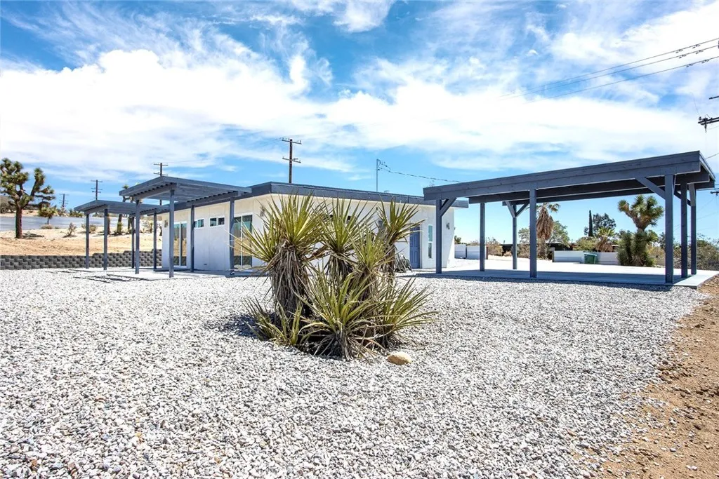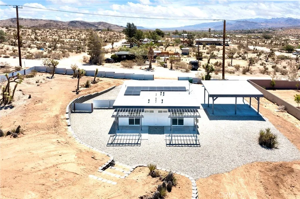 Brand New Home, 2 bedrooms 2 bath, open-concept living area, high ceilings, (8-10 ft) creating an airy and spacious feel, 1000 sf of living space, on an 0.80 acres, land, described as square-shaped, which provides a versatile layout for landscaping or future development. Property features modern amenities like, energy efficiency paid solar panels system, reducing utilities costs and environmental impact. The home is equipped with three independent AC/heating systems, ensuring personalized climate control, and features triple pane windows with argon gas, enhancing insulation, noise reduction, and UV sun protection. A gourmet kitchen, stainless steel appliances, granite arctic white backsplash, spacious countertops, gorgeous lacquer cabinets, catering to culinary enthusiasts and offering a modern aesthetic. Both bedrooms are spacious, one of which is master bedroom, designed with custom closet organizers, maximizing storage and functionality. Premium flooring of half inch thick, scratch free, 100% waterproof vinyl installed as a single piece with lifetime warranty, ensuring durability and low maintenance. Home is wifi ready, making it ideal for both, remote work or entertainment. Outdoor amenities include a large, solid carport that can be converted into garage or additional living quarters, adding flexibility for buyers. The property is spa-ready with (220V) electric connections, outdoor shower, and features a dusk-to-dawn outdoor sensor lighting system for safety and ambiance. Property is fully fenced for privacy and security, graded and situated on top of a hill, with reta