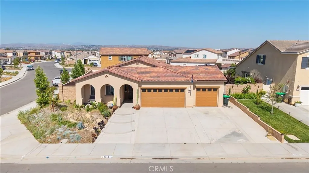 Welcome to 2114 El Nido Ave in Perris, CA! Built in late 2023, this nearly brand-new and single-story Spanish-style home offers 4 spacious bedrooms, 3 bathrooms, and a beautifully designed open layout with just under 1,900 square feet of living space. Located on a desirable corner lot, this property combines smart home technology, energy-efficient features, and stylish finishes throughout. Step inside to soaring vaulted ceilings and a bright, open-concept great room that seamlessly connects to a modern kitchen featuring quartz countertops, a large center island, stainless steel appliances, and a walk-in pantry. The primary suite includes a private ensuite bathroom and a generous walk-in closet. The home also features a 3-car garage pre-wired for EV charging, upgraded recessed lighting, smart thermostat, smart locks, and moreall included in the Smart Home system package. Outside, enjoy low-maintenance landscaping in the front yard and a spacious backyard ready for your finishing touches. Conveniently located near schools, shopping, and freeway access, this move-in ready home is a rare opportunity in one of Perris newest neighborhoods. Dont miss your chance to own a nearly new home without the wait!
