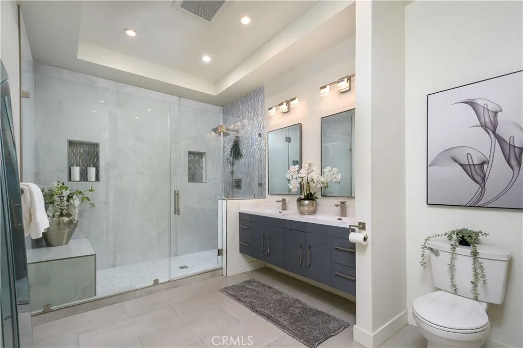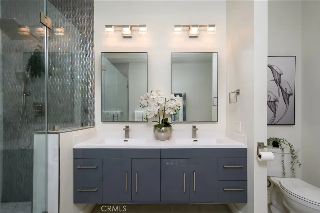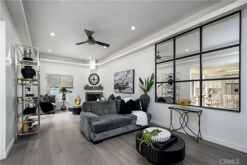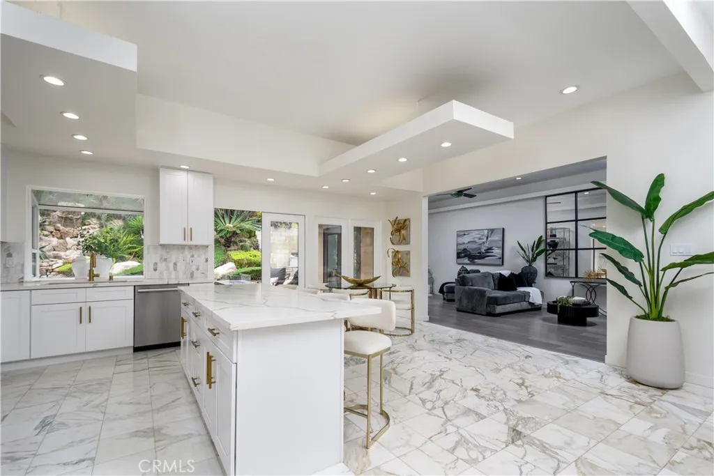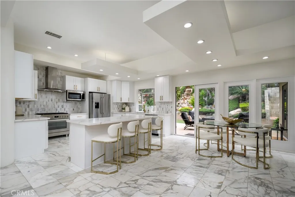 Located in the prestigious Baldwin Hills Estates affectionately known as The Dons this stunning 4 bedroom, 3 bathroom residence seamlessly combines contemporary elegance with the tranquility of nature. Set against the backdrop of one of Los Angeles' most historically affluent and culturally rich neighborhoods, this home offers a lifestyle of sophistication and comfort. Step inside to discover an elegant foyer, open concept design, recessed lighting throughout, and high ceilings. The living room features a cozy fireplace, and French doors that open to the backyard, creating a harmonious indoor-outdoor flow. The state-of-the-art kitchen is a culinary enthusiast's dream, designed with lighting soffits, elegant shaker cabinets, Bosch appliances, quartz countertops, and marble floors. Adjacent to the kitchen, the dining area provides the perfect setting for intimate dinners or lively gatherings. This home features 4 spacious bedrooms including a primary suite designed for comfort and convenience with a fireplace, large ensuite with mosaic and ceramic tile adding charm and texture, sliding glass doors add a seamless flow to the outdoor living space. The beautifully landscaped backyard is a private retreat, featuring a serene hillside adorned with a cascading waterfall and a vibrant array of colorful plants and trees. An outdoor living area, complete with recessed lighting, a large built-in television and surround sound system, invites you to relax by the electric fireplace and enjoy out-door entertainment, stretching routines or peaceful meditation. A separate fire pit area with