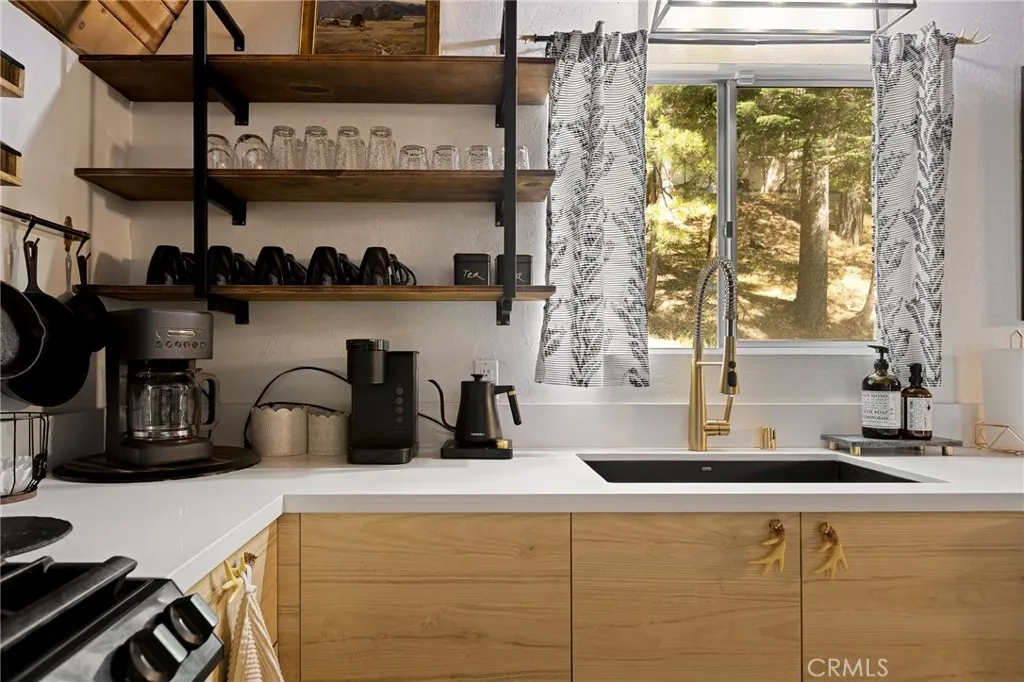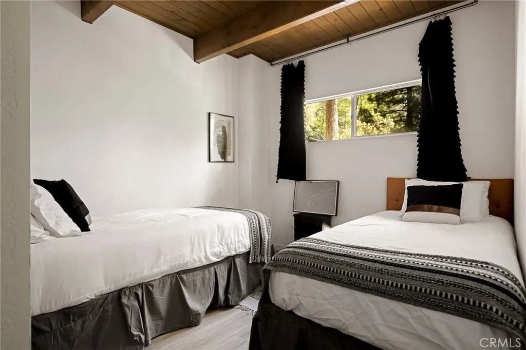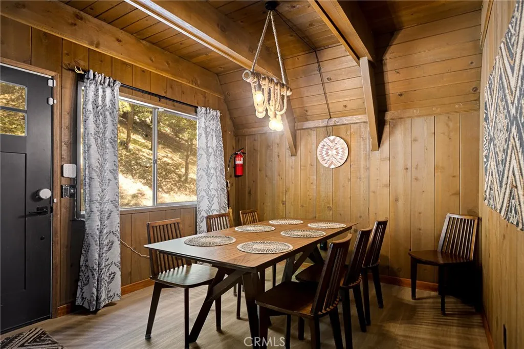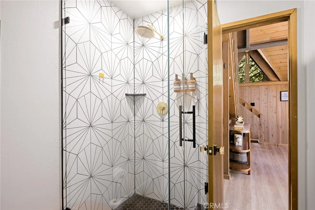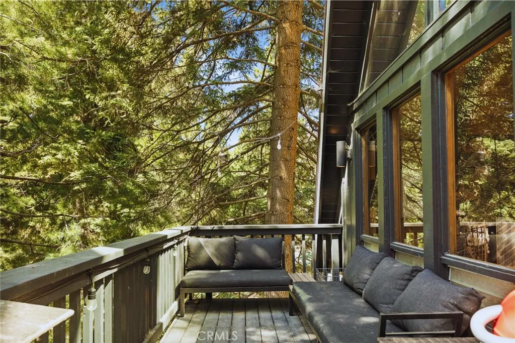 Wrapped in pines and rich with character, this vintage A-frame brings together iconic mountain design, tasteful updates, and the lifestyle Lake Arrowhead buyers are searching for. The flat-faced prow, bold roofline, and redwood fencing give the home striking presence, while soaring wood-beam ceilings, dramatic triangular windows, and a classic stone fireplace create a warm, unforgettable interior. The open dining area connects naturally to the updated kitchen with open shelving and warm wood accents, while upstairs, a spacious loft-style game room offers added room to gather, unwind, or host guests. Beautifully updated bathrooms introduce fresh modern finishes without losing the homes rustic charm. A seasonal creek enhances the serene setting, and central A/C adds comfort throughout the year. Outside, the deck is perfectly positioned to enjoy the wooded surroundings, mature trees, and fresh alpine air. Complete with Lake Rights, rare level entry, private lake access, and a strong short-term rental history, this is a distinctive mountain escape with lasting appeal.
