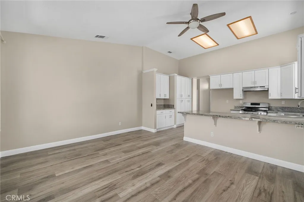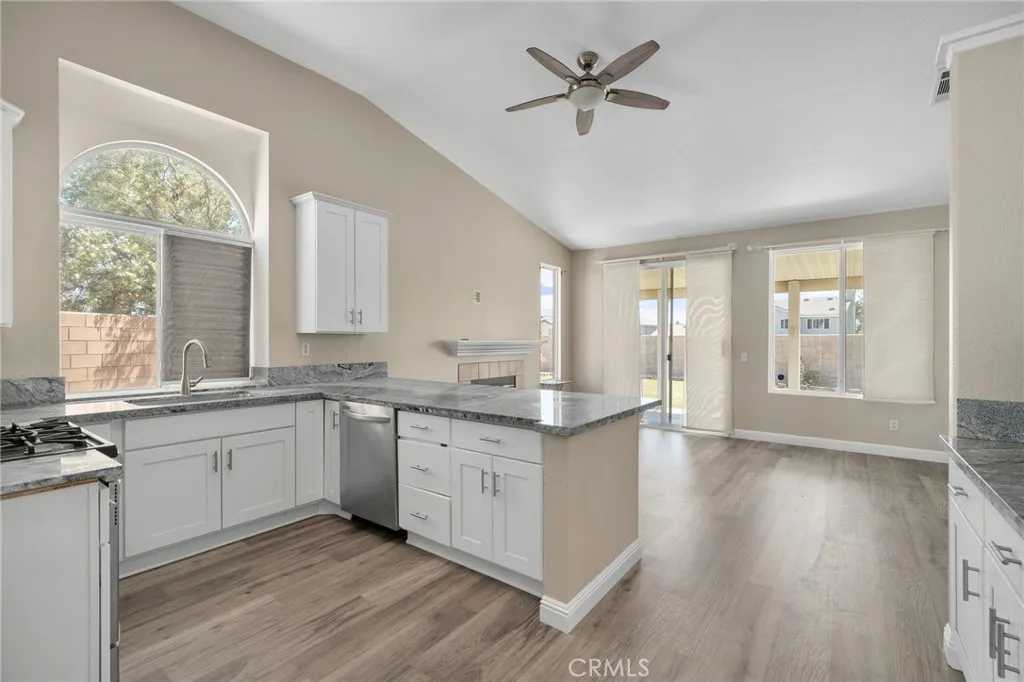 Welcome to your new place to call home, where comfort and style come together seamlessly. Step inside to discover large vaulted ceilings with an abundance of natural light. This property features brand new vinyl flooring and baseboards through the living room, kitchen family room and down the hall to the three bedrooms creating a fresh and modern feel. The updated kitchen is a chefs dream, featuring brand new cabinets, sleek granite countertops, and plenty of space to cook and entertain. With the open kitchen/living concept into the family room makes it the perfect space to entertain guests. Complemented by a cozy fireplace and ceiling fans throughout the home for year-round comfort. The spacious master suite includes a walk-in closet, an ensuite bath, and direct access to the backyard through a private sliding door. Outside, enjoy the low-maintenance, drought-tolerant landscaping with beautiful artificial turf and a large covered patio perfect for relaxing or entertaining. A generous three-car garage offers ample parking and storage, and the backyard also includes a sizable shed for all your extra tools and toys. This home truly has it allstyle, function, and plenty of space to enjoy.