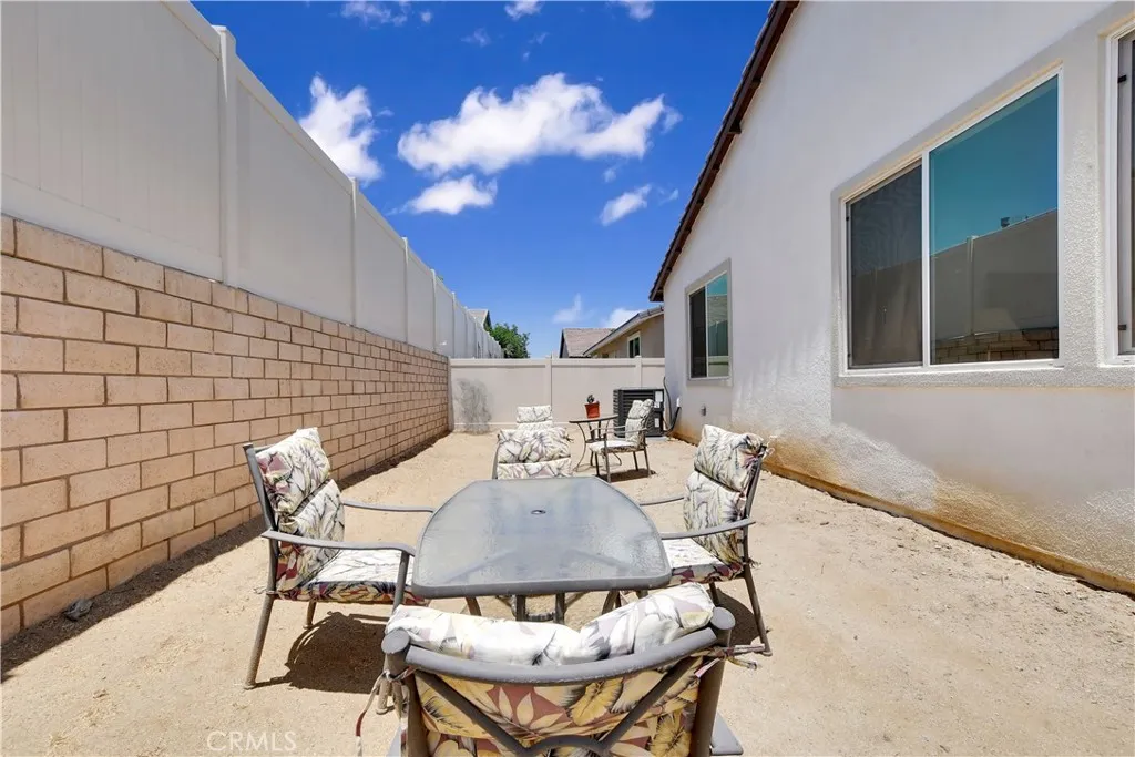 This beautiful single story Menifee home, built in 2023, offers 2615 square feet of living space with four bedrooms, three bathrooms, and a spacious two car garage, all situated on a 6098 square foot lot. Energy efficient paid off solar panels enhance this home, paired with a beautifully landscaped front yard featuring low maintenance greenery and a charming front porch with a sitting area that adds to its inviting curb appeal. Inside, the entryway welcomes you with laminate wood flooring that flow seamlessly throughout the house, a light color palette, and abundant natural light. To the right of the entry, a hallway leads to a full bathroom complete with a shower tub combo, a dual sink vanity and laminate flooring. Also down the hallway are three additional bedrooms, each featuring plush carpeting, ceiling fans, ample closet space, and windows that invite in warm, natural light. Back near the entry, you will find an additional full bathroom featuring laminate flooring, a shower tub combo, and a single sink vanity. Conveniently across the hall is a laundry room equipped with a wash sink, built in shelving and garage access. Relax in the open concept living room, featuring recessed lighting and large windows that flood the space with natural light, ideal for everyday comfort. The bright and spacious kitchen showcases stunning natural stone quartzite countertops, a walk in pantry, and stainless steel appliances including a five burner gas cooktop, built in oven, microwave, and dishwasher. It offers an abundance of cabinetry for ample storage, along with a large center island