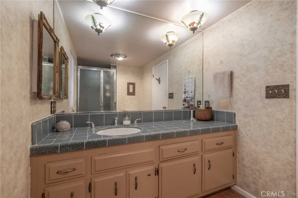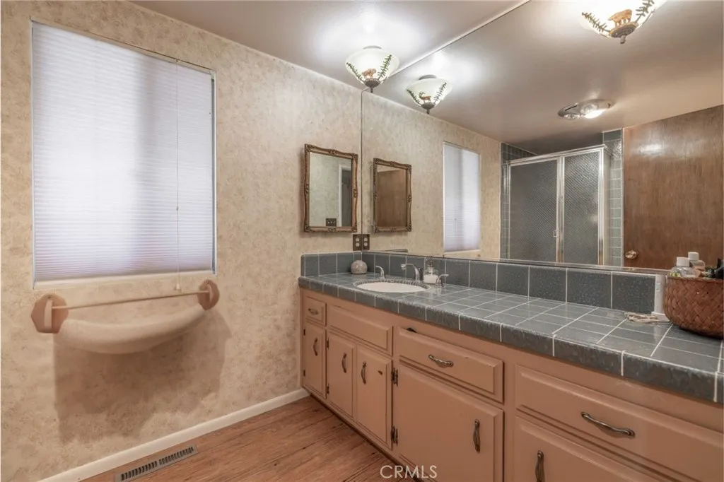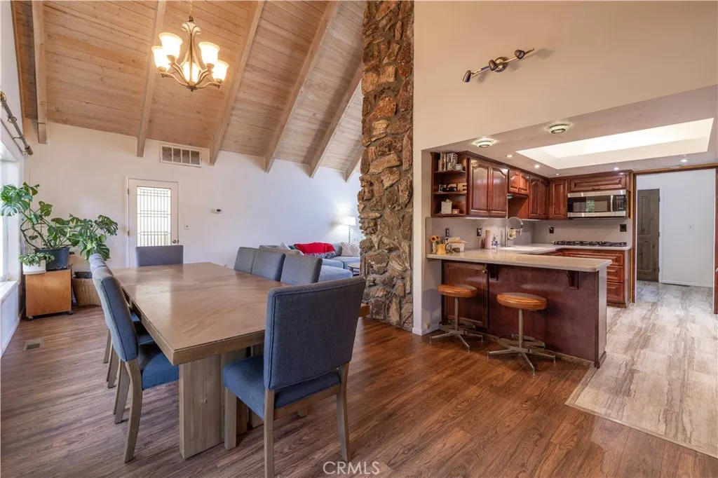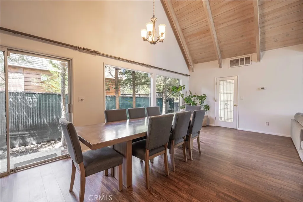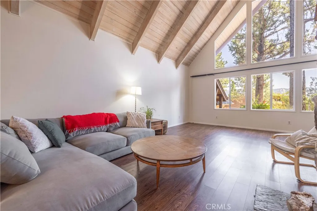 Nestled in the desirable Whispering Forest neighborhood, this uniquely designed home offers versatile living with mountain charm. The main living area features soaring ceilings, an open-concept layout, and a stunning floor-to-ceiling stone fireplace that anchors the living, dining, and kitchen spaces. To the left, youll find a spacious primary suite and an oversized guest bedroom, both with vaulted ceilings, plus a full guest bath. The right wing offers a flexible-use room ideal for a game room, office, gym, or 4th bedroom. This area leads into a private second living space with its own living room, upstairs bedroom, and bathroomperfect for multigenerational living or potential rental income. Expansive windows frame the front patio and offer distant ski slope views from the cul-de-sac lot. Vinyl plank flooring and plush neutral carpet. For part-time residents, enjoy smart home features like a remote-controlled thermostat. Whether you're looking to live in the entire home or split the space for added income, this mountain retreat offers rare flexibility and comfort in one of Big Bears most scenic neighborhoods.