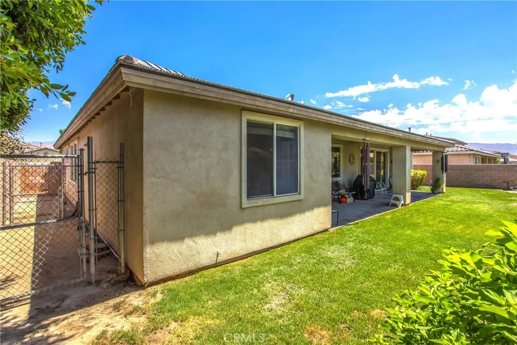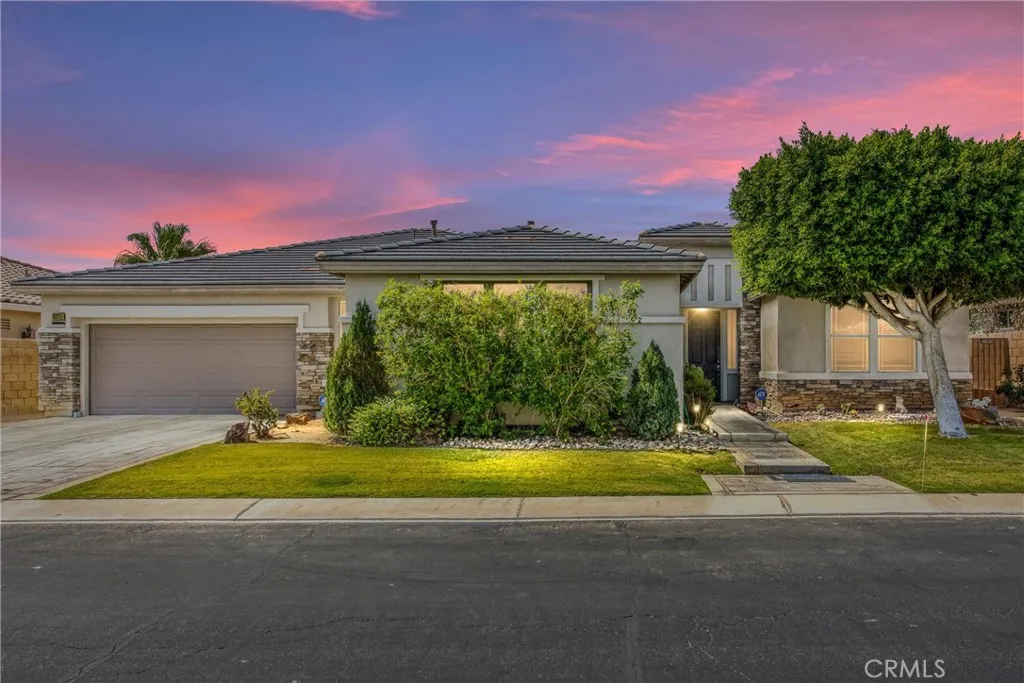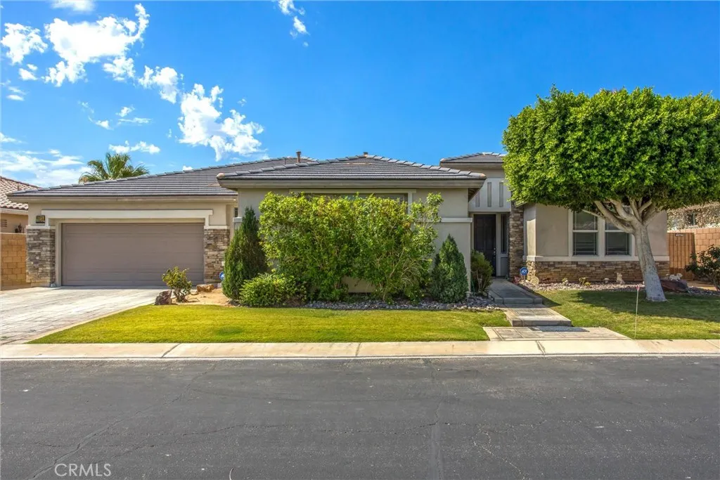 Step into sun-soaked serenity at 83315 Stagecoach Road, a bright and flexible contemporary single-level home in the highly sought-after Shadow Ranch community, just minutes from Coachella, Stagecoach, and world-class golf and dining. Thoughtfully laid out floor plan with 4 spacious bedrooms plus a bonus den, this home offers exceptional flow with over 2,500 square feet of open-concept living, and is ideal for multi-generational living, remote work, or flexible entertaining. The heart of the home is the open-concept great room centered around a cozy tiled fireplace, with seamless flow into the kitchen, formal dining room, and breakfast nook. The entertainer's kitchen features a large center island with breakfast bar seating, 5-burner cooktop, double ovens, and abundant cabinet storage, as well as room for expansion. A sunny breakfast nook and adjacent formal dining room offer ideal options for casual meals or upscale hosting. Tucked privately at the rear of the home, the primary suite is a peaceful retreat, with sliding glass doors to the backyard, a large walk-in closet, dual vanities, soaking tub, separate shower, and private water closet. Two additional bedrooms and a full bath are located in their own wing surrounding a bonus den/family room, perfect for a play area, office, or TV room. The final bedroom functions well as a guest suite, with its own hall and full bath off entry. Step outside to a covered patio and grassy backyard, complete with palm trees and privacy fencingideal for relaxing, dining, or letting pets roam. Whether you're looking for a full-time home, sea
