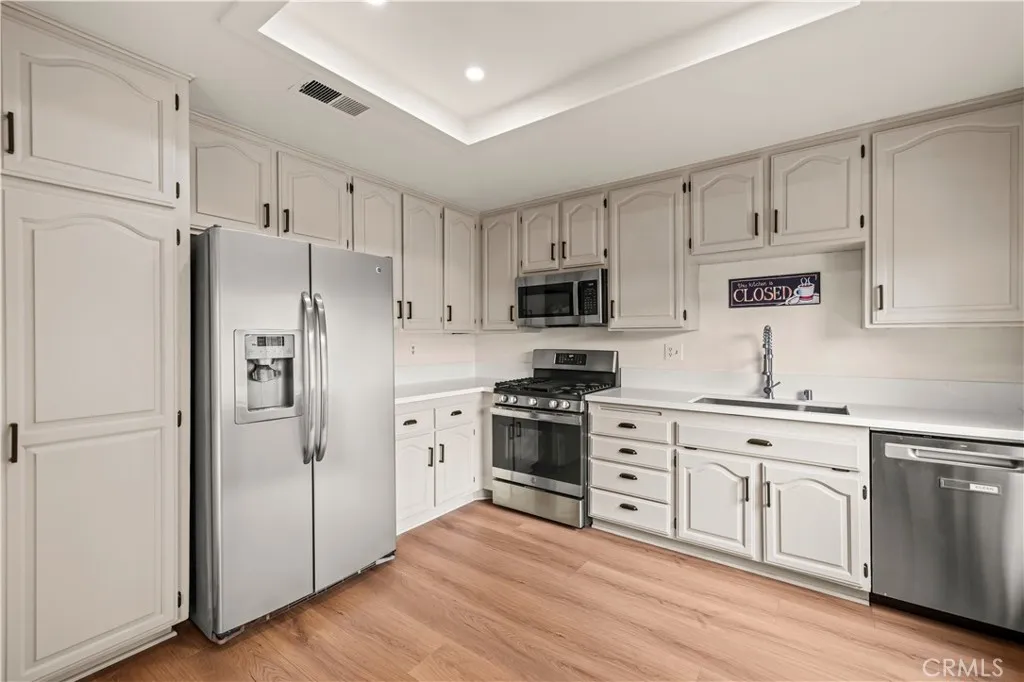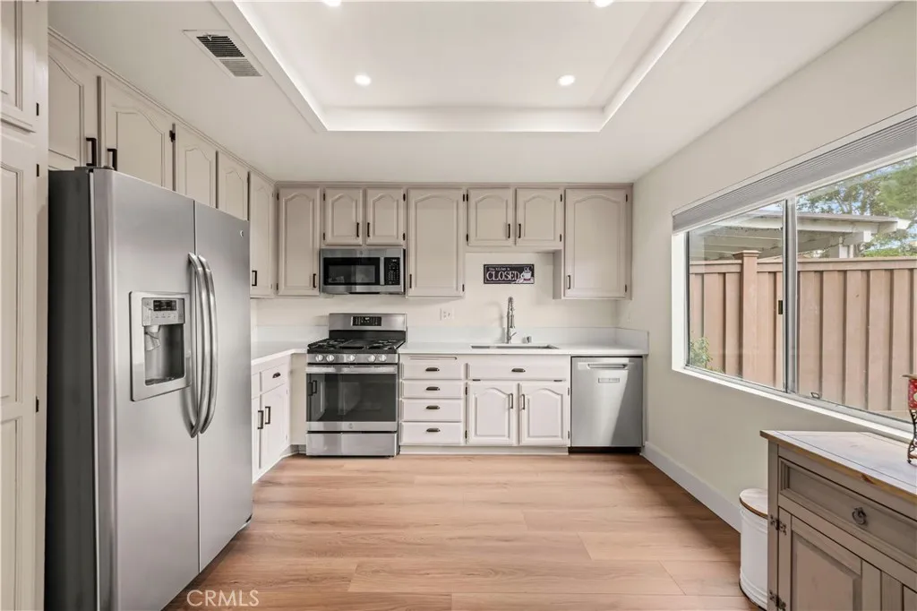 Welcome to the LARGEST and BEST PRICED home in this neighborhood! This beautifully remodeled 4-bedroom, 2-bathroom townhome at the end of the cul-de-sac shows light and bright with fresh, modern updates throughout! The moment you step inside, youre greeted with stunning, newer wood-like flooring in the spacious living room that features a ceiling fan and fireplace and flows seamlessly into your remarkable kitchen, thoughtfully designed with newer quartz countertops, stylish beige cabinetry accented by matte black hardware, sleek stainless steel appliances, newer single-basin sink with a modern commercial style faucet, a pantry, and recessed lighting that brings the whole space to life. Downstairs, you also have one bedroom and a three quarter bathroom with two sinks and walk-in showerperfect as a downstairs primary primary suite or serving family and live-in guests. Upstairs youll find your 3 additional bedrooms and a full bath with one of those bedrooms that stands out with its massive space providing endless possibilities as a game room, theater room, play room, home office, etc., and it even includes a spacious walk-in closet offering flexibility and convenience. Freshly laid sod completes your large and spacious backyard and side yard with no rear neighbors! WiFi enabled washer and dryer is included in the sale and located in your 2 car garage. Youre just a short walk away from some of the HOA amenities including a pool, spa, tennis court, and basketball courteverything you need to stay active and unwind. Not to mention, you're close to lots of shopping, dining, and the
