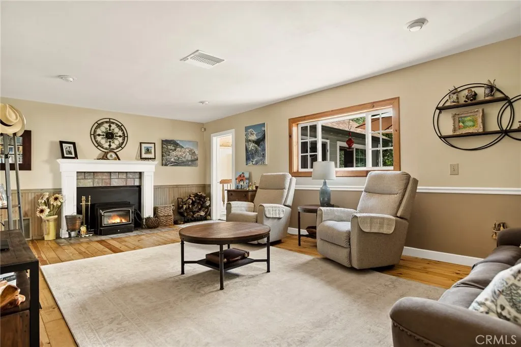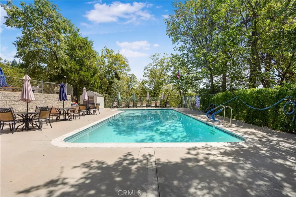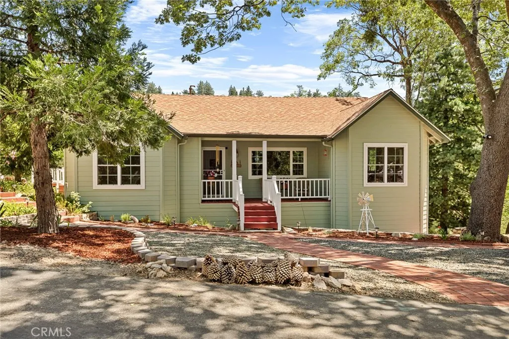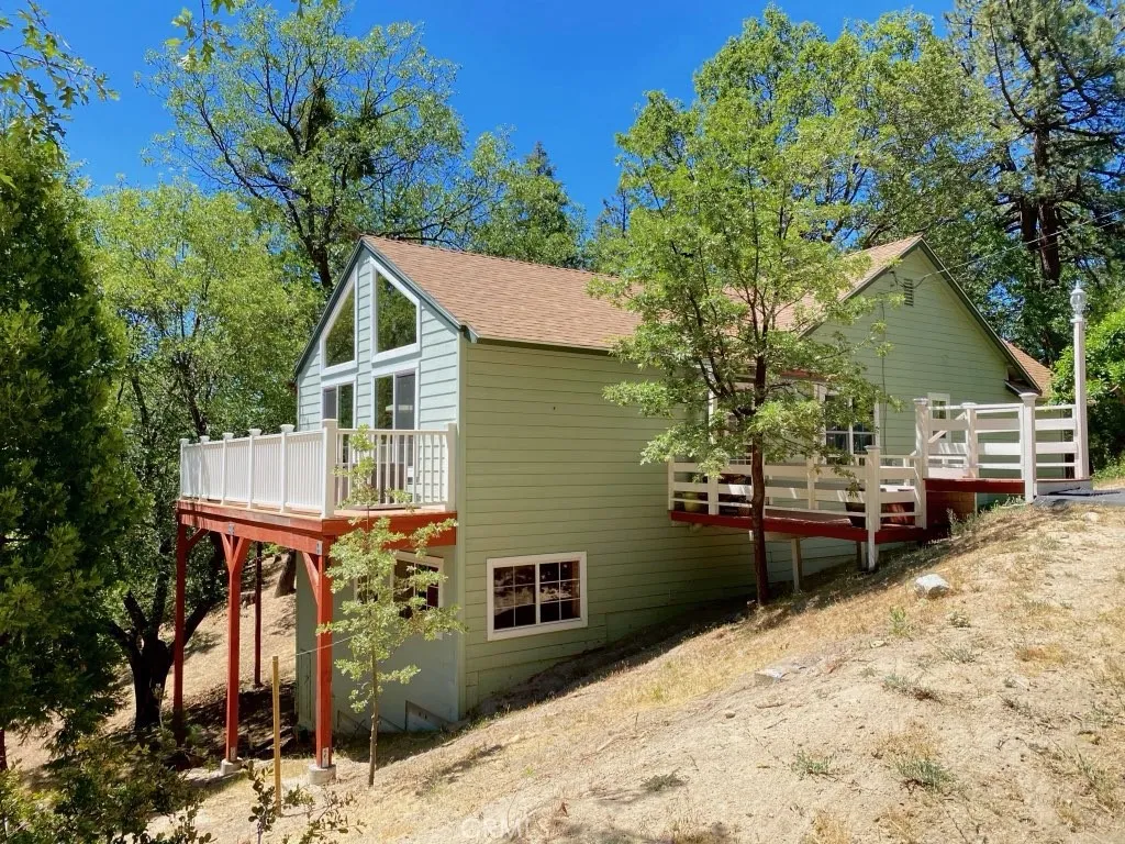 This charming home will steal your heart! Located in the hamlet of Smiley Park Country Club, southeast of Running Springs. Nestled on a cul-de-sac on 1.24 acres among wildlife and trees. The brick walkway invites you to enter this turnkey home from the beautiful covered front porch. The knotty pine floors and views from every room will encourage you to explore! Main floor consists of a living room w/wood burning fireplace w/insert and blower, large family room w/vaulted knotty pine ceiling, country-kitchen, open breakfast nook, dining room which can be used as a den/office, 2 bedrooms, 1 bathroom, large walk-in laundry/utility room with washer & dryer hookups. Entertain family/friends on the spacious wraparound composite deck or just relax, kick-up your feet and enjoy the birds sing in the surrounding oak trees. On the lower level you will find a master bedroom w/sitting area, 1 bathroom, extra large walk-in shower, full size spa, and 2nd laundry room. Adjacent to the large bedroom another bedroom awaits discovery, which could dual as an office, craft/project room with more views! Accessible on this floor is a workshop w/utility sink, lots of available storage areas and access to another small deck. Recent upgrades include a roof (2021 - w/30yr warranty), double hung windows, carpeting, laminate floor (dwnstrs bthrm), hardiboard siding, exterior paint, new dishwasher, and lit fixtures. Having a BIG PARTY, no problem the community clubhouse includes an outdoor pool, BBQ area, recreation room, pool table, and kitchen. Also, enjoy the monthly community activities such as Bingo