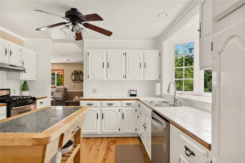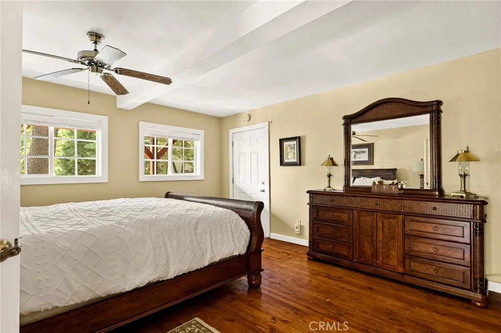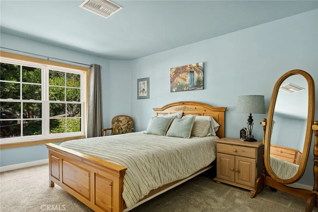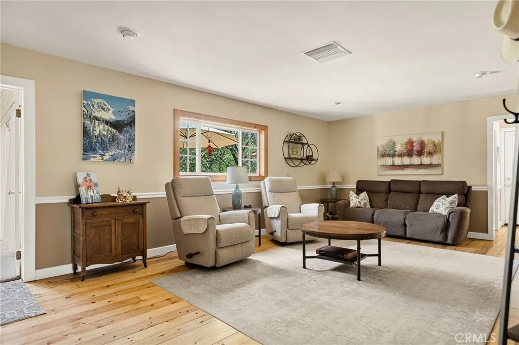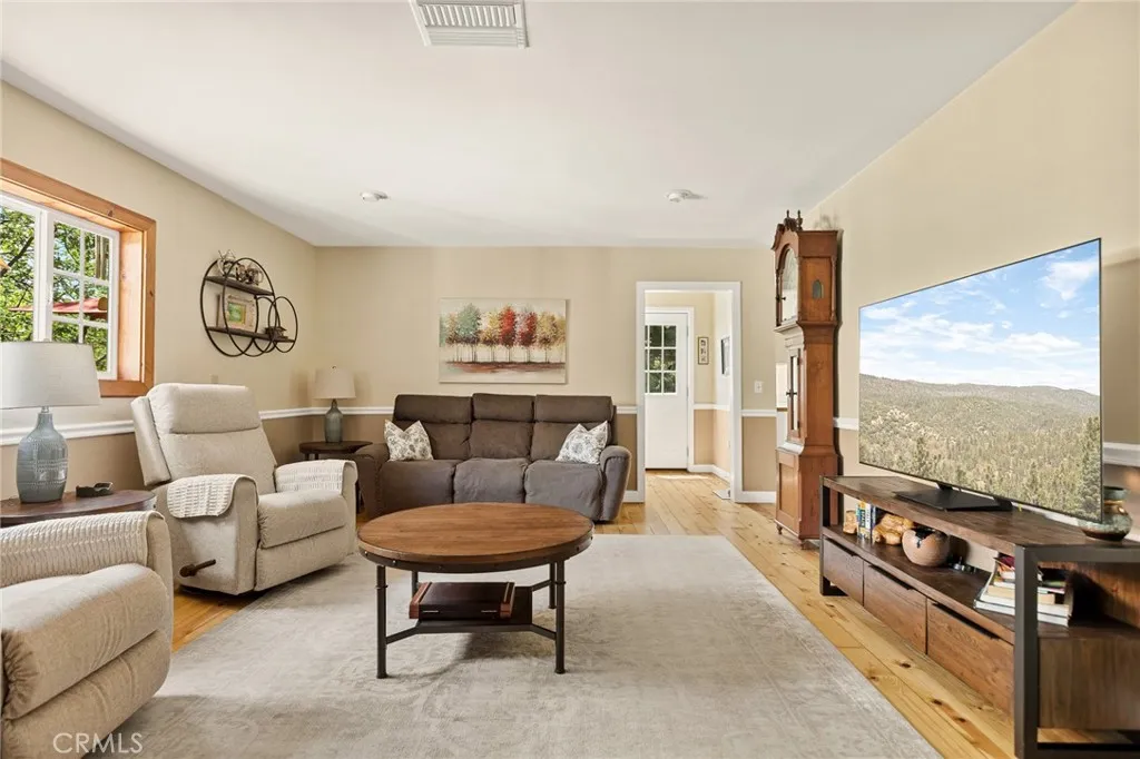 This charming home will steal your heart! Located in the hamlet of Smiley Park Country Club, southeast of Running Springs. Nestled on a cul-de-sac on 1.24 acres among wildlife and trees. The brick walkway invites you to enter this turnkey home from the beautiful covered front porch. The knotty pine floors and views from every room will encourage you to explore! Main floor consists of a living room w/wood burning fireplace w/insert and blower, large family room w/vaulted knotty pine ceiling, country-kitchen, open breakfast nook, dining room which can be used as a den/office, 2 bedrooms, 1 bathroom, large walk-in laundry/utility room with washer & dryer hookups. Entertain family/friends on the spacious wraparound composite deck or just relax, kick-up your feet and enjoy the birds sing in the surrounding oak trees. On the lower level you will find a master bedroom w/sitting area, 1 bathroom, extra large walk-in shower, full size spa, and 2nd laundry room. Adjacent to the large bedroom another bedroom awaits discovery, which could dual as an office, craft/project room with more views! Accessible on this floor is a workshop w/utility sink, lots of available storage areas and access to another small deck. Recent upgrades include a roof (2021 - w/30yr warranty), double hung windows, carpeting, laminate floor (dwnstrs bthrm), hardiboard siding, exterior paint, new dishwasher, and lit fixtures. Having a BIG PARTY, no problem the community clubhouse includes an outdoor pool, BBQ area, recreation room, pool table, and kitchen. Also, enjoy the monthly community activities such as Bingo