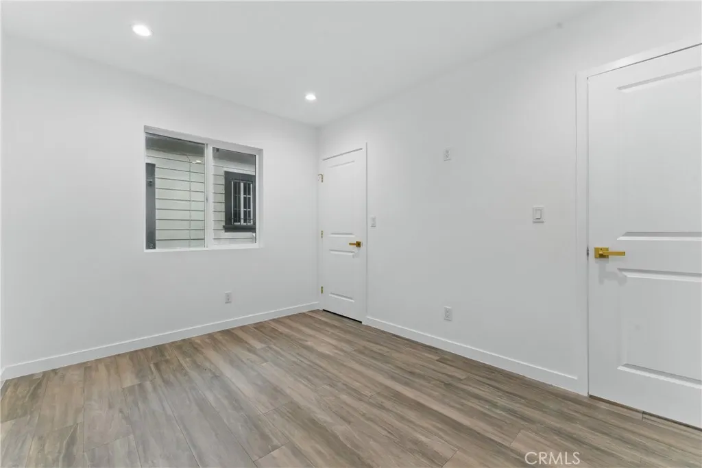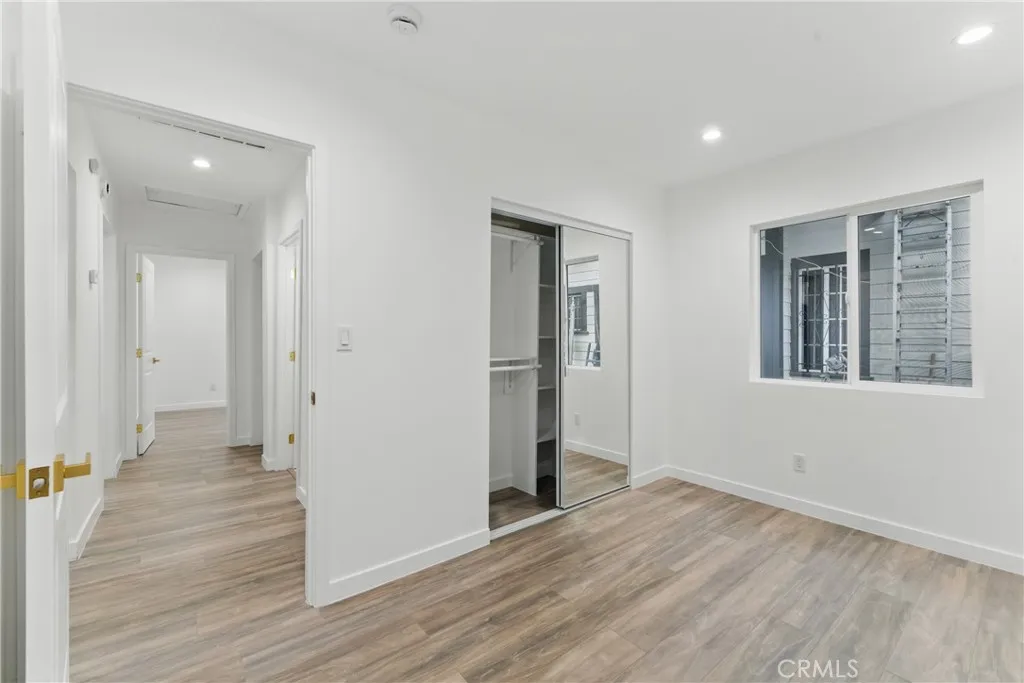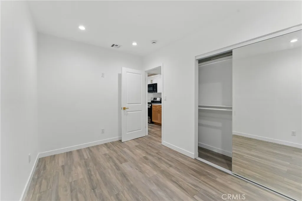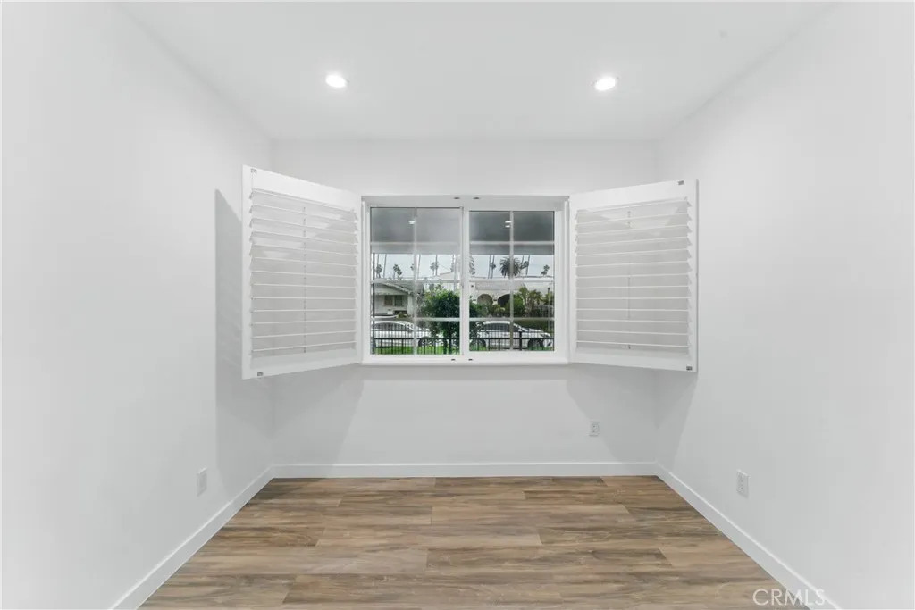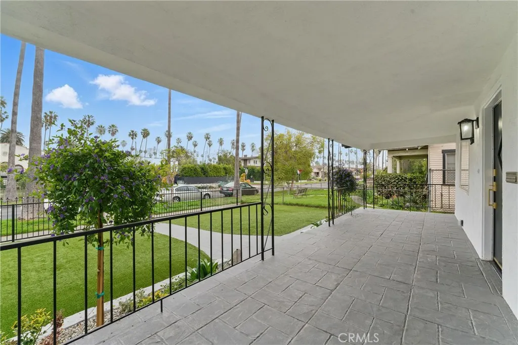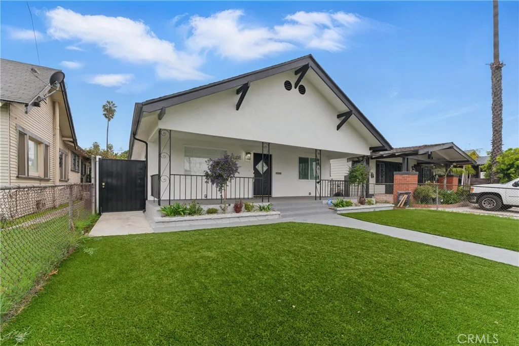 Welcome to this beautiful updated bungalow style home that sits on a tree lined street. The front of the home offers a gated entrance with an astro turf lawn paired with a freshly painted walkway and porch that is perfect to soak in the neighborhood views. Once you enter the home you are welcomed with original coffered ceilings, crown moldings, and wooden shutters throughout the kitchen and living room. This updated home is a blend of originality and contemporary living that offers 4 bedrooms, 2 bathrooms and a stackable laundry closet nook. The home flows seamlessly with an elegant updated kitchen that contains custom natural oak cabinets with an island, pantry, farmers sink, quartz countertops and brand new garbage disposal, microwave, stove and refrigerator. Each bedroom offers adequate space as well as custom shelving for all closets accompanied by sliding mirror doors and walk in style closets. The bathrooms are finished in an exquisite tile design accompanied by custom natural oak cabinets and matching brushed gold vanity and shower fixtures. This home is an absolute gem with a functional HVAC system and upgrades such as new electrical, plumbing, recessed lighting, drywall, laminate flooring, windows, washer dryer hookups, and much more! The backyard is very private with vinyl fencing, a brand new iron gate. There is also a freshly drywalled and painted detached storage that is accompanied with a fresh lawn and gravel parking area. The detached storage and accessible alley offers a great opportunity for an ADU and additional parking! Along with all the beautiful upgra