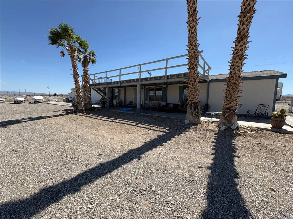 Mountain & River Views! Perfect location with direct, private river/launch access. Welcome to this spacious 1,456 sq ft home, perfectly positioned on 1.32 acres of level, fully fenced land with beautiful palm trees. Offering unparalleled 365-degree panoramic views of both the majestic mountains and winding river, this home is an oasis for those seeking both tranquility and adventure. Sunrises and sunsets are spectacular from your roof top deck. Room for all your outdoor activities! The garage has 1,323 sq ft, boat deep garage with pull through 220 amp in the garage and RV area. Covered breezeway between the house and garage is perfect for shaded patio setting. RV parking with electrical hook up makes it convenient for your RV. The split floor plan home has 4 bedrooms, 2 full baths. Laundry room is easily accessible from the breezeway entrance. Roof replaced 2022. Close to I-40, downtown Needles, Laughlin NV, and Mohave Valley AZ.
