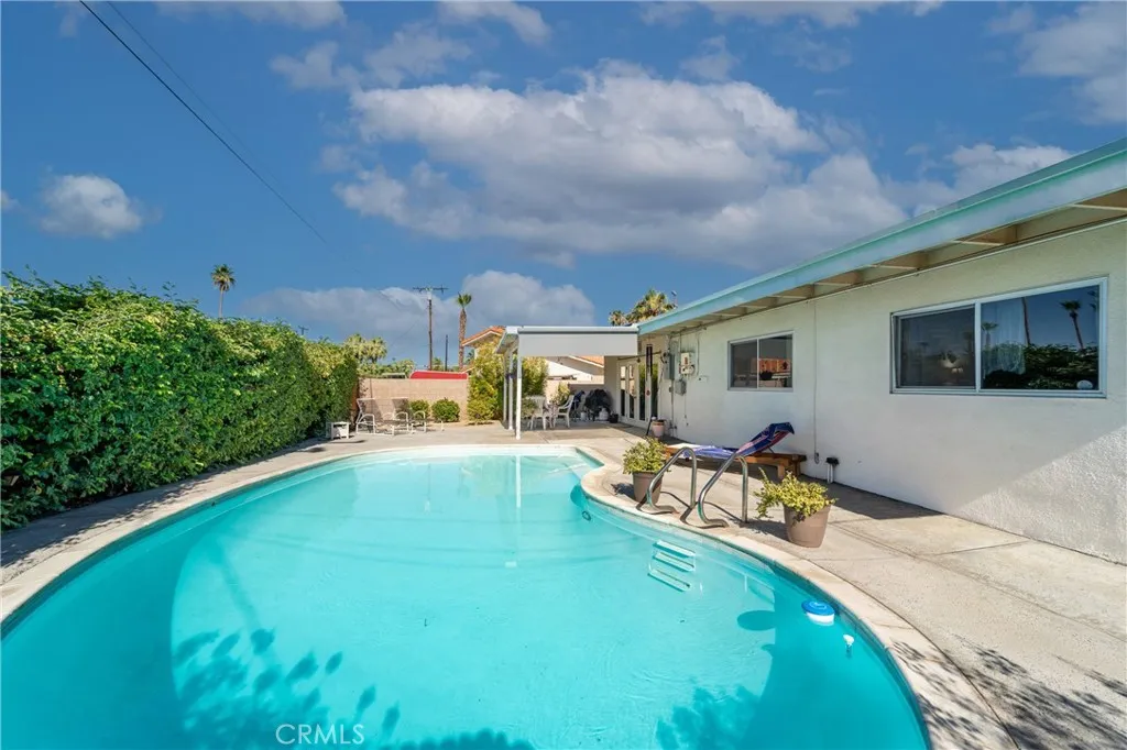 Welcome to this timeless 3-bedroom, 2-bath mid-century modern gem, nestled on an expansive 9,000+ sq ft lot in a quiet cul-de-sac. This well-loved home radiates curb appeal with lush, mature landscaping and classic architectural lines that celebrate its mid-century roots. Step inside to discover light-filled living spaces that blend vintage character with modern updates. The open layout flows effortlessly from the inviting living room to a delightful kitchen and dining area... ideal for both relaxing and entertaining. Outdoors, your private backyard oasis awaits. Dive into the sparkling pool, bask in the sun, or unwind under the shade, all surrounded by vibrant gardens and ample space for lounging, playing, or hosting gatherings. A detached storage shed offers extra convenience for your hobbies or gear. Whether you're a design enthusiast or simply looking for a charming home with room to grow, this property offers endless potential in a peaceful, sought-after setting. Tucked away in a serene neighborhood yet just minutes from upscale shopping and dining on El Paseo, scenic hiking trails, and everything Palm Desert has to offerthis home delivers the ideal desert lifestyle. Mid-century magic, modern ease, and unbeatable locationcome experience it for yourself. Dont miss your chance to own a slice of mid-century magic!