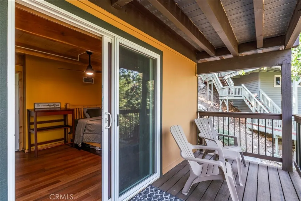 Perched on five spacious lots with sweeping views of the San Gabriel Mountains, this beautifully updated 3BR, 1.5BA home offers the perfect blend of mountain charm and modern upgrades. Originally a 2BR/1BA, the home underwent a complete transformation starting in 2018, taken down to the studs and rebuilt with a fully permitted renovation that added a third bedroom and a half bath. Spread across three levels, the thoughtful floor plan offers both privacy and flexibility, making it ideal for hosting family and friends. Throughout the home, you'll find rich Brazilian Cherry hardwood floors, tongue and groove wood ceilings with exposed beams, and new dual-pane windows and sliders that bring in abundant natural light. The main-level entry opens to a chef-style kitchen featuring a large center island, solid marble countertops, undermount stainless steel sink, solid wood cabinetry with soft-close drawers, stainless-steel appliances, and a breakfast bar. The adjacent dining area flows effortlessly into the living room, which is anchored by a wood-burning stove, a charming bay window, and access to the main deck, perfect for taking in the serene forest and mountain vistas. Also on the main floor is a convenient stackable laundry area. Upstairs, 2 bedrooms with vaulted ceilings, remote controlled ceiling fans, knotty Alder wood doors and trim, and a full bath with Italian porcelain tile and a deep soaking tub create a cozy retreat. The lower level hosts the 3rd bedroom and 1/2 bath, along with its own private deck and separate exterior access, an excellent option for guests or a rent