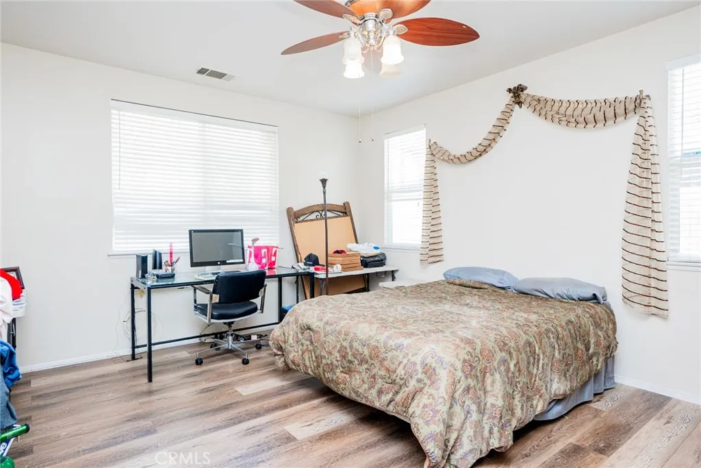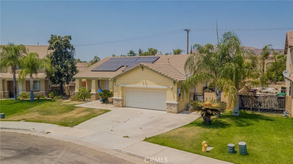 Welcome to 26110 Primrose Way, a beautiful single story 3 bedroom, 2 bathroom home sitting on a large 11,700sqft lot is nestled in a quiet and family-friendly neighborhood of Moreno Valley. Property is well maintained, has a great floor plan, spacious living areas, indoor laundry and a large backyard great for entertaining, small basketball court, and potentially a swimming pool and RV parking. As you enter, you're greeted by a bright and airy living room with plenty of natural light that flows seamlessly into the dining area and kitchen. The kitchen boasts ample cabinetry and a convenient breakfast bar, making it a perfect space for family gatherings. Step outside to the expansive tiered backyard, where youll see several fruit trees, a lemon, grapefruit, plum and avocado tree with mostly concrete the yard is low maintenance. Additional features of the home include an attached two-car garage, central air conditioning, and Paid Off Solar's. Easy access to local shops, schools, parks and freeway. Dont miss out on the opportunity to own this beauty!
