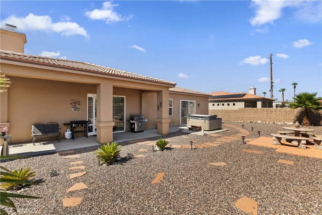 Nestled in the scenic hills of Desert Hot Springs, this charming single-story home offers serene desert living with breathtaking mountain views. Featuring a spacious open floor plan and 10 foot ceilings, the home boasts three bedrooms and two bathrooms, including a primary suite with a large walk-in closet, soaking bathtub, double sinks, and plenty of space to unwind. Upgrades include newer kitchen appliances and dual ac unit. The guest bath is equally impressive with a double vanity, providing convenience and style. Step into the bright and airy living area, where large windows with custom shutters fill the space with natural light. The cozy fireplace in the living room is perfect for those cool desert evenings. The modern kitchen is equipped with granite countertops, ample cabinet space, making it ideal for culinary enthusiasts. For added convenience, the home includes a laundry room with a sink, making chores easier and more efficient. The large backyard is a true oasis, offering gorgeous mountain views and a low-maintenance landscape perfect for relaxing or entertaining. It also features an above-ground hot tub, providing the ideal spot to unwind while enjoying the deserts stunning scenery. This home features a two-car garage and RV parking (42 feet long!), providing ample storage space and convenience. Located in a quiet neighborhood, this property offers both privacy and tranquility while being just a short drive from local amenities, schools, and downtown Palm Springs. Solar payment averages $150 a month for electricity. Dont miss the opportunity to make this your de