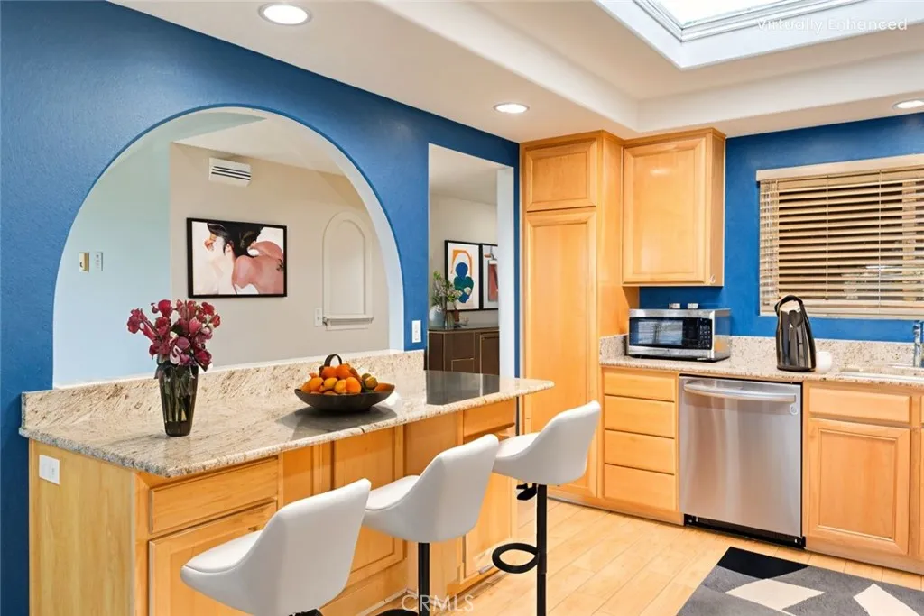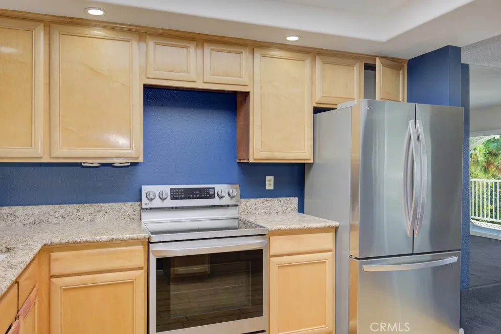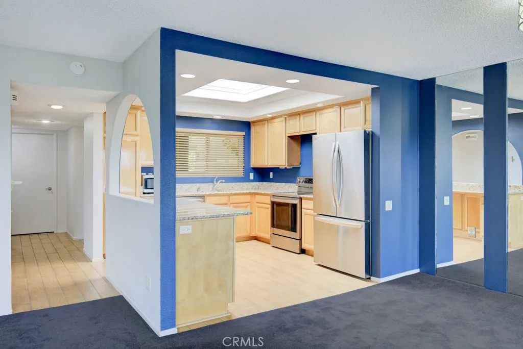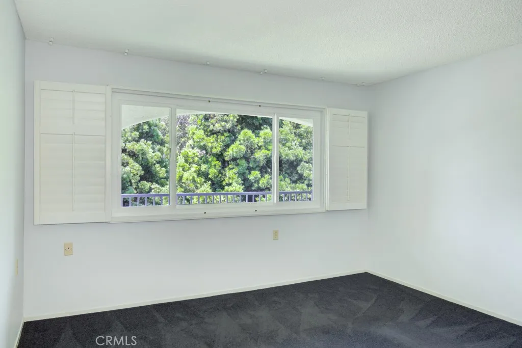 EXPERIENCE THIS HOME BY CLICKING ON THE 360's - An elevator takes you practically to the front door of this beautifully upgraded, top floor VILLA NUEVA model, with oh, what a view! This home is perched atop a hill, surrounded by trees and greenery. Enjoy vistas of the neighborhood, valley lights and Saddleback Mountain, and nearby access to the 73 Toll Road. The heart of the home an extraordinary, transformed kitchen features custom cabinetry topped with luxurious slab granite and high-quality LG appliances. A rare skylight fills the space with natural light. Elegant ceramic tile floors mimic wood while offering water resistance. An ingenious bar under the arched opening connects the kitchen to the living room perfect for a casual bite or storing large serving pieces. The kitchen opens to the dining area and living room, making entertaining easy. The dining rooms mirrored wall reflects the sweeping view through large glass doors, drawing your eye outdoors to the serene neighborhood and trees below. The generous living room features lush slate-gray carpet with extra-thick padding and a large dual-paned window that frames the view and welcomes coastal breezes. A central hallway leads from the front door through the main living areas, and in the opposite direction to bedrooms and bathrooms. The guest bedroom offers a peaceful view of the trees through dual-pane windows with plantation shutters, plush carpet, a large closet, and space for a queen-sized bed. The adjacent guest bathroom features a vanity, tub with newer shower door and fixtures. Welcome to the Primary Suite y