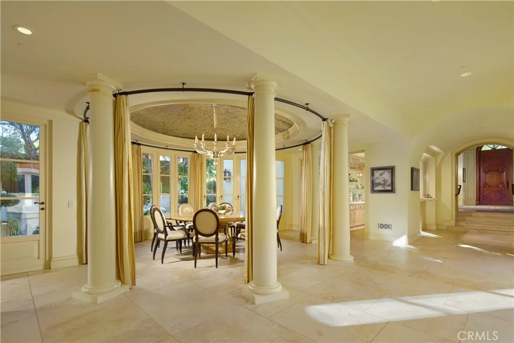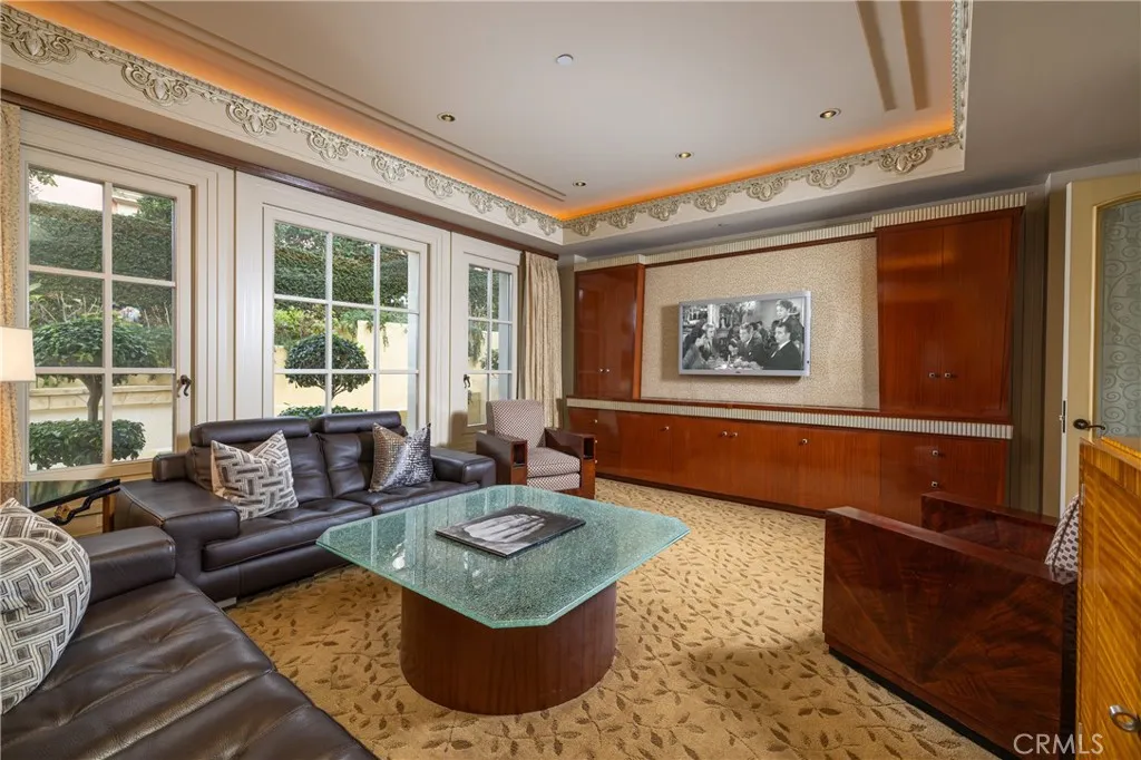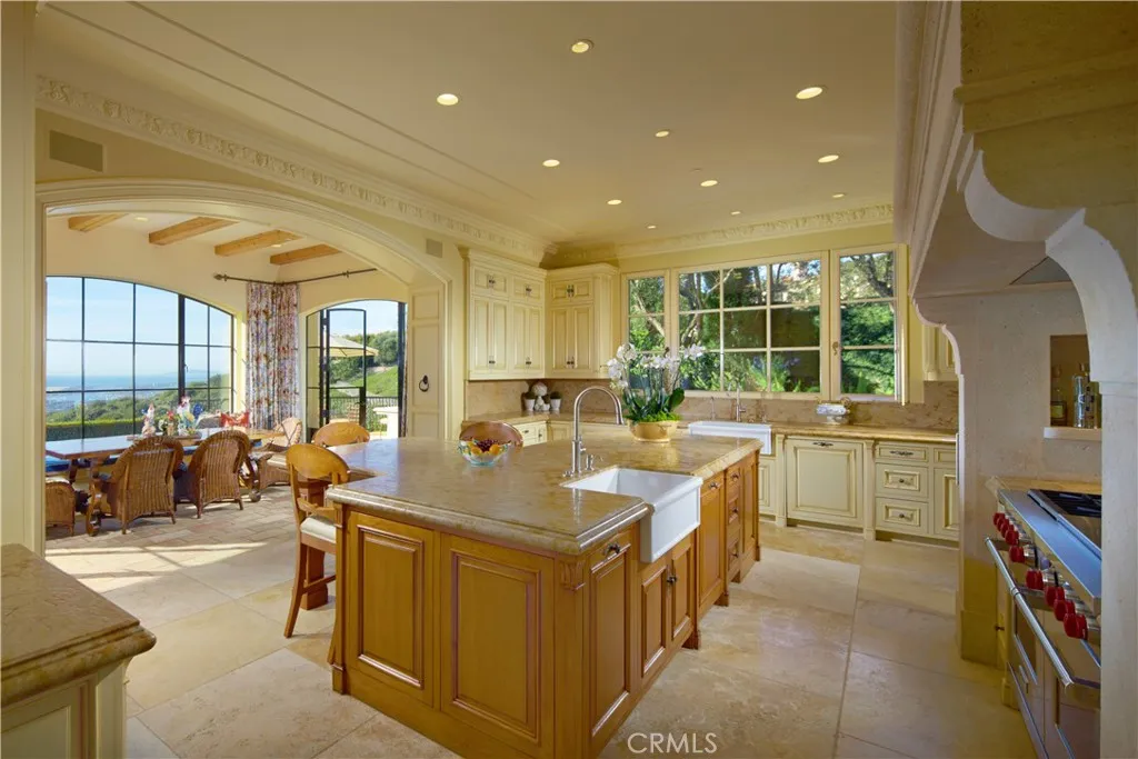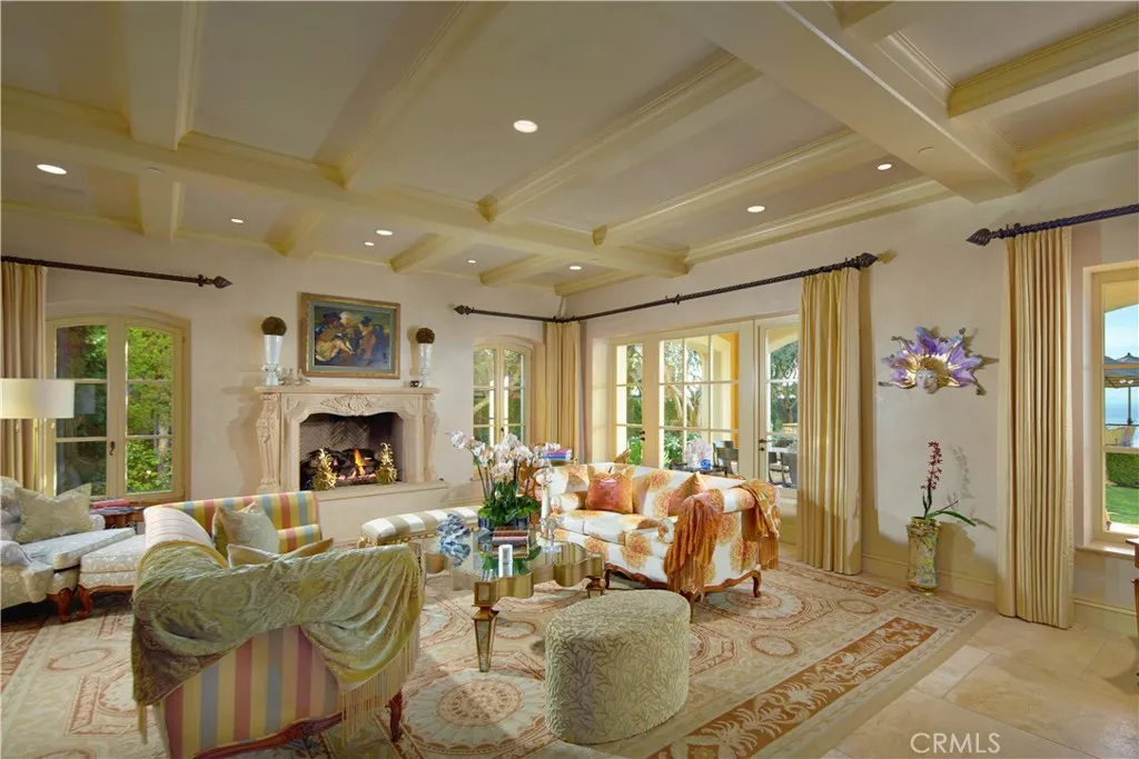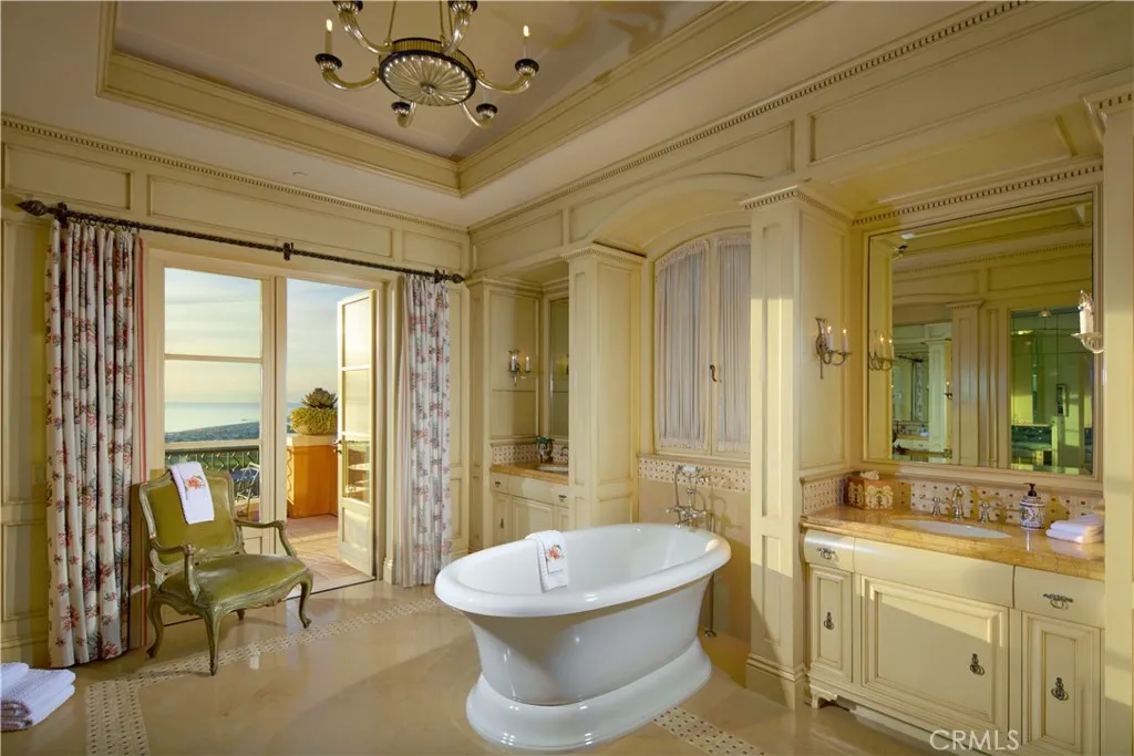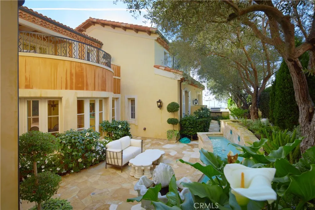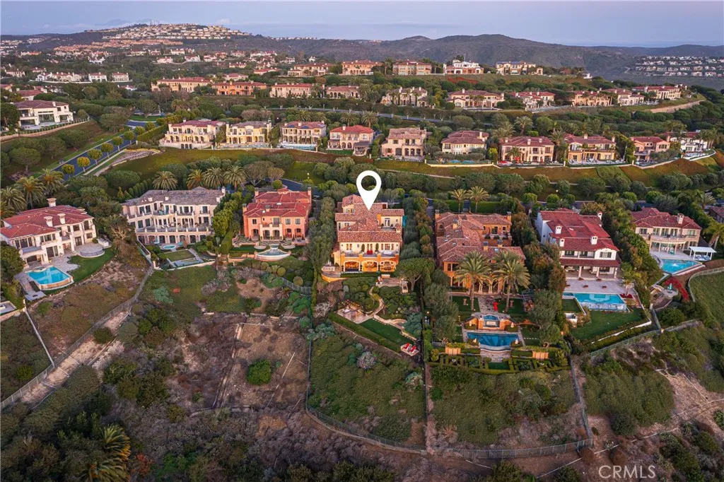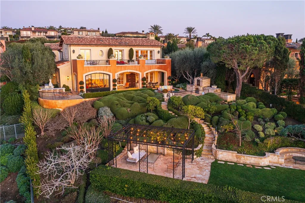 Ever-changing by day and night, the phenomenal panoramic views of 'Villa Saffron' are in a league of their own. They are experienced from both levels of the St. Tropez-inspired villa at guard-gated Pelican Crest in Newport Coast. The immersive vistas stretch across lush fairways, a canyon, the azure waters of the Pacific Ocean, Newport Harbor, San Clemente and Santa Catalina Island. Enchanting city lights reach as far as Palos Verdes. The terraced grounds tower 604 feet above sea level. They command front-row views that complement a backyard with upper and lower terraces, four lawn areas, loggias, custom fireplace/wood-burning pizza oven. The outdoor kitchen features a built-in 48" Lynx BBQ. Located close to the end of a private cul-de-sac, the villa showcases exquisite landscaping, a walled and gated front yard with a limestone colonnade pool, and a large, fireplace-warmed atrium. Spanning nearly 26,092 SF, the estates sumptuous homesite by EBTA architects, built by PrideMark, compliments an opulent interior that extends approximately 8,176 SF. It features four en suite bedrooms (one at entry-- currently used as an office), four full baths, and two half baths. An inviting foyer and grand staircase provides an elegant introduction to living areas including a media room, sunny office with enchanting views, a circular formal dining room surrounded by columns, and a spacious great room with an ornate hand-carved limestone fireplace. The chefs kitchen boasts an oversized island, ocean-view breakfast room, butlers pantry, two sinks, stone countertops, custom cabinetry, built-in