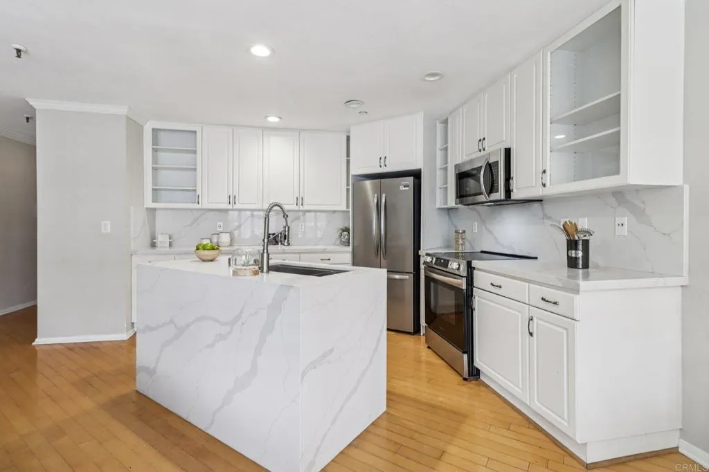 VA-Approved (And VA Assumable Loan at 2.75% Rate, limitations apply) Turn-Key 2-Bedroom Condo in the Heart of Cortez Hill with 2-Car Parking. Located in one of downtown San Diegos most charming and quiet neighborhoods, this bright and stylish 2-bedroom, 2-bath condo offers the perfect blend of comfort and conveniencecomplete with 2 dedicated parking spaces. The open-concept kitchen features stainless steel appliances, crisp white cabinetry, a center island with large stainless steel sink, and white countertops with matching backsplash. The living room is warmed by a gas fireplace, and enhanced by crown molding, plantation shutters, and wood flooring throughout the main living areas. Soaring statement windows invite an abundance of natural light and add architectural drama, creating a bright and airy feel throughout the space. The spacious primary suite includes two closetsa walk-in and a mirrored sliding doorand a large ensuite bath with dual sinks, a soaking tub with shower overhead, and an extended vanity with abundant counter space. Additional highlights include new carpet, full-size laundry closet with washer and dryer, and central AC for year-round comfort. Enjoy life in Cortez Hill, one of downtowns best-kept secretspeaceful, residential, and walkable, with plenty of free street parking (a rare find downtown!) and easy access to nearby freeway onramps for a quick commute anywhere in the city. Residents also enjoy access to community amenities including a private spa lounge with a soothing vibeyour perfect escape in the heart of the city.