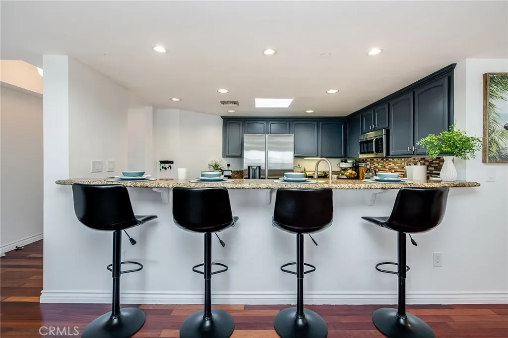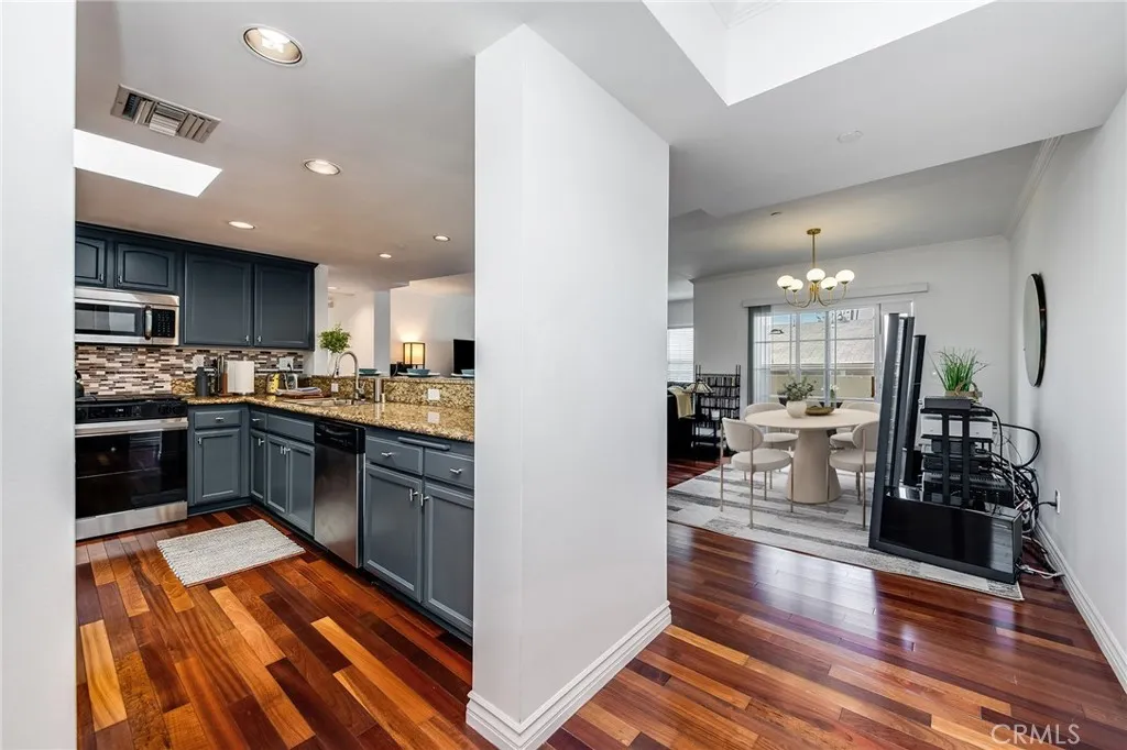 Welcome to this top-floor stunner in a boutique 15-unit Mediterranean-style building with an open-air courtyard, right in the heart of Valley Village! This bright and airy 2-bedroom penthouse is full of charm, flooded with natural light from skylights throughout and warm wood floors underfoot. The updated kitchen shines with stainless steel appliances, new fixtures, and refinished solid wood cabinets. One bedroom includes a spacious walk-in closet, and both feature brand-new carpet. A smart home setup offers voice-activated lighting, an Ecobee thermostat, smart lock, and video doorbellmodern convenience at its finest. Enjoy the ease of an in-unit washer/dryer combo and your own private outdoor space. Gated, assigned underground parking is included. All of this in an unbeatable location close to shops, restaurants, and everyday essentials, with easy access to major studios and the Westside. Located in the highly regarded Colfax Elementary School district (buyer to verify). This is Valley Village living done right!