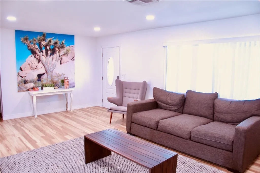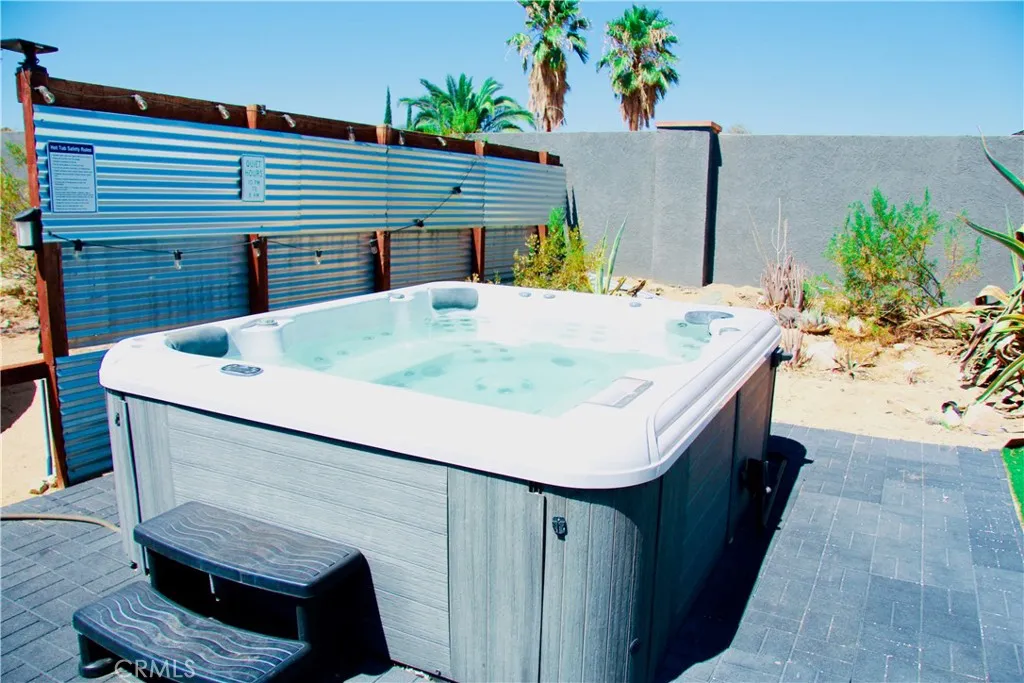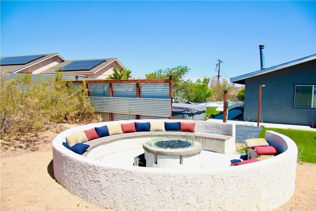 This meticulously updated property in Joshua Tree offers the perfect blend of modern luxury and natural beauty, making it an ideal primary residence, vacation home, or short-term rental investment. Step inside this 3-bedroom, 2-bathroom home and discover a sanctuary designed for comfort and relaxation. The fully renovated kitchen boasts quartz countertops, stainless steel appliances, and even two TVs built into the backsplash so you can enjoy your favorite shows while you cook. The large island flows seamlessly into the bright and spacious living area, complete with recessed lighting, a cozy fireplace, and expansive windows that frame the stunning desert landscape. For entertainment, there's even a fun karaoke corner. Each bedroom provides a peaceful escape with cooling fans and hardwood floors. The converted garage offers a dedicated playroom for kids, ensuring peace and quiet for everyone. Explore the indoor 3D tour to truly experience this dream setting. Situated on a spacious corner lot, the expansive outdoor space is an entertainer's dream. Enjoy the desert sun by the pool and spa, gather around the outdoor fire pit, or host dinner parties on the covered patio. The fully secure and fenced backyard provides peace of mind. This home also features energy-efficient systems, solar panels and an EV charger, adding to its modern appeal. Plus, it's just minutes from Joshua Tree National Park. With its full renovation, desirable location, and excellent revenue potential, this property is a truly remarkable investment. Don't miss this opportunity to own this turnkey desert oasis