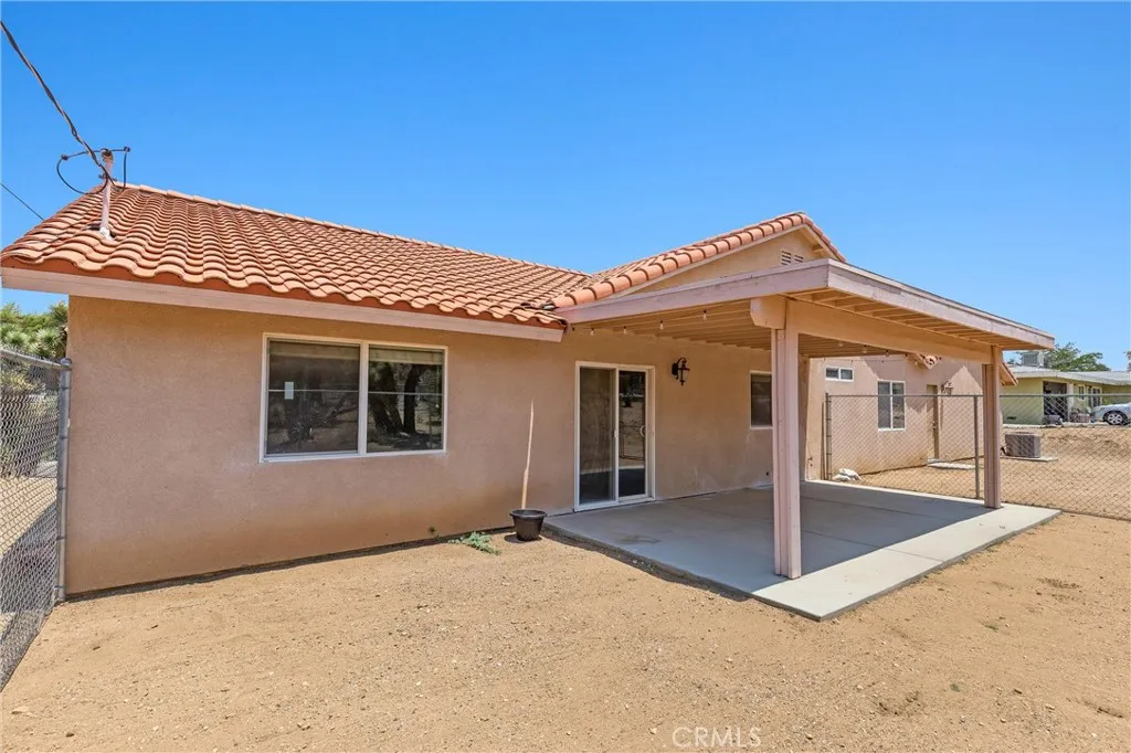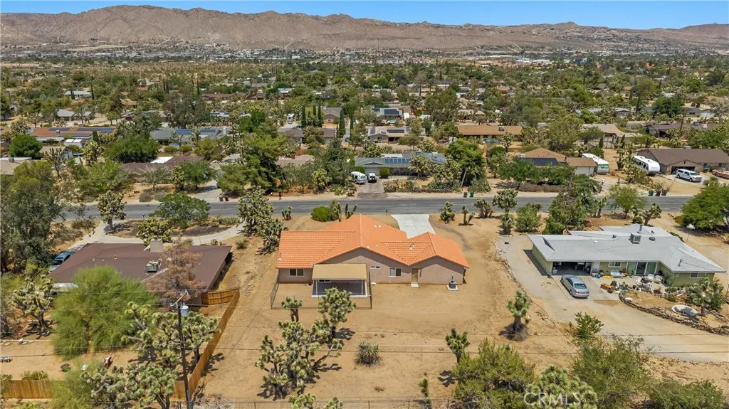 Welcome to your desert oasis! This beautifully maintained 3-bedroom, 2-bathroom home sits on a spacious lot in the Storey Park neighborhood of Yucca Valley. Step inside to an open-concept living area with high ceilings, abundant natural light, and plenty of room that makes the space perfect for entertaining or relaxing after a day exploring the nearby Joshua Tree National Park. The kitchen boasts modern appliances, ample counter space, and a breakfast bar ideal for casual dining. The primary suite features a walk-in closet and an en-suite bathroom with dual sinks. Two additional bedrooms provide plenty of space for guests or a home office. Outside, enjoy the tranquility of desert living with a large covered patio, low-maintenance landscaping, and a partially fenced backyardperfect for star-gazing nights or outdoor gatherings. Located just minutes from local shops, restaurants, and outdoor recreation, this property offers the perfect combination of privacy and convenience!