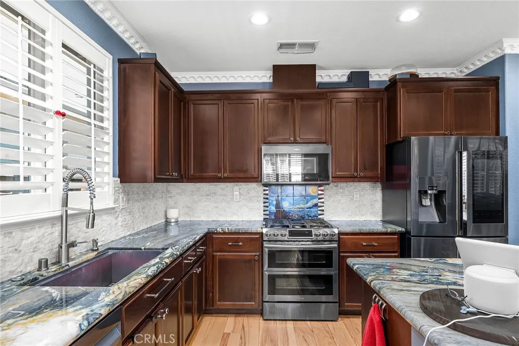 Welcome to 3223 Sespe Creek Way, where luxury, technology, and thoughtful design come together in perfect harmony. From the moment you arrive, it's clear that no detail has been overlooked. This exceptional home is more than just a place to live; it's an experience. Nestled in a peaceful neighborhood, this residence has been custom-tailored to provide Solar with backup, entertainment, and comfort for the modern lifestyle. Step through the custom glass storm door and into a world of elegant finishes where crown molding, plantation shutters, designer lighting, and polished engineered hardwood flooring orchestrate a warm and sophisticated ambiance. Guests are welcomed to a wet bar unlike any other. Featuring imported Brazilian granite countertops, a custom granite sink, triple reverse osmosis systems, dual beverage and wine refrigerators, programmable hot/cold/alkaline water dispensers, and a double-sterilized ice machine, all exquisitely backlit to elevate any gathering. The open-concept living area was built to impress, with a media wall outfitted for an 84" TV and surround-ready, custom cabinetry, fireplace, and tray ceilings. The chef's kitchen is a showstopper with its matching Brazilian granite, hand-painted tile backsplash, black stainless steel Flex duo smart appliances, and a Smart HUB fridge with designer package. A matching granite lazy Susan ties it all together in the breakfast nook. Entertain with ease or unwind in style; this home was designed for both. The spacious primary suite offers French door access to the backyard, a luxurious bathroom retreat with a Vene