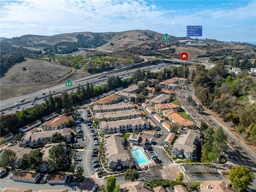 Welcome Country Villas in Phillips Ranch ! Beautifully high ceiling two-story townhome style condo, featuring 3 bedrooms Upstairs. Spacious open-concept kitchen connects seamlessly to a living-dining area filled with natural sunlight. A stairwell skylight fills the stairwell with natural light. Living room, stairwell and bedrooms feature laminate flooring while the Kitchen and Baths have floor tile. A hallway closet features a stackable washer & dryer included. This unit features a front wrap around patio for enjoyment. This unit Comes with one shared garage and one unassigned parking space with permit. Complex amenities include Junior Olympic size pool, four spa's, picnic areas, playground areas and multiple grassy areas. Near to local shopping such as Winco, Walmart, The Shoppes of Chino Hills, movie theater, restaurants, parks, walking trail, dog parks and golf courses, with easy access to 71, 60, 10 and 57 freeways. HOA covers water, trash, exterior building maintenance, landscaping and provides security patrol.