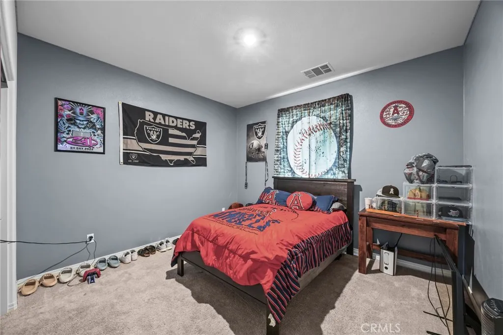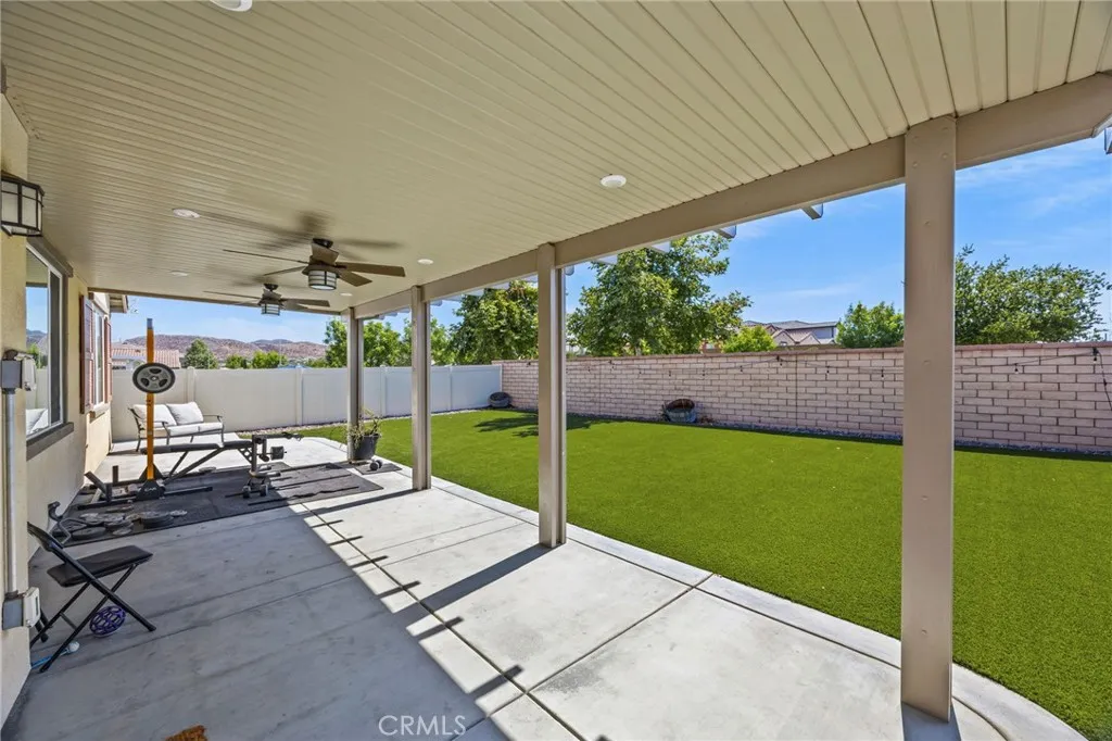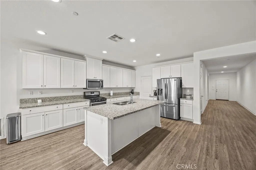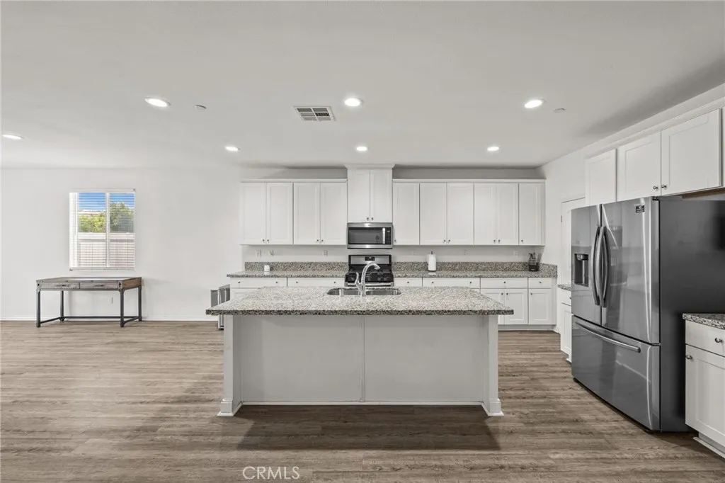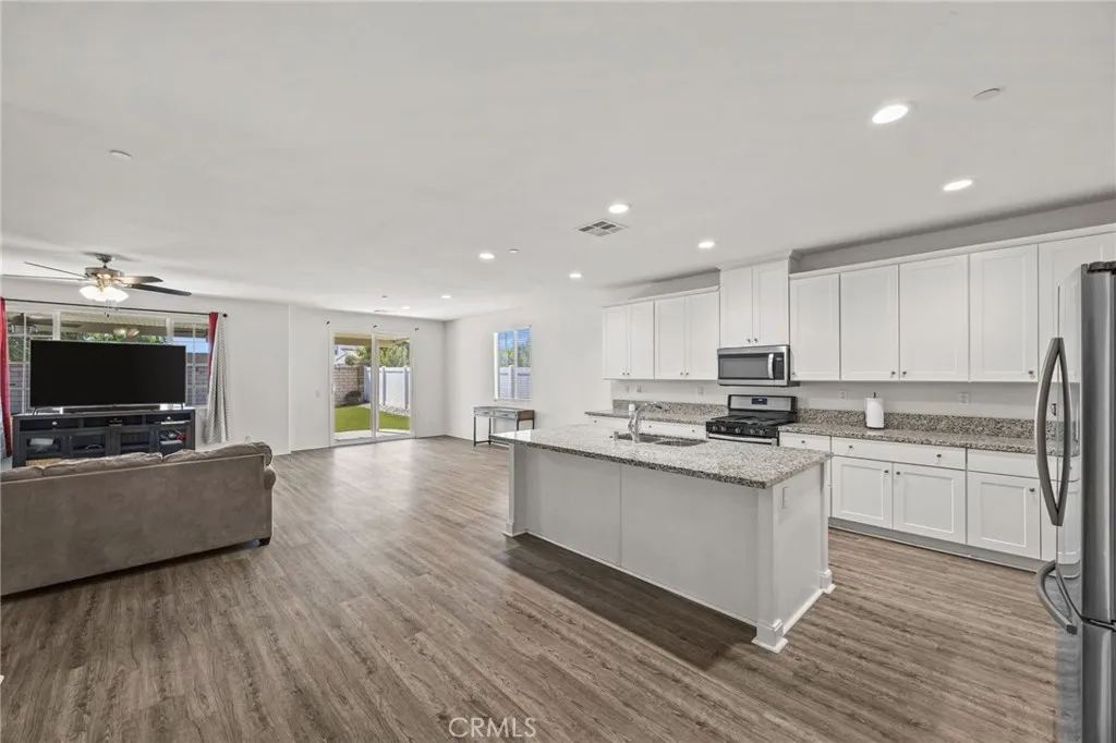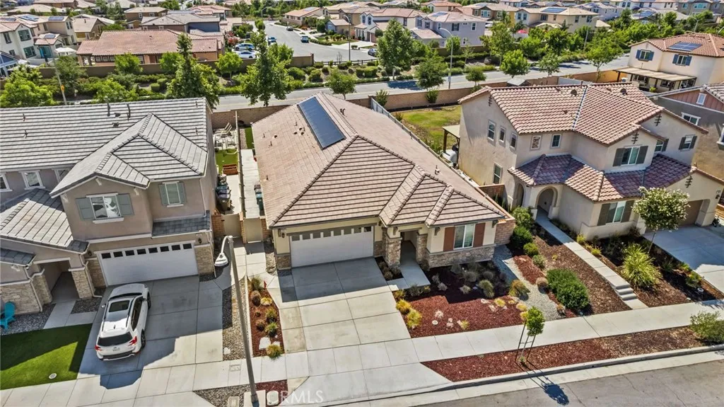 Welcome to this stunning single-story home nestled on a peaceful cul-de-sac in the highly sought-after Audie Murphy Ranch community. Featuring 3 spacious bedrooms, 2.5 bathrooms, and a flex room/office that could serve as a 4th bedroom, this home offers an ideal layout for both comfort and functionality. Step inside to an open-concept living space with luxury vinyl plank flooring. (Bedrooms are carpeted) The heart of the home is the gourmet kitchen, white shaker cabinets with granite counter-tops, complete with a large island, walk-in pantry, stainless steel appliances and ample counter spaceperfect for entertaining or casual family meals. The main bedroom suite boasts a walk-in closet and a luxurious ensuite bath with a separate soaking tub and walk-in shower. Each additional bedroom is generously sized, and the home includes three full baths for ultimate convenience. Enjoy energy efficiency with owned solar, a tankless water heater, and a low-maintenance, eco-friendly yard. The front yard is drought-resistant, while the backyard features Envirofill Ultimate Pet Systems artificial grass, ideal for pets and play. (Dog run on the side of the house is included.) Relax under the vinyl-covered patio with recessed lighting and ceiling fansa perfect outdoor retreat year-round. Located in the spectacular Audie Murphy Ranch community with access to resort-style amenities, including pools, spas, sports courts, lush parks, playgrounds, a clubhouse, winding trails and more! BONUS: the beach is about 1 1/2 hour drive! Great price and great location.
