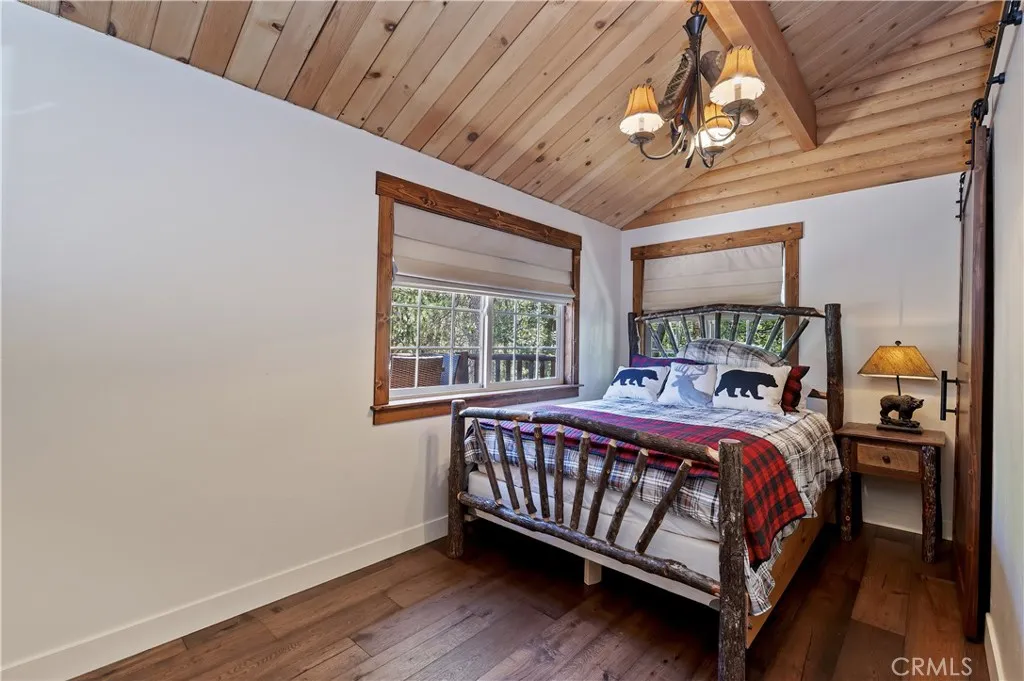 Shows like a brand new home! Master craftsmanship throughout this amazing cabin includes custom kitchen cabinets, custom lighting, custom doors, beautiful highly upgraded bathrooms and kitchen. You will enjoy several decks to marvel at nature and the seasonal creek that runs behind the house! The new side deck is HUGE and ready for you and your guests as well as a spa deck which overlooks the canyon with upper and lower decks for dining or viewing nature!. The home has a new roof, and new electrical throughout as well as luxury vinyl plank flooring, custom roman shades for the windows, a light and bright interior and comes fully furnished! The cement parking pad is so convenient, with just a few steps to the front door. This is the home for the buyer who values quality construction and fine finishes. The floorplan features a greatroom on the main level with 2 bedrooms and luxury bathroom, downstairs is a den/game room and master suite. Beautiful new windows let the sunshine into your fabulous pride of ownership mountain home! Close to Bear Mountain, lake and village of Big Bear Lake.