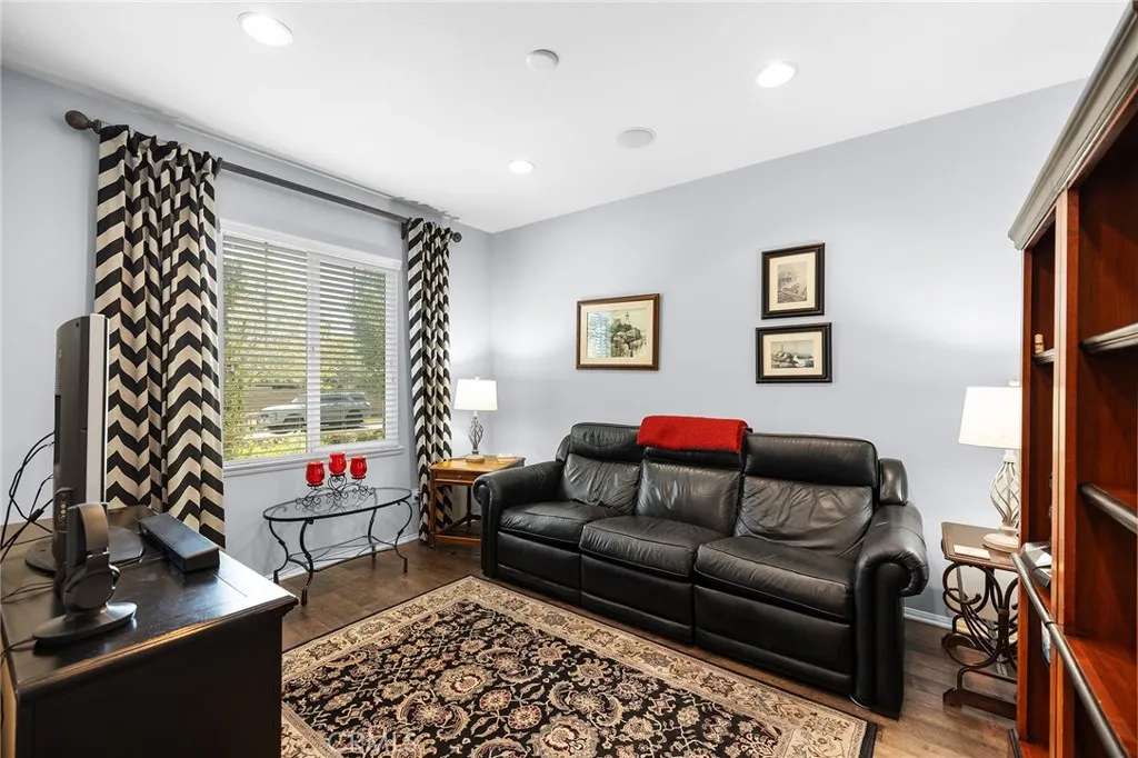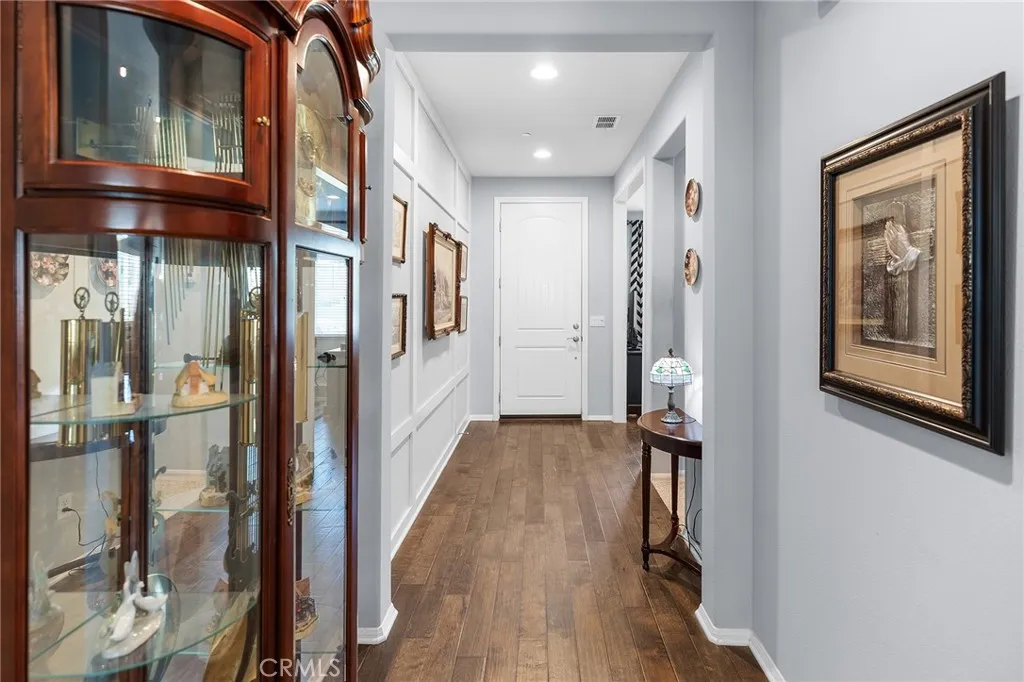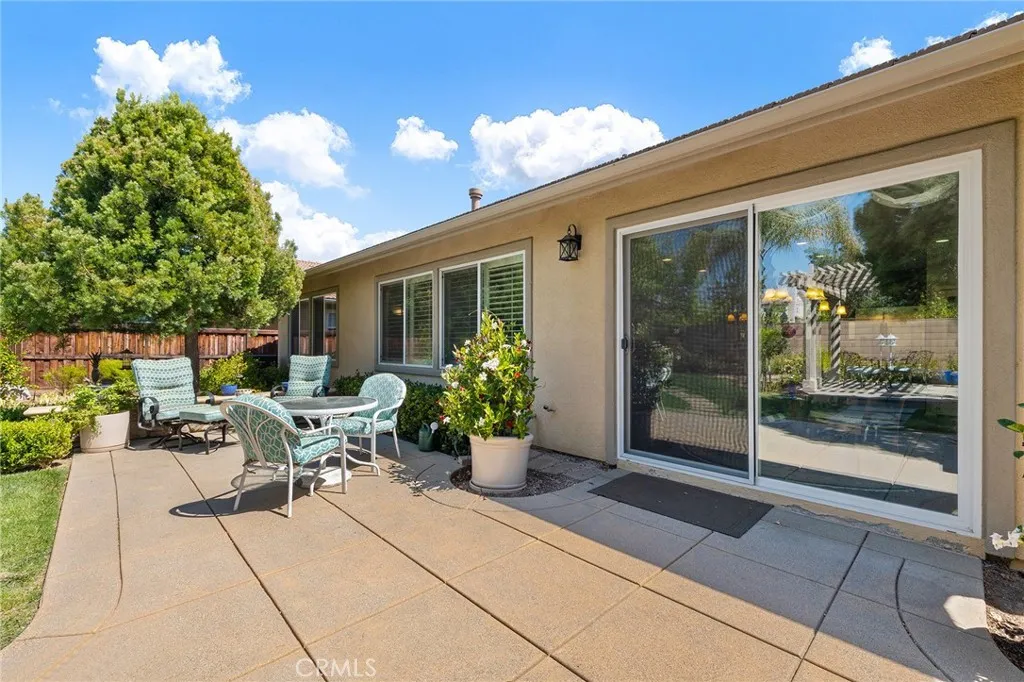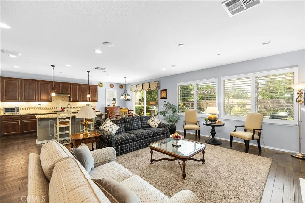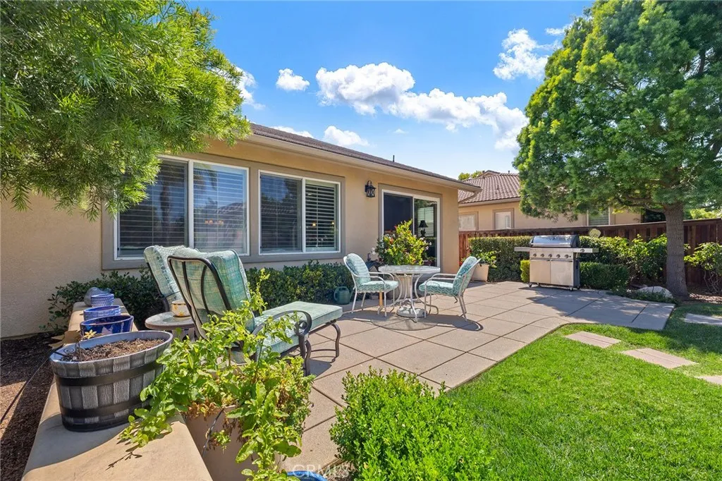 Discover this stunning formal model home nestled in the prestigious Heritage Lakes community of Menifee, where luxury meets comfort in every detail. This exquisite single-story residence boasts 3 spacious bedrooms plus a versatile den, thoughtfully designed with over 2,300 square feet of meticulously planned living space. The intelligent floor plan strategically positions the secondary bedrooms and master suite at opposite ends of the home, ensuring optimal privacy and tranquility for all occupants. The impressive 3-car tandem garage provides abundant storage and parking, while the interior showcases elegant engineered hardwood floors flowing seamlessly throughout the common areas, perfectly complemented by brand new plush carpeting in all bedrooms. The heart of the home features a magnificent family room anchored by a stunning fireplace flanked by beautiful built-in bookshelves on both sides, creating an atmosphere of sophistication and warmth. Premium plantation shutters grace every window, offering both style and privacy, while integrated speakers throughout the home provide the perfect soundtrack for daily living and entertaining. The exterior commands attention with beautiful curb appeal that reflects the pride of ownership evident in every corner of this immaculate property. Step into the backyard oasis where beautifully landscaped grounds create a peaceful retreat perfect for relaxation and outdoor gatherings. Comfort is assured year-round with a brand new compressor and evaporator unit featuring dual zone HVAC control, allowing personalized climate management throug