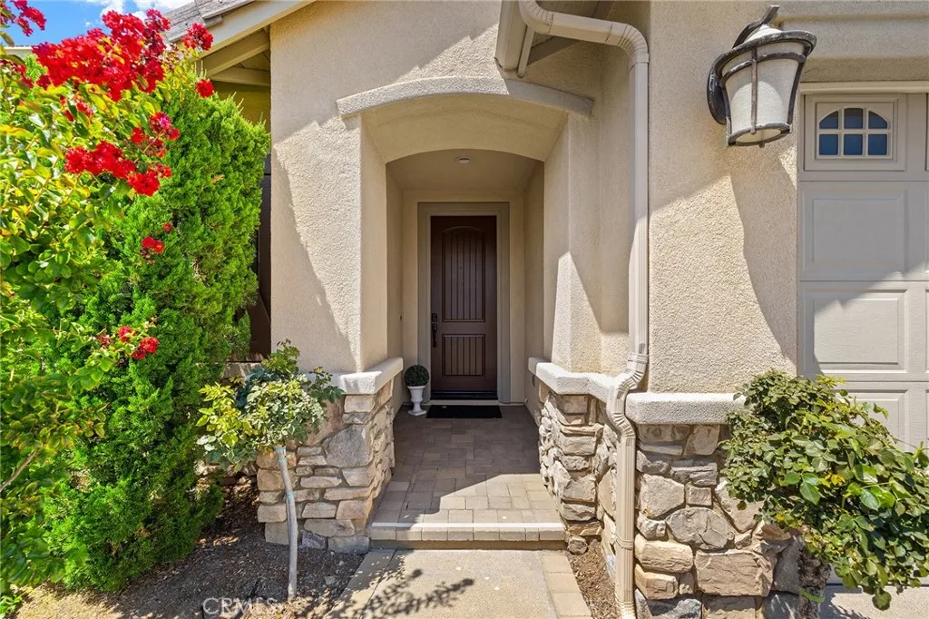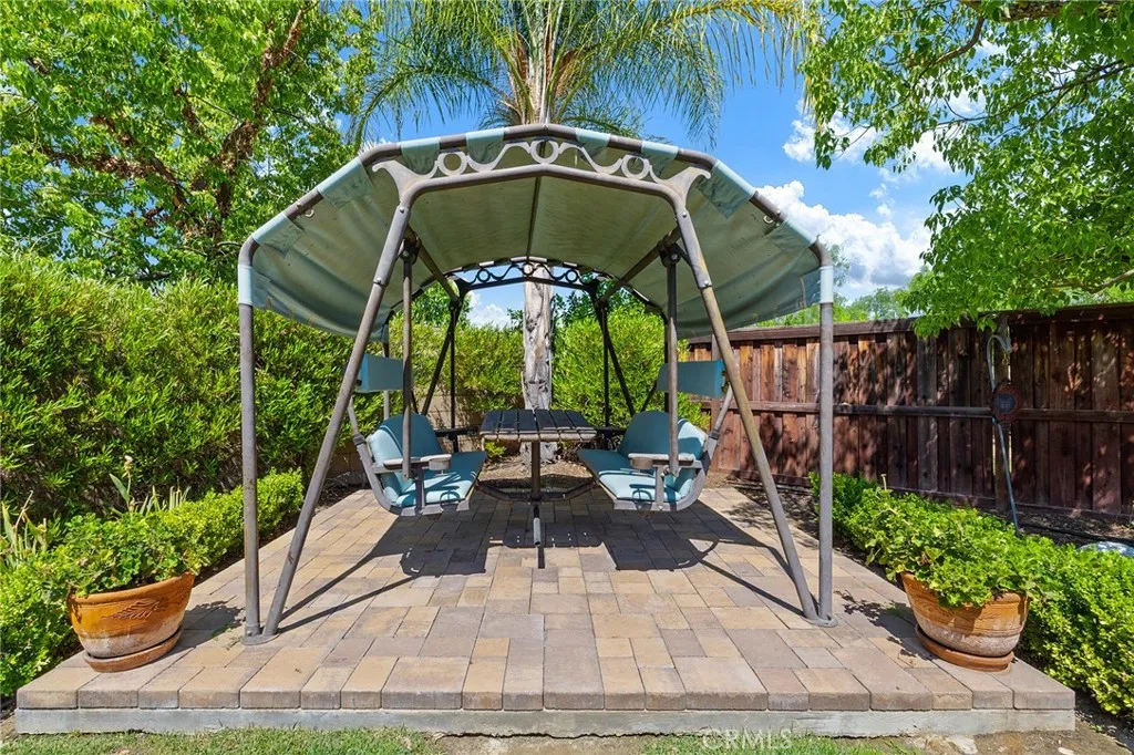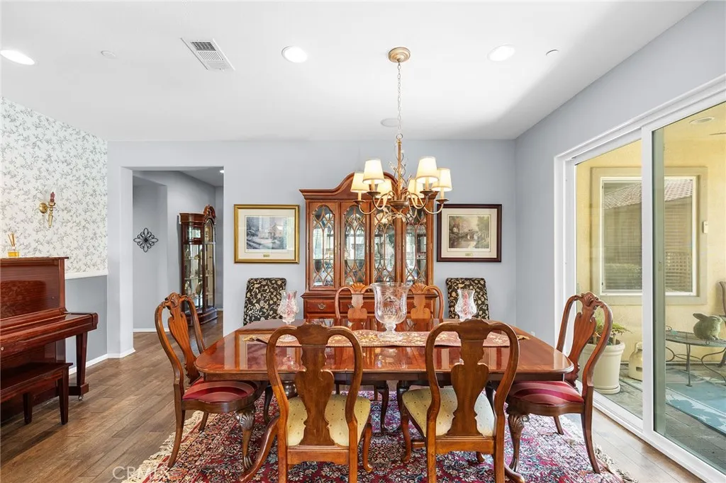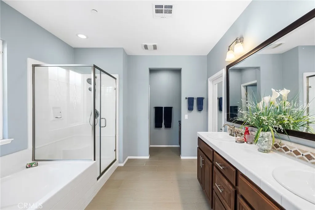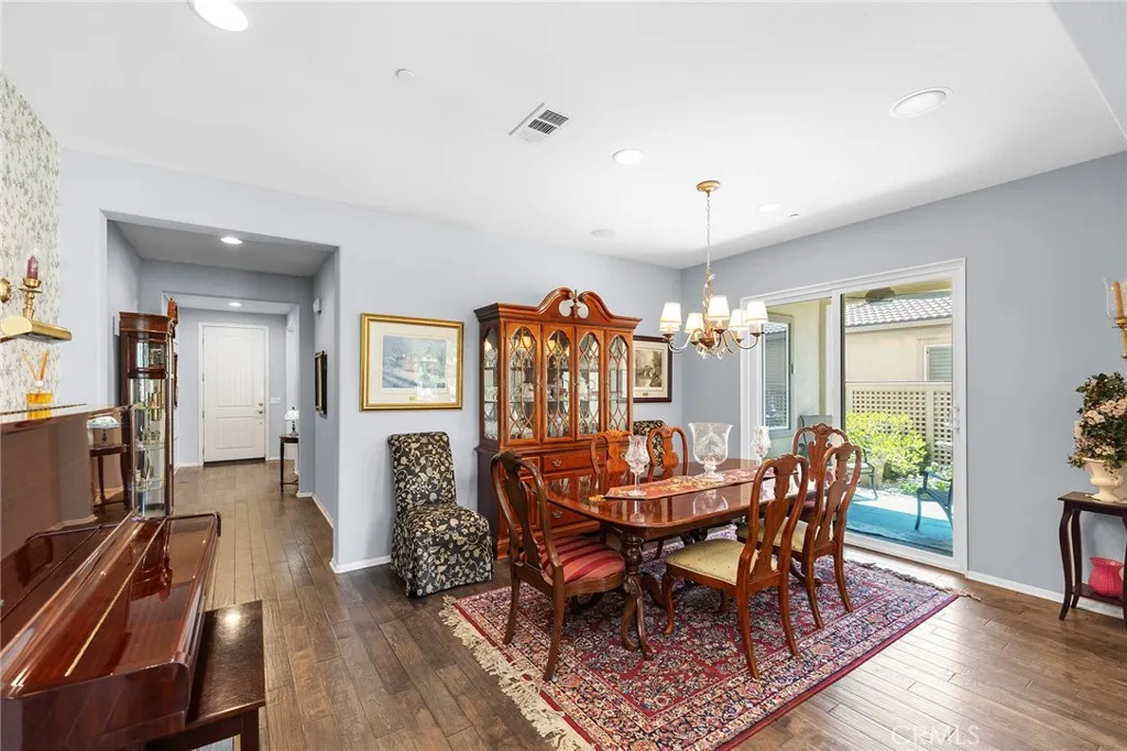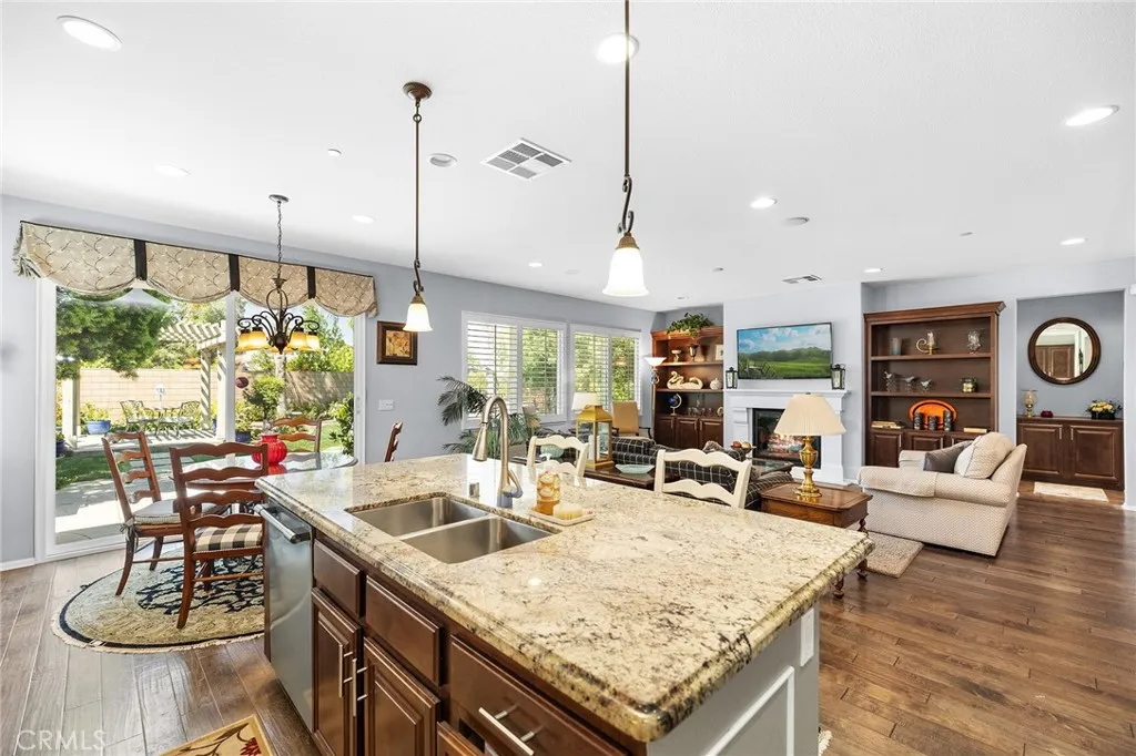 Discover this stunning formal model home nestled in the prestigious Heritage Lakes community of Menifee, where luxury meets comfort in every detail. This exquisite single-story residence boasts 3 spacious bedrooms plus a versatile den, thoughtfully designed with over 2,300 square feet of meticulously planned living space. The intelligent floor plan strategically positions the secondary bedrooms and master suite at opposite ends of the home, ensuring optimal privacy and tranquility for all occupants. The impressive 3-car tandem garage provides abundant storage and parking, while the interior showcases elegant engineered hardwood floors flowing seamlessly throughout the common areas, perfectly complemented by brand new plush carpeting in all bedrooms. The heart of the home features a magnificent family room anchored by a stunning fireplace flanked by beautiful built-in bookshelves on both sides, creating an atmosphere of sophistication and warmth. Premium plantation shutters grace every window, offering both style and privacy, while integrated speakers throughout the home provide the perfect soundtrack for daily living and entertaining. The exterior commands attention with beautiful curb appeal that reflects the pride of ownership evident in every corner of this immaculate property. Step into the backyard oasis where beautifully landscaped grounds create a peaceful retreat perfect for relaxation and outdoor gatherings. Comfort is assured year-round with a brand new compressor and evaporator unit featuring dual zone HVAC control, allowing personalized climate management throug