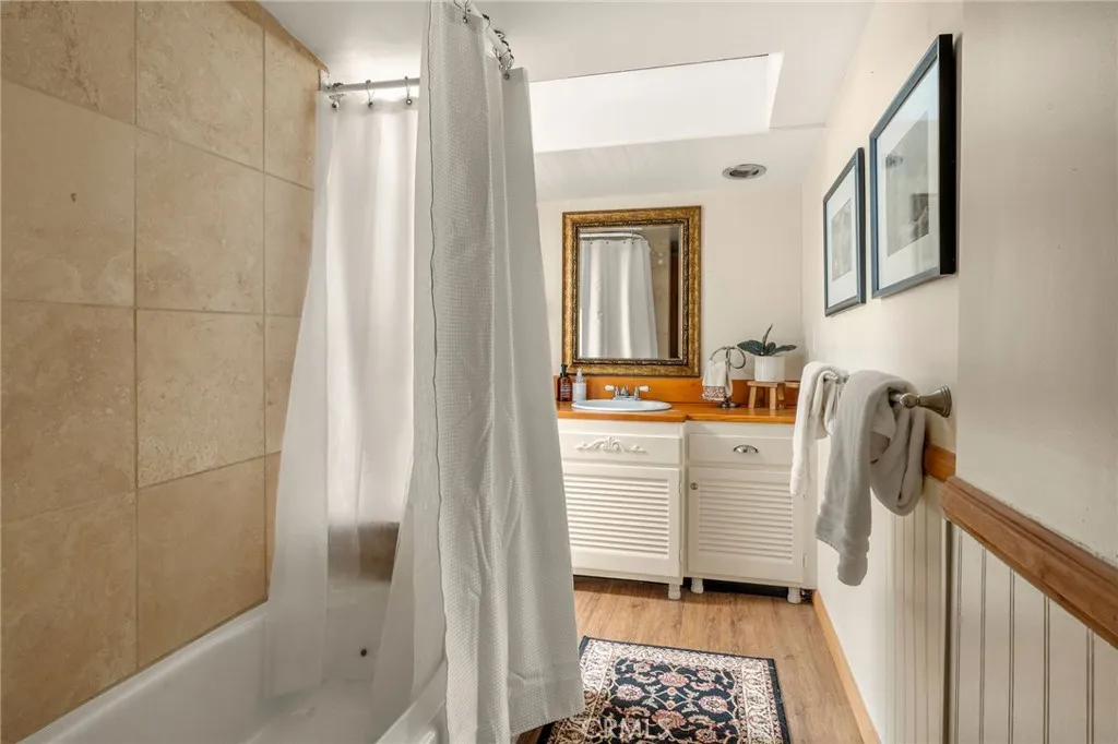 A storybook cottage nestled in the heart of Skyforest, offering timeless rustic charm amongst towering pines and majestic cedars. This 3-bedroom, 2-bathroom retreat sits in a peaceful, wooded setting with unmatched privacy. Step into the warm and inviting living room featuring a dramatic vaulted ceiling with exposed log accent beams, skylights that flood the space with natural light, and a cozy wood burning stone fireplace. Savor the beautiful views of the forest from the kitchen's large picture windows. The entry level boasts two well appointed bedrooms, of which one has separate entry to the back yard, a full bathroom and laundry room. Upstairs is the primary suite with a Juliette balcony that overlooks the living room below and an ensuite, full bathroom. Enjoy outdoor living year-round on the composite deck, ideal for relaxing or entertaining under the trees. A detached garage provides great storage or workshop potential, and a backup generator offers peace of mind during mountain weather. Other upgrades include dual pane Milgard windows, a mini-split air conditioner in the primary bedroom,a newer furnace and the home was re-piped in 2020. This is a rare opportunity to own a piece of Skyforest magic where rustic charm meets modern comfort in a truly private, forested setting.