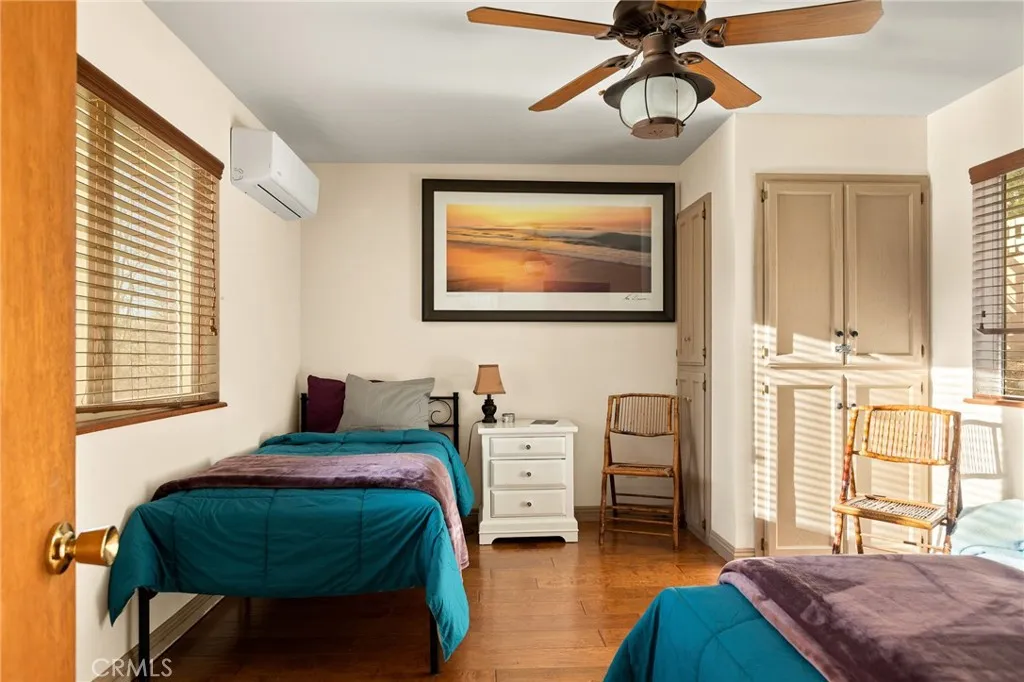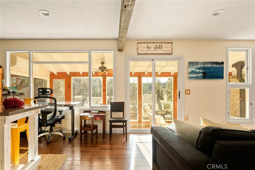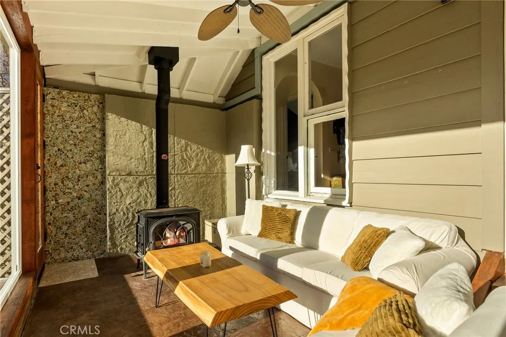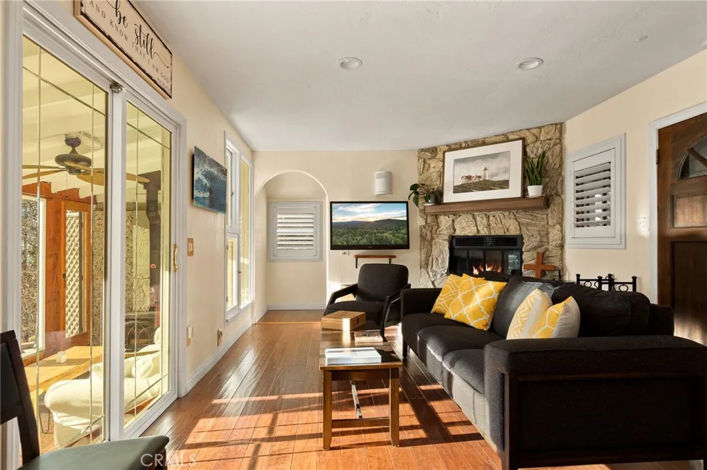 Nestled in the heart of Running Springs, this unique property is designed for those who crave tranquility and modern mountain living. Offering 3 bedrooms, 2 bathrooms, sunroom, three fireplaces, AC and amazing views! Step into the main level with primary bedroom, three-quarter bathroom, and open-concept living area with fireplace that flows seamlessly into the kitchen. The enclosed sunroom with wood burning stove is a standout feature on the main level, bathing the home in natural light and offering panoramic views of the surrounding forest, where towering pines and wildlife create a breathtaking backdrop. Upstairs you will find the additional two bedrooms, one of which has its own fireplace and custom built-in trundle bed. The second level also offers a full bathroom with laundry, and back deck with endless views. Outside, the large parking pad provides ample space for multiple vehicles making this home as practical as it is picturesque. Upgrades include new front retaining walls built in 2024, tankless electric hot water heater in 2022, and AC split units installed in 2020. Whether youre a weekend adventurer or seeking a full-time mountain sanctuary, this property delivers unmatched charm and functionality. Conveniently located just one street over from local shops and dining, 15 minutes to Lake Arrowhead, and 25 minutes to Big Bear or Highland via Hwy 18 and Hwy 330. Schedule your private tour today and experience the magic of mountain living!