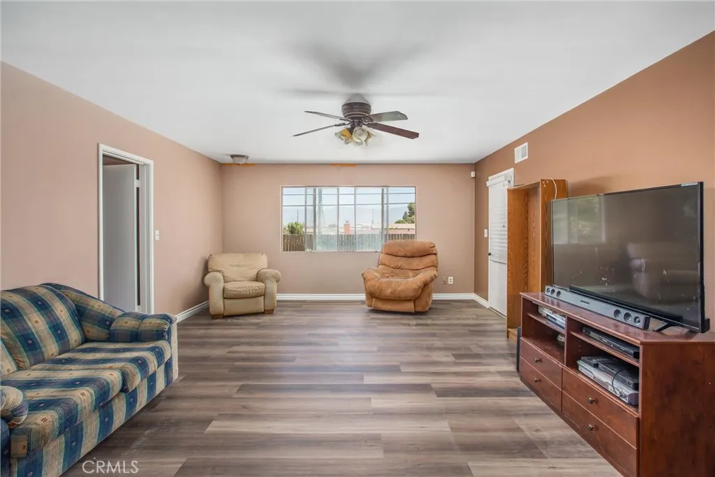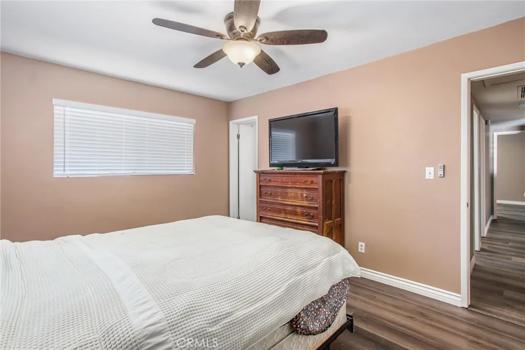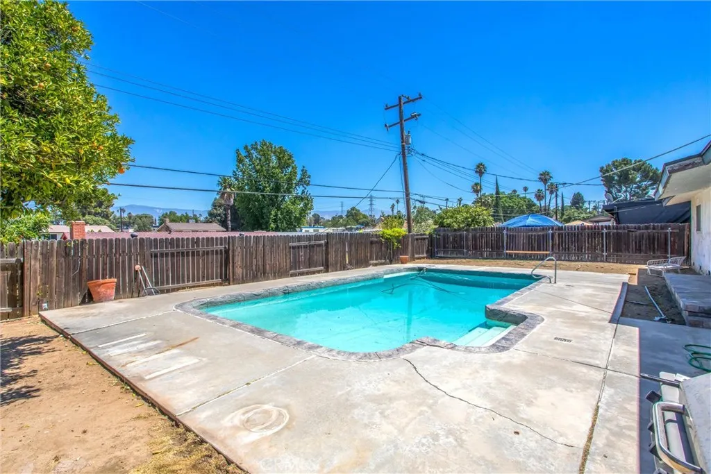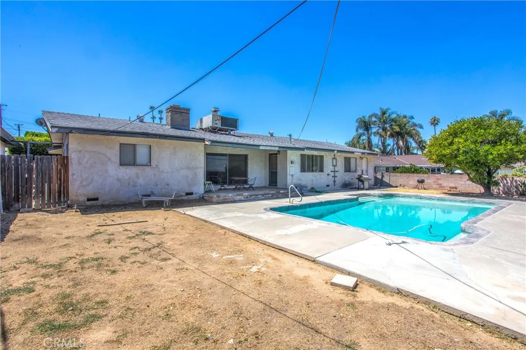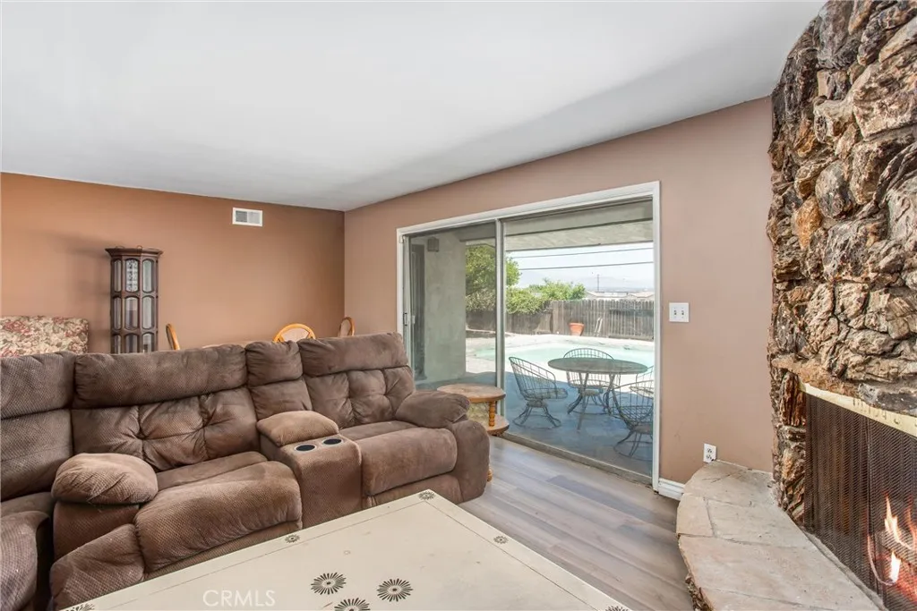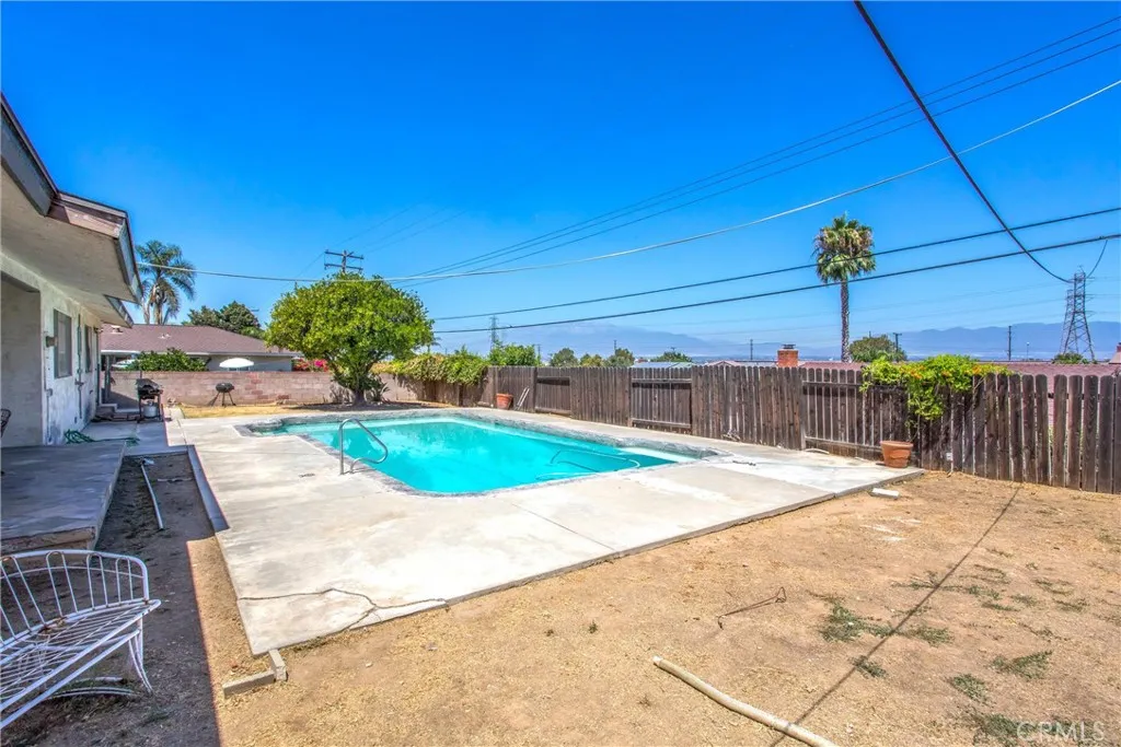 Blue Mountain bliss! Charm meets flexibility in one of Grand Terraces most sought-after midcentury neighborhoods! This single-level home boasts a unique dual-primary suite layout, offering options for multigenerational living or extended guest stays. Enjoy sweeping panoramic views of the valley and San Bernardino mountains from your private pool deck, and soak in serene Blue Mountain vistas from the oversized front yard. Inside, character and comfort await. The heart of the home features multiple living spaces, including a cozy living room anchored by a custom stone fireplace with raised hearth, vintage breezeblock accents, and abundant natural light through a large sliding glass door. The spacious adjacent family and dining room flows effortlessly into a corner kitchen with classic built-ins, dual ovens, and a warm, retro feel. On one side of the home, a secluded primary suite includes its own en suite bath plus private access to the garage and backyard. Down the opposite hallway, discover a second primary suite with its own full bath, along with two additional bedrooms that share a hall bath full of charming vintage character. Outside, the freshly resurfaced pool is fireworks-ready with front-row seats to citywide shows, plus plenty of space to customize the backyard to your taste. An attached two-car garage offers built-in shelving and loft storage. Additional highlights include fresh vinyl flooring throughout, ceiling fans, and updated light fixtures. Set in the heart of a peaceful, walkable neighborhood near top-rated schools, parks, hiking trails, and family-friendly
