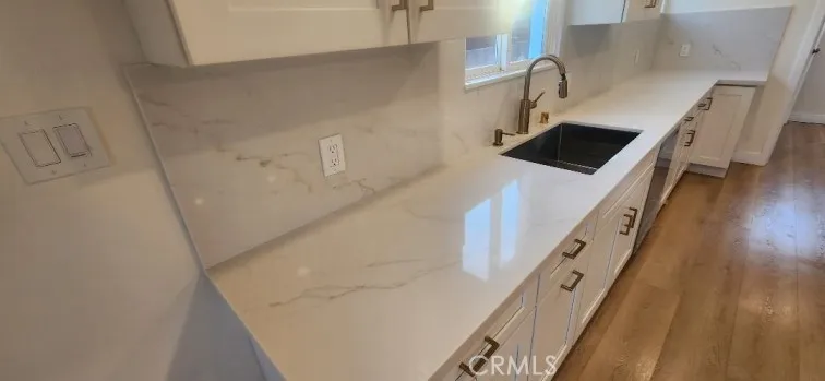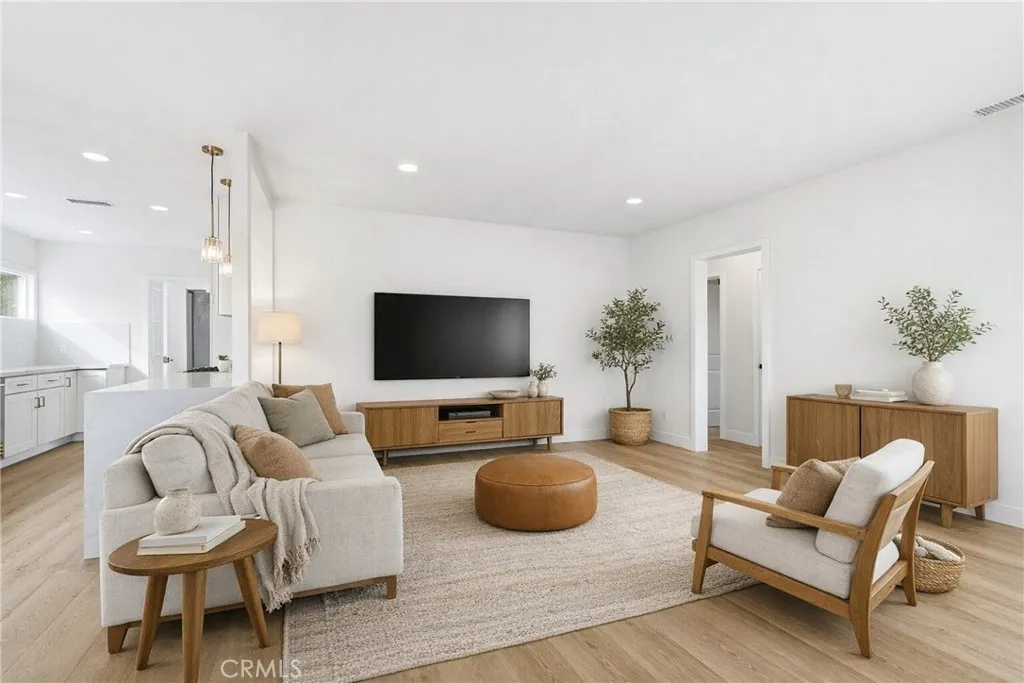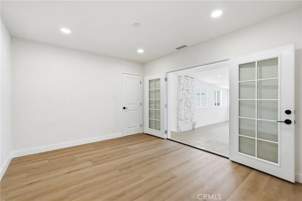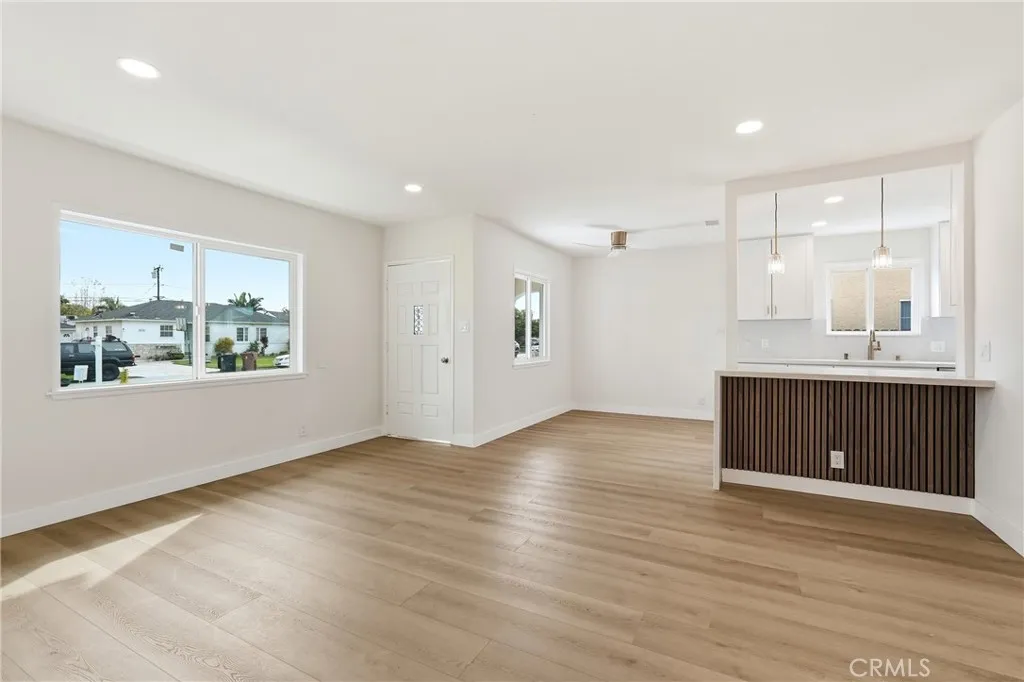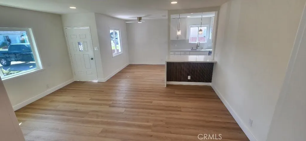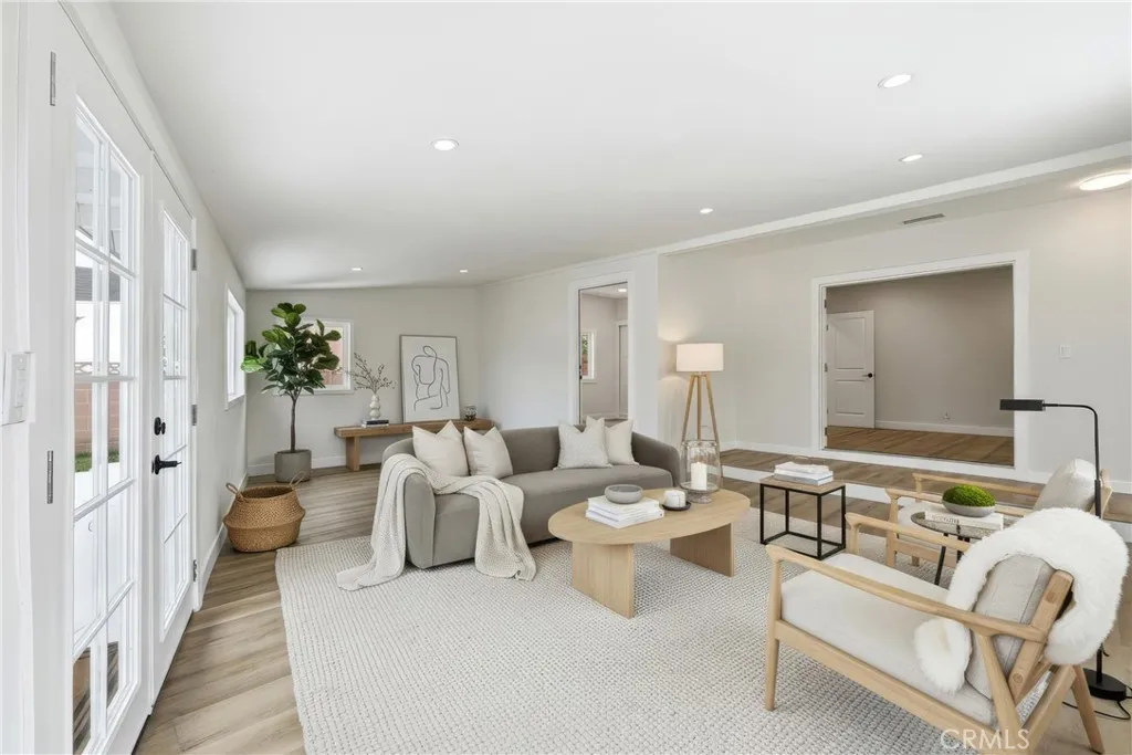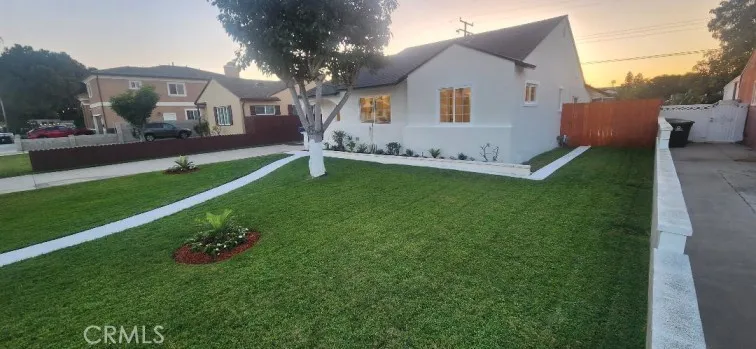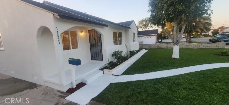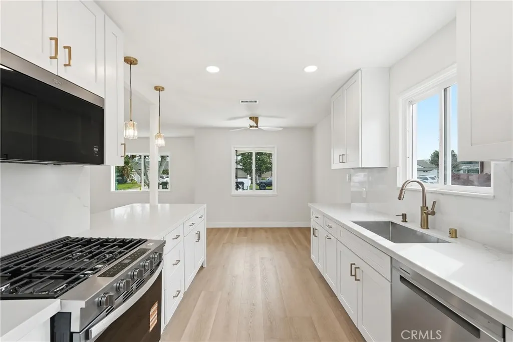 Garden Grove Remodeled Detached Single Level 3 Bedrooms / 1.5 Bath Home close to Disneyland . Remodeled Throughout with ; New Hardwood Style Vinyl Plank Flooring , Freshly Painted in two tone White interior & exterior , Open kitchen has New Stainless Whirlpool appliances ( slide in gas range oven stove , dishwasher , microwave , double door refrigerator with ice maker & water dispenser ) / New White Quartz counters with Backsplashes up to the Upper cabinets / New solid wood White Shaker Cabinetry with Spice Rack pull out , Soft Close features / Bar Area has Pendant Lights & Wood Paneling , Dining Area has a new Ceiling Fan , Stunning Bath has a New Walk in Tiled shower with Frameless Shower Door / Wood Paneling / New LED mirror with light , Recessed lighting throughout , Vinyl windows and new French Doors , New Central ac & heat , new raised panel interior doors and moldings , detached double garage , Close to Disneyland & Convention Center . Square footage includes unpermitted rear addition that can be used as a sun room or bonus room , sun room size is aprx 430 to 520 sq ft / sq ft on legal is around 1100 , city has documents on the addition / see supplements , Laundry room has full size hook ups , New Landscaping with automatic sprinklers